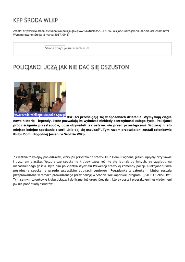 KPP ŚRODA WLKP Źródło: http://www.sroda-wielkopolska.policja.gov.pl/w25/aktualnosci/162156,Policjanci-ucza-jak-nie-dac-sie-oszustom.html Wygenerowano: Środa, 8 marca 2017, 09:37 Strona znajduje się w archiwum. POLICJANCI UCZĄ JAK NIE DAĆ SIĘ OSZUSTOM Oszuści prześcigają się w sposobach działania. Wymyślają ciągle nowe historie – legendy, które pozwalają im wyłudzać niekiedy oszczędności całego życia. Policjanci prócz ścigania przestępców, uczą obywateli jak ustrzec się przed przestępcami. Wczoraj miało miejsce kolejne spotkanie z serii „Nie daj się oszukać”. Tym razem przeszkoleni zostali członkowie Klubu Domu Pogodnej Jesieni w Środzie Wlkp. 7 kwietnia to kolejny poniedziałek, który jak przystało na średzki Klub Domu Pogodnej Jesieni upłynął przy kawie i pysznym ciastku. Wczorajsze spotkanie klubowiczów różniło się jednak od innych, ze względu na niecodziennego gościa. Była nim policjantka Wydziału Prewencji średzkiej komendy policji. Funkcjonariuszka poświęciła spotkanie przede wszystkim edukacji seniorów. Pogadanka z członkami klubu została przeprowadzona w ramach prowadzonego przez policję w Środzie Wielkopolskiej programu „STOP OSZUSTOM”. Tym samym członkowie klubu dołączyli do licznej już grupy średzian, którzy zostali przeszkoleni i uświadomieni jak nie paść ofiarą oszustów. Szkolenie niesamowicie zainteresowało zebranych, bo podczas wykładu panowała absolutna cisza. A jak wskazywali opiekunowie Domu Pogodnej Jesieni jest to na co dzień bardzo trudne do osiągnięcia. Miejmy nadzieję, że poznane sposoby oszustw, rady dotyczące niewpuszczania nieznanych osób do domu, nieufania obcym i zachowania dużej ostrożności przy rozmowach telefonicznych pozostaną długo w pamięci. Przestrogi policjantki dotyczyły również ostrożności przy podpisywaniu wszelakich umów, które nie zawsze są korzystne dla klienta. Spotkanie zakończyły oklaski dla prelegentki i zaproszenie do podobnych szkoleń w przyszłości. Już teraz policjanci mają w zanadrzu kolejny temat związany z poprawą bezpieczeństwa seniorów. Będzie on poświęcony bezpieczeństwu pieszych. Nie wykluczone, że edukacyjne spotkanie odbędzie się już w maju. Dla przypomnienia przedstawiany kilka najważniejszych rad. JAK SIÊ BRONIĆ PRZED OSZUSTAMI: ● ● ● ● ● Nie udzielaj żadnych informacji na swój temat, np.: rodziny, pieniędzy, dochodów, kosztowności, pinu do karty bankomatowej, itp. Nie zawieraj żadnych transakcji, nie podpisuj umów, nie wpłacaj zaliczek domokrążcom. Nie dawaj pieniędzy obcym, które telefonicznie podają się za krewnych. Nie wierz w niecodzienne problemy, sytuacje losowe. Wszystkie podawane w takich okolicznościach konta bankowe należy weryfikować. Nie korzystaj z super okazji. Bierz pod uwagę realną wartość przedmiotu. Pamiętaj - nie ma nic za darmo. Nie podawaj nigdy przez telefon numerów kont, pinów, peselu, czy innych numerów identyfikacyjnych, nawet osobom podającym się za funkcjonariuszy czy urzędników państwowych. KIM JEST OSZUST – ROZPOZNAJ PRZESTÊPCÊ: ● ● ● Nie daj się zwieść pozorom. Oszust pracuje nad wizerunkiem osoby zaufanej. To często kobieta, może być dziecko. Oszust posiada wiarygodne akcesoria: pieczątkę, wizytówkę, identyfikator, torbę montera, itp. Bazą jego działania są emocje: niesamowita okazja finansowa , nagła sytuacja losowa, szybkość zawieranej transakcji, podpisania umowy, trwania promocji. Jeśli podejrzewasz, że oszust krąży po Twoim osiedlu lub w bloku POINFORMUJ POLICJÊ pod bezpłatnym numerem telefonu 997. Gwarantujemy anonimowość. Ocena: 0/5 (0) Tweetnij