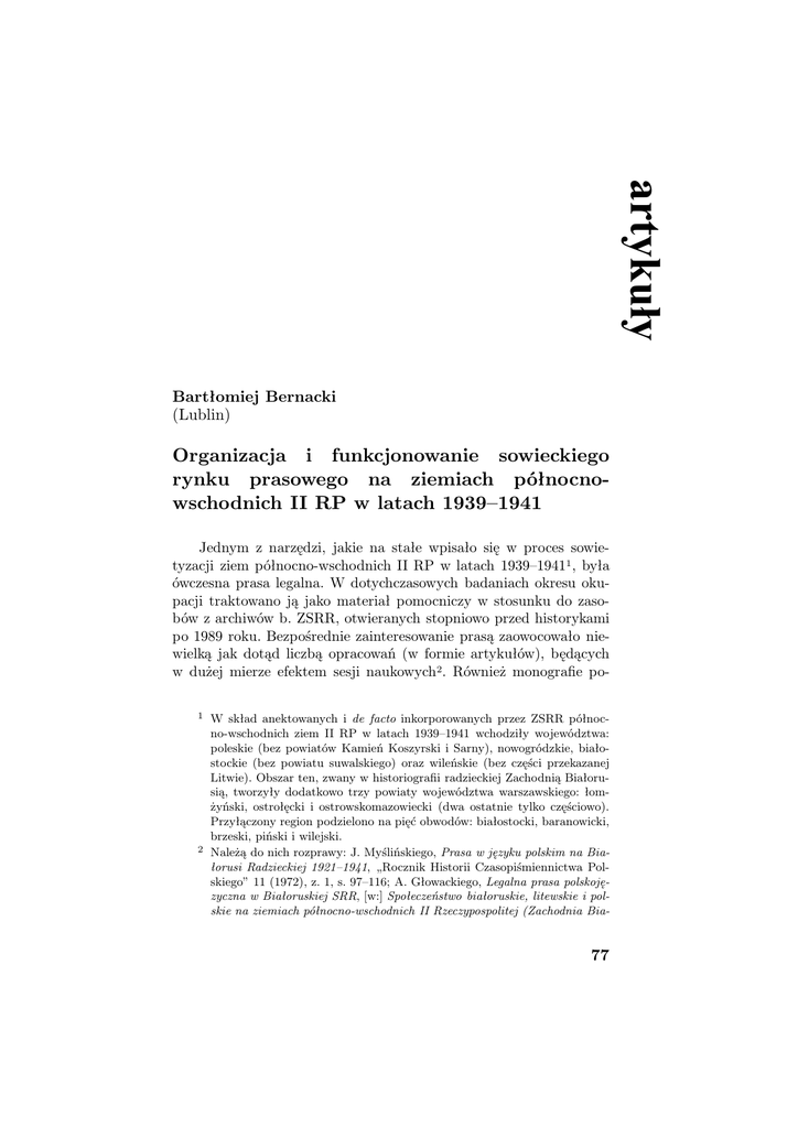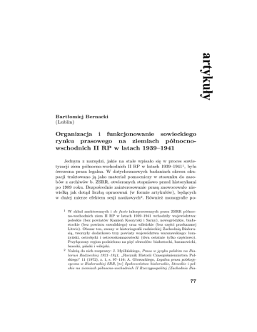 artyku³y Bartłomiej Bernacki (Lublin) Organizacja i funkcjonowanie sowieckiego rynku prasowego na ziemiach północnowschodnich II RP w latach 1939–1941 Jednym z narzędzi, jakie na stałe wpisało się w proces sowietyzacji ziem północno-wschodnich II RP w latach 1939–19411 , była ówczesna prasa legalna. W dotychczasowych badaniach okresu okupacji traktowano ją jako materiał pomocniczy w stosunku do zasobów z archiwów b. ZSRR, otwieranych stopniowo przed historykami po 1989 roku. Bezpośrednie zainteresowanie prasą zaowocowało niewielką jak dotąd liczbą opracowań (w formie artykułów), będących w dużej mierze efektem sesji naukowych2. Również monografie po1 2 W skład anektowanych i de facto inkorporowanych przez ZSRR północno-wschodnich ziem II RP w latach 1939–1941 wchodziły województwa: poleskie (bez powiatów Kamień Koszyrski i Sarny), nowogródzkie, białostockie (bez powiatu suwalskiego) oraz wileńskie (bez części przekazanej Litwie). Obszar ten, zwany w historiografii radzieckiej Zachodnią Białorusią, tworzyły dodatkowo trzy powiaty województwa warszawskiego: łomżyński, ostrołęcki i ostrowskomazowiecki (dwa ostatnie tylko częściowo). Przyłączony region podzielono na pięć obwodów: białostocki, baranowicki, brzeski, piński i wilejski. Należą do nich rozprawy: J. Myślińskiego, Prasa w języku polskim na Białorusi Radzieckiej 1921–1941, „Rocznik Historii Czasopiśmiennictwa Polskiego” 11 (1972), z. 1, s. 97–116; A. Głowackiego, Legalna prasa polskojęzyczna w Białoruskiej SRR, [w:] Społeczeństwo białoruskie, litewskie i polskie na ziemiach północno-wschodnich II Rzeczypospolitej (Zachodnia Bia- 77 święcone wydarzeniom lat 1939–1941 w ograniczonym stopniu omawiają budowany przez instancje partyjne i komórki propagandowe sowiecki system prasowy oraz w niewielkim zakresie ukazują lokalizację poszczególnych tytułów prasowych3. *** Z chwilą zakończenia kampanii wrześniowej uległ likwidacji rynek prasowy II Rzeczypospolitej. Ostatnie dzienniki ukazywały się jeszcze w trakcie walk, często do chwili zajęcia przez armię sowiecką ważniejszych ośrodków wydawniczych4. W krótkim czasie okupant zastąpił dotychczasowe gazety i czasopisma własnymi organami, wydawanymi w języku polskim, rosyjskim oraz białoruskim. Zasięg ich oddziaływania – podobnie jak na obszarze całego ZSRR – związany był ściśle z podziałem administracyjnym. Stąd też rozpowszechniano prasę centralną – dostępną w każdej republice, obwodzie i rejonie; prasę republikańską – wydawaną w poszczególnych republikach związkowych; prasę obwodową – dostępną dla mieszkańców jednego obwodu i podległych mu rejonów oraz prasę rejonową – rozprowadzaną już tylko na terenie rejonu. Władzom na Kremlu zależało na jak najszybszym dotarciu do mieszkańców wschodniej Polski z bolszewicką propagandą, jeszcze przed planowanymi wyborami do Zgromadzeń Ludowych Zachodniej Białorusi i Ukrainy. „W pierwszych dniach władzy bolszewickiej – wspominał wydarzenia z przełomu września i października 1939 roku L. Ofengejm – zaczęły wychodzić gazety, które w zrozumiałym języku dla szerokich mas wyjaśniały i popularyzowały zadania stojące 3 4 78 łoruś i Litwa Wschodnia) w latach 1939–1941, red. T. Strzembosz, Warszawa 1995, s. 214–232 oraz W. Śleszyńskiego, Prasa sowiecka w obwodzie białostockim w latach 1939–1941, [w:] Radziecka agresja 17 września 1939 r. i jej skutki dla mieszkańców ziem północno-wschodnich II Rzeczypospolitej, red. M. Gnatowski, Białystok 2000, s. 207–230. A. Głowacki, Sowieci wobec Polaków na ziemiach wschodnich II Rzeczypospolitej w latach 1939–1941, Łódź 1997; W. Śleszyński, Okupacja sowiecka na Białostocczyźnie 1939–1941. Propaganda i indoktrynacja, Białystok 2001; D. Karolkiewicz, „Wolna Łomża”. Monografia sowieckiej gadzinówki, Łomża 2002. Tak było np. we Lwowie, gdzie w dniu kapitulacji miasta ukazał się ostatni numer „Dziennika Polskiego”. Zob.: A. Cieślikowa, Prasa okupowanego Lwowa, Warszawa 1997, s. 31; B. Gogol, Czerwony Sztandar. Rzecz o sowietyzacji ziem Małopolski Wschodniej. Wrzesień 1939 – czerwiec 1941, Gdańsk 2000, s. 14. przed ludem”5. Z okazji Dnia Prasy (5 maja) podkreślano sprawne wprowadzenie do obiegu nowych tytułów przeznaczonych dla mieszkańców zachodnich obwodów. Określając zadania stojące przed rodzącym się rynkiem prasowym postulowano, aby powstające redakcje – obok własnych, wewnętrznych inicjatyw – w codziennej pracy odwoływały się do „skarbnicy przepięknej rewolucyjnej tradycji prasy bolszewickiej”6. 16 września 1939 roku Rada Wojenna Frontu Białoruskiego w „Dyrektywie nr 1” przyjęła m.in. podstawowe założenia dotyczące wydawania prasy na zajmowanych przez Armię Czerwoną obszarach. W punkcie drugim dyrektywy nakazywano, aby po wkroczeniu do większych miejscowości, znajdujących się na trasie „wyzwoleńczego marszu”, zorganizować drukarnię i przystąpić do wydawania gazety7 . Wykonanie tego zadania powierzono Wydziałom Politycznym Armii Czerwonej oraz – skierowanym w tym celu na Zachodnią Białoruś – przyszłym redaktorom gazet rejonowych. Ogółem ze wschodnich obwodów Białorusi skierowano do pracy w redakcjach pism rejonowych 100 redaktorów naczelnych8. Dzień wcześniej Ł. Beria w specjalnej dyrektywie określającej zadania NKWD na zajmowanym terenie nakazywał natychmiastowe zajęcie wszelkich środków łączności (telefonu, telegrafu, radiostacji i radiowęzłów), które mogłyby być wykorzystane przez Wydziały Propagandy i Agitacji. Szcze5 6 7 8 L. Ofengejm, Prenumerata prasy na 1941 rok, „Sztandar Wolności” (Mińsk), nr 55 z 7 XII 1940, s. 3. Na łamach „Wolnej Pracy” A. Jermołajewa twierdziła, że od „pierwszych dni chciwie chwytano każde drukowane słowo prawdy o Związku Radzieckim”. Zob.: „Wol
