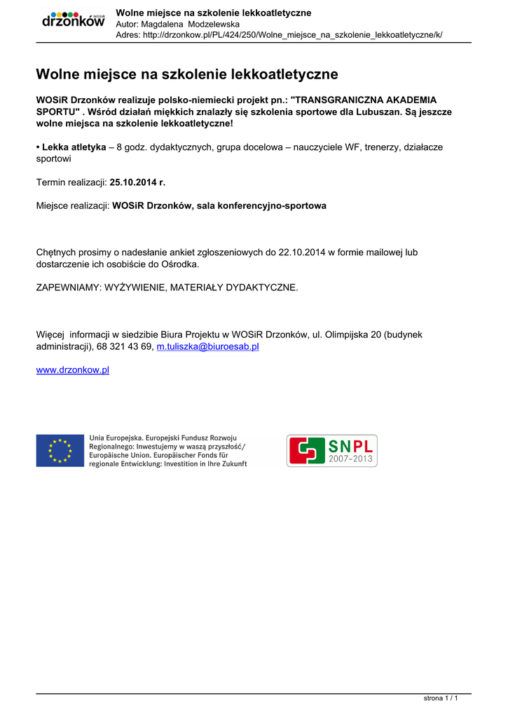 Wolne miejsce na szkolenie lekkoatletyczne Autor: Magdalena Modzelewska Adres: http://drzonkow.pl/PL/424/250/Wolne_miejsce_na_szkolenie_lekkoatletyczne/k/ Wolne miejsce na szkolenie lekkoatletyczne WOSiR Drzonków realizuje polsko-niemiecki projekt pn.: "TRANSGRANICZNA AKADEMIA SPORTU" . Wśród działań miękkich znalazły się szkolenia sportowe dla Lubuszan. Są jeszcze wolne miejsca na szkolenie lekkoatletyczne! • Lekka atletyka – 8 godz. dydaktycznych, grupa docelowa – nauczyciele WF, trenerzy, działacze sportowi Termin realizacji: 25.10.2014 r. Miejsce realizacji: WOSiR Drzonków, sala konferencyjno-sportowa Chętnych prosimy o nadesłanie ankiet zgłoszeniowych do 22.10.2014 w formie mailowej lub dostarczenie ich osobiście do Ośrodka. ZAPEWNIAMY: WYŻYWIENIE, MATERIAŁY DYDAKTYCZNE. Więcej informacji w siedzibie Biura Projektu w WOSiR Drzonków, ul. Olimpijska 20 (budynek administracji), 68 321 43 69, [email protected] www.drzonkow.pl strona 1 / 1 Powered by TCPDF (www.tcpdf.org)