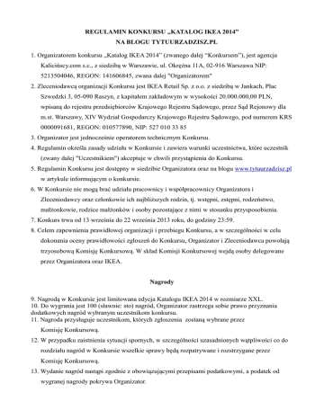 REGULAMIN KONKURSU „KATALOG IKEA 2014” NA BLOGU TYTUURZADZISZ.PL 1. Organizatorem konkursu „Katalog IKEA 2014” (zwanego dalej “Konkursem”), jest agencja Kalicińscy.com s.c., z siedzibą w Warszawie, ul. Okrężna 11A, 02-916 Warszawa NIP: 5213504046, REGON: 141606845, zwana dalej "Organizatorem" 2. Zleceniodawcą organizacji Konkursu jest IKEA Retail Sp. z o.o. z siedzibą w Jankach, Plac Szwedzki 3, 05-090 Raszyn, z kapitałem zakładowym w wysokości 20.000.000,00 PLN, wpisaną do rejestru przedsiębiorców Krajowego Rejestru Sądowego, przez Sąd Rejonowy dla m.st. Warszawy, XIV Wydział Gospodarczy Krajowego Rejestru Sądowego, pod numerem KRS 0000091681, REGON: 010577890, NIP: 527 010 33 85 3. Organizator jest jednocześnie operatorem technicznym Konkursu. 4. Regulamin określa zasady udziału w Konkursie i zawiera warunki uczestnictwa, które uczestnik (zwany dalej "Uczestnikiem") akceptuje w chwili przystąpienia do Konkursu. 5. Regulamin Konkursu jest dostępny w siedzibie Organizatora oraz na blogu www.tytuurzadzisz.pl w artykule informującym o konkursie. 6. W Konkursie nie mogą brać udziału pracownicy i współpracownicy Organizatora i Zleceniodawcy oraz członkowie ich najbliższych rodzin, tj. wstępni, zstępni, rodzeństwo, małżonkowie, rodzice małżonków i osoby pozostające z nimi w stosunku przysposobienia. 7. Konkurs trwa od 13 września do 22 września 2013 roku, do godziny 23:59. 8. Celem zapewnienia prawidłowej organizacji i przebiegu Konkursu, a w szczególności w celu dokonania oceny prawidłowości zgłoszeń do Konkursu, Organizator i Zleceniodawca powołają trzyosobową Komisję Konkursową. W skład Komisji Konkursowej wejdą osoby delegowane przez Organizatora oraz IKEA. Nagrody 9. Nagrodą w Konkursie jest limitowana edycja Katalogu IKEA 2014 w rozmiarze XXL. 10. Do wygrania jest 100 (sławnie: sto) nagród, Organizator zastrzega sobie prawo przyznania dodatkowych nagród wybranym uczestnikom konkursu. 11. Nagroda przysługuje uczestnikom, których zgłoszenia zostaną wybrane przez Komisję Konkursową. 12. W przypadku zaistnienia sytuacji spornych, w szczególności uzasadnionych wątpliwości co do rozdziału nagród w Konkursie wszelkie sprawy będą rozpatrywane i rozstrzygane przez Komisję Konkursową. 13. Wydanie nagród nastąpi zgodnie z obowiązującymi przepisami podatkowymi, a podatek od wygranej nagrody pokrywa Organizator. 14. Zwycięzcy Konkursu nie przysługuje roszczenie o wypłatę wartości nagrody w gotówce. 15. Zwycięzca Konkursu nie ma możliwości zamiany nagrody. 16. Zwycięzca nie może przenieść prawa do nagrody na inne osoby. 17. Ze zwycięzcami Organizator skontaktuje się nie później niż do 2 października 2013 roku. Warunki uczestnictwa 18. Uczestnikiem Konkursu może być: osoba fizyczna mająca ukończone 18 lat, posiadająca obywatelstwo polskie, posiadająca pełną zdolność do czynności prawnych, konsument w myśl art. 221 Kodeksu Cywilnego, oraz posiadająca miejsce stałego zamieszkania w Polsce, 19. Warunkiem przystąpienia do Konkursu jest skorzystanie z formularza na stronie http://tytuurzadzisz.pl/rozdajemy-katalogi-ikea-2014-xxl-w-konkursie/ i wysłanie uzasadnienia dlaczego to Uczestnik powinien nabyć prawo do nagrody. 20. Uczestnik przystępując do Konkursu wyraża zgodę na opublikowanie swojego zgłoszenia do konkursu, jak też jego modyfikacji i wykorzystania na blogu www.tytuurzadzisz.pl 21. Administratorem danych jest Organizator - Agencja Kalicińscy.com s.c., z siedzibą w Warszawie, ul. Okrężna 11A, 02-916 Warszawa. Organizator będzie przetwarzać dane osobowe Uczestników w celach związanych z organizacją Konkursu, sprawozdawczością podatkową i księgową, w celu zamieszczenia listy Zwycięzców. 22. Dane Uczestników przetwarzane będą zgodnie z postanowieniami ustawy o ochronie danych osobowych (Dz. U. z 2002 r., nr 101, poz. 926 z pózn. zm.). 23. Realizując zadanie Konkursu uczestnik tym samym oświadcza, że zapoznał się z treścią niniejszego Regulaminu, wyraża zgodę na jego treść oraz akceptuje jego warunki. 24. Uczestnictwo w Konkursie polega na spełnieniu oznaczonych w niniejszym Regulaminie zadań, z zastrzeżeniem, iż w ramach ich realizacji Uczestnicy mają obowiązek przestrzegania wszystkich obowiązujących przepisów prawa oraz niniejszego Regulaminu. Zadania Uczestnika Konkursu 25. Uczestnik realizuje zadanie Konkursowe poprzez wypełnienie formularza na stronie http://tytuurzadzisz.pl/rozdajemy-katalogi-ikea-2014-xxl-w-konkursie/ i przesłanie za jego pomocą zgłoszenia konkursowego. 26. Zadaniem konkursowym Uczestnika jest napisanie uzasadnienia dlaczego Komisja Konkursowa powinna przyznać użytkownikowi nagrodę. 29. Wypełnienie formularza konkursowego jest równoznaczne ze zgłoszeniem Uczestnika do Konkursu. 30. Z laureatami Konkursu Organizator skontaktuje się nie później niż do 2 października 2013 r. w celu ustalenia danych potrzebnych w celu przekazania nagrody Odbiór nagród 31. Uczestnik Konkursu, któremu przysługuje nagroda obowiązany jest przekazać Organizatorowi swoje dane teleadresowe w postaci: imienia i nazwiska, adresu wysyłki oraz numeru telefonu komórkowego, wysyłając je w wiadomość e-mail na adres [email protected]. 32. Uczestnik Konkursu, któremu przysługuje nagroda zobowiązany jest przekazać swoje dane teleadresowe w terminie do 11 października 2013. 33. Wysyłka nagród nastąpi nie później niż 18 października 2013. 33. W przypadku jeśli Uczestnik Konkursu, któremu przysługuje nagroda nie prześle wymaganych danych teleadresowych w terminie określonym w punkcie 32. niniejszego regulaminu, nagroda przepada w takiej sytuacji na rzecz IKEA i pozostaje w jej gestii. 34. Organizator nie ponosi odpowiedzialności za zmianę miejsca zamieszkania lub podanego przez Uczestnika adresu do korespondencji Uczestnika Konkursu lub zmianę innych danych – uniemożliwiającą przesłanie Uczestni