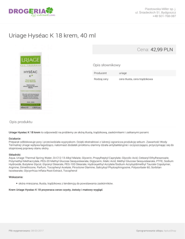 Piastowska Miller sp. j. ul. Śniadeckich 51, Bydgoszcz +48 501-768-087 Uriage Hyséac K 18 krem, 40 ml Cena: 42,99 PLN Opis słownikowy Producent uriage Rodzaj cery cera tłusta, cera trądzikowa Opis produktu Uriage Hyséac K 18 krem to odpowiedź na problemy ze skórą tłustą, trądzikową, zaskórnikami i zatkanymi porami. Działanie: Preparat odblokowuje pory i przeciwdziała wypryskom. Dzięki ekstraktowi z lukrecji ogranicza produkcję sebum. Zawartość Wody Termalnej Uriage wpływa łagodząco, natomiast dodatek piroktonu olaminy działa antybakteryjnie i oczyszczająco, przyczyniając się do stopniowej poprawy stanu skóry. Składniki: Aqua, Uriage Thermal Spring Water, Di-C12-13 Alkyl Malate, Glycerin, Propylheptyl Caprylate, Glycolic Acid, Cetearyl Ethylhexanoate, Polymethyl Methacrylate, PEG-20 Methyl Glucose Sesquistearate, Diglycerin, Malic Acid, Methyl Glucose Sesquistearate, PTFE, Sodium Hydroxide, Butylene Glycol, Glyceryl Stearate, PEG-100 Stearate, Hydroxyethyl Acrylate/Sodium Acryloyldimethyl Taurate Copolymer, Arginine, Dimethicone, Parfum, Tocopheryl Acetate, Piroctone Olamine, Salicyloyl Phytosphingosine, Polysorbate 60, Sorbitan Isostearate, Glycyrrhiza Inflata Root Extract, Tocopherol Wskazania: skóra mieszana, tłusta, trądzikowa z tendencją do powstawania zaskórników. Krem Uriage Hyséac K 18 przywraca cerze czysty, świeży i matowy wygląd. Plik wygenerowano: 08-03-2017 Powered by TCPDF (www.tcpdf.org) Oprogramowanie sklepu: AptusShop