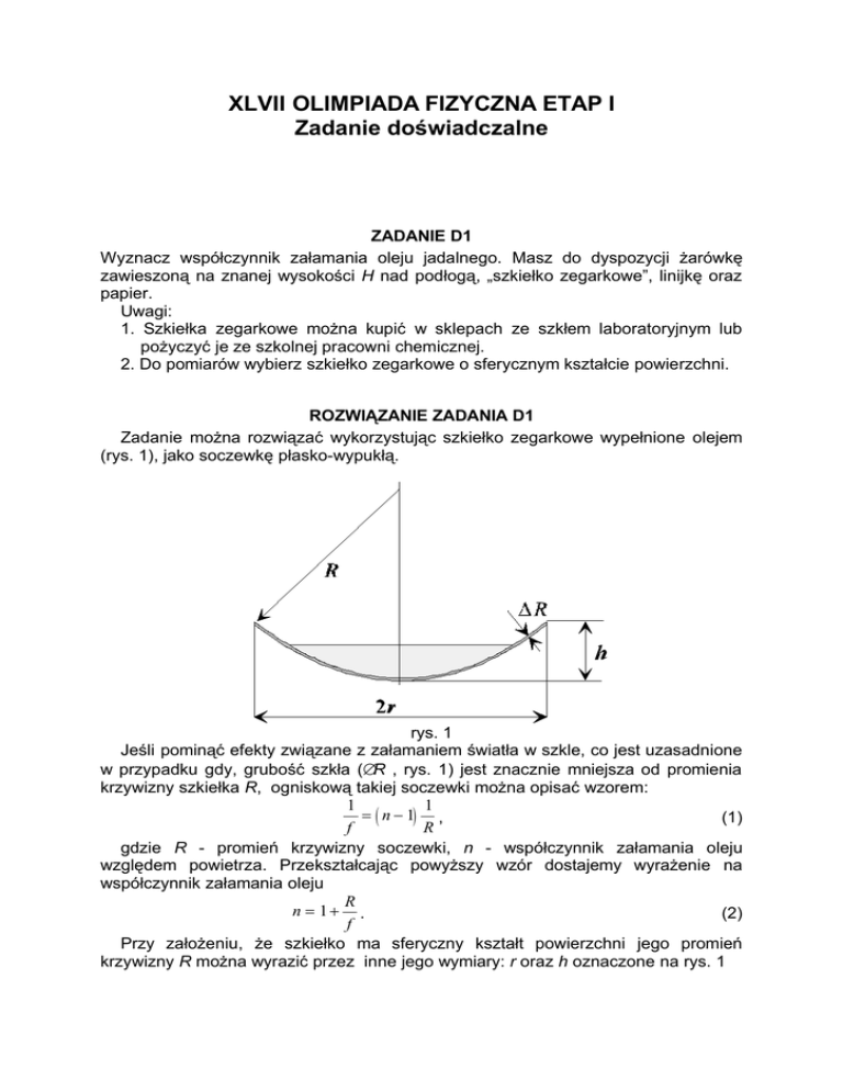 XLVII OLIMPIADA FIZYCZNA ETAP I Zadanie doświadczalne ZADANIE D1 Wyznacz współczynnik załamania oleju jadalnego. Masz do dyspozycji żarówkę zawieszoną na znanej wysokości H nad podłogą, „szkiełko zegarkowe”, linijkę oraz papier. Uwagi: 1. Szkiełka zegarkowe można kupić w sklepach ze szkłem laboratoryjnym lub pożyczyć je ze szkolnej pracowni chemicznej. 2. Do pomiarów wybierz szkiełko zegarkowe o sferycznym kształcie powierzchni. ROZWIĄZANIE ZADANIA D1 Zadanie można rozwiązać wykorzystując szkiełko zegarkowe wypełnione olejem (rys. 1), jako soczewkę płasko-wypukłą. rys. 1 Jeśli pominąć efekty związane z załamaniem światła w szkle, co jest uzasadnione w przypadku gdy, grubość szkła (∆R , rys. 1) jest znacznie mniejsza od promienia krzywizny szkiełka R, ogniskową takiej soczewki można opisać wzorem: 1 1 = ( n − 1) , (1) f R gdzie R - promień krzywizny soczewki, n - współczynnik załamania oleju względem powietrza. Przekształcając powyższy wzór dostajemy wyrażenie na współczynnik załamania oleju R n = 1+ . (2) f Przy założeniu, że szkiełko ma sferyczny kształt powierzchni jego promień krzywizny R można wyrazić przez inne jego wymiary: r oraz h oznaczone na rys. 1 r 2 + h2 . (3) . 2h Wysokość h oraz promień r szkiełka mierzymy linijką. Błąd pomiaru wynika w tym przypadku z dokładności skali linijki oraz niezerowej grubości ścianki szkiełka. Ogniskową f można wyznaczyć mierząc (linijką) wysokość y, dla której na papierze ułożonym na podłodze utworzy się ostry obraz żarówki, umieszczonej na wysokości H nad podłogą (rys. 2). Ponieważ w zestawie pomiarowym nie przewidziano statywu, to podczas pomiarów należy trzymać szkiełko i linijkę (opartą na podłodze) w rękach. R= Ze wzoru soczewkowego mamy: 1 1 1 = + (4) f H−y y skąd y f = y1 − (5) H Po podstawieniu wyrażeń (3) i (6) do wzoru (2), ostateczny wzór na współczynnik załamania oleju przybiera postać: r 2 + h2 H n = 1+ (6) 2hy H − y Pomiary odległości y, przy której na papierze ułożonym na podłodze tworzył się ostry obraz włókna żarówki, wykonano kilkakrotnie przy takiej grubości oleju na szkiełku, aby środkową część powierzchni cieczy można było uznać za płaską. Wyznaczona opisaną powyżej metodą wartość współczynnika załamania dla oleju słonecznikowego wyniosła n = 1,46±0,03 i zgadza się z wartością uzyskaną dokładniejszymi metodami. Inną metoda rozwiązania zadania polega na wykorzystaniu szkiełka zegarkowego w roli zwierciadła. Badając odbicie od szkiełka można wyznaczyć jego promień krzywizny. Po wypełnieniu go olejem otrzymuje się układ zwierciadła i soczewki z oleju. Mierząc jego ogniskową można wyznaczyć współczynnik załamania oleju. Punktacja 1. Pomysł wykorzystania oleju w szkiełku jako soczewki 2. Metoda wyznaczenia promienia krzywizny 3. Poprawny wzór na współczynnik załamania oleju do 5 pkt. do 2 pkt. do 3 pkt. 4. Pomiar promienia krzywizny szkiełka 5. Pomiar ogniskowej soczewki 6. Poprawny wynik końcowy wraz analizą błędów pomiarowych do 2 pkt. do 5 pkt. do 3 pkt. Źródło: Komitet Okręgowy Olimpiady Fizycznej w Szczecinie www.of.szc.pl