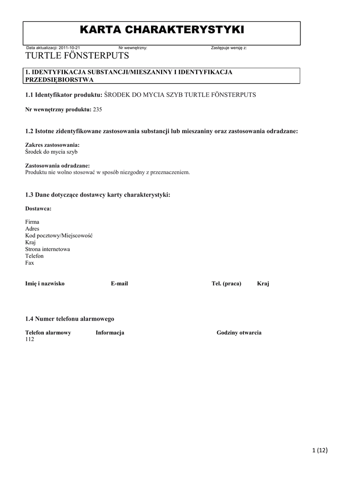 KARTA CHARAKTERYSTYKI Nr wewnętrzny: Data aktualizacji: 2011-10-21 Zastępuje wersję z: TURTLE FÖNSTERPUTS 1. IDENTYFIKACJA SUBSTANCJI/MIESZANINY I IDENTYFIKACJA PRZEDSIĘBIORSTWA 1.1 Identyfikator produktu: ŚRODEK DO MYCIA SZYB TURTLE FÖNSTERPUTS Nr wewnętrzny produktu: 235 1.2 Istotne zidentyfikowane zastosowania substancji lub mieszaniny oraz zastosowania odradzane: Zakres zastosowania: Środek do mycia szyb Zastosowania odradzane: Produktu nie wolno stosować w sposób niezgodny z przeznaczeniem. 1.3 Dane dotyczące dostawcy karty charakterystyki: Dostawca: Firma Adres Kod pocztowy/Miejscowość Kraj Strona internetowa Telefon Fax Imię i nazwisko E-mail Tel. (praca) Kraj 1.4 Numer telefonu alarmowego Telefon alarmowy 112 Informacja Godziny otwarcia 1 (12) KARTA CHARAKTERYSTYKI Data aktualizacji: 2011-10-21 Nr wewnętrzny: Zastępuje wersję z: TURTLE FÖNSTERPUTS 2. IDENTYFIKACJA ZAGROŻEŃ 2.1 Klasyfikacja substancji lub mieszaniny Xi, R36, R67 Informacje ogólne Pojemnik pod ciśnieniem: Chronić przed światłem słonecznym. Nie wystawiać na działanie temperatury przekraczającej 50°C. Nie przekłuwać i nie palić - nawet po zużyciu. Zagrożenie dla zdrowia Działa drażniąco na oczy. Pary mogą wywoływać uczucie senności i zawroty głowy. Ryzyko pożaru i wybuchu. Pojemnik pod ciśnieniem może wybuchnąć w przypadku pożaru. Zagrożenie dla środowiska Brak znanych zagrożeń. 2.2 Elementy oznakowania: Produkt drażniący Zwroty R Nr R36 R67 Treść zwrotu R Działa drażniąco na oczy. Pary mogą wywoływać uczucie senności i zawroty głowy. Zwroty S S2 Chronić przed dziećmi. S51 Stosować wyłącznie w dobrze wentylowanych pomieszczeniach. S23 Nie wdychać rozpylonej cieczy. S26 Zanieczyszczone oczy przemyć natychmiast dużą ilością wody i zasięgnąć porady lekarza 2.3 Inne zagrożenia Pojemnik pod ciśnieniem. Chronić przed światłem słonecznym. Nie wystawiać na działanie temperatury przekraczającej 50°C. Nie przekłuwać i nie palić. Dotyczy nawet pustego pojemnika. Zawiera do 30% wagowych składników łatwopalnych. Zawiera 5-15 % węglowodorów alifatycznych i < 5% tenzydów anionowych 2 (12) KARTA CHARAKTERYSTYKI Data aktualizacji: 2011-10-21 Nr wewnętrzny: Zastępuje wersję z: TURTLE FÖNSTERPUTS 3. SKŁAD/INFORMACJA O SKŁADNIKACH 3.2 Mieszaniny: Nr Nazwa substancji Nr indeksowy Nr WE Nr CAS Stężenie 1 2-propanol 200-661-7 67-63-0 20 - 30 % 2 203-448-7 106-97-8 5-10 % 3 butan (zawierający < 0,1% butadienu 203450-8)) propan 200-827-9 74-98-6 >5% 4 5 1-metoksy-2-propanol roztwór amoniaku... % 203-539-1 107-98-2 1 - 5 % 215-647-6 1336-21-6 0,1 - 1 % Klasyfikacja Klasyfikacja zgodnie z Dyrektywą zgodnie z Rady 67/458/EWG. rozporządzeniem Parlamentu Europejskiego i Rady z dnia 16 grudnia 2008r nr 1278/2008 (CLP). Xi, F, R36 - R67 R11 F+, R12 Flam. Gas 1, Press. Gas 1 H220, H280 F+, R12 Flam. Gas 1, Press. Gas 1 H220, H280 R10 C, N, R34 - R50 Komentarze do składu Pełne brzmienie zwrotów R wymienionych w punkcie 3 znajduje się w punkcie 16. 4. ŚRODKI PIERWSZEJ POMOCY 4.1 Opis środków pierwszej pomocy Informacje ogólne Jeśli objawy utrzymują się, skontaktować się z lekarzem. Jeśli to możliwe, pokazać tę ulotkę. Wdychanie Poszkodowanego przenieść na świeże powietrze i zapewnić spokój. Zanieczyszczenie skóry Zanieczyszczoną skórę natychmiast przemyć dużą ilością wody z mydłem. Zanieczyszczenie oczu Zanieczyszczone oczy przemyć natychmiast dużą ilością wody aż do momentu ustąpienia podrażnienia. Połknięcie Wypić kilka szklanek wody lub mleka. Nie wywoływać wymiotów. 4.2 Najważniejsze ostre i opóźnione objawy oraz skutki narażenia Wdychanie Wysokie stężenie może wywołać: Podrażnienia nosa, krtani i dróg oddechowych. Może wywołać ból głowy, zawroty głowy, poczucie zmęczenia i nudności. 3 (12) KARTA CHARAKTERYSTYKI Data aktualizacji: 2011-10-21 Nr wewnętrzny: Zastępuje wersję z: TURTLE FÖNSTERPUTS Zanieczyszczenie skóry Długotrwały lub powtarzający się kontakt ze skórą może powodować suchość i pęknięcia skóry. Zanieczyszczenie oczu Powoduje podrażnienia oczu i błon śluzowych. Połknięcie Połknięcie może wywołać: Pieczenie w jamie ustnej i przełyku. Bóle brzucha. Nudności i wymioty. 4.3 Wskazania dotyczące wszelkiej natychmiastowej pomocy lekarskiej i szczególnego postępowania z poszkodowanym Należy postępować zgodnie ze wskazaniami opisanymi w punkcie 4.1. 5. POSTĘPOWANIE W PRZYPADKU POŻARU 5.1 Środki gaśnicze: Pożar można ugasić proszkiem, pianą lub dwutlenkiem węgla. 5.2 Szczególne zagrożenia związane z substancją lub mieszaniną Ryzyko pożaru i wybuchu Nie narażać pojemnika pod ciśnieniem na temperaturę powyżej 50°C. Pojemnik pod ciśnieniem może wybuchnąć w przypadku pożaru. 5.3 Informacje dla straży pożarnej Środki ochrony indywidualnej na wypadek pożaru Podczas pożaru mogą utworzyć się szkodliwe dla zdrowia gazy. Nie wdychać gazów spalinowych. Strażacy powinni nosić aparaty oddechowe z niezależnym źródłem powietrza oraz kompletną odzież ochronną. Informacja Pojemniki zagrożone pożarem niezwłocznie usunąć z miejsca zagrożenia lub schłodzić wodą. Nie dopuszczać do przedostawania się zużytych środków gaśniczych do kanalizacji. 6. POSTĘPOWANIE W PRZYPADKU NIEZAMIERZONEGO UWOLNIENIA DO ŚRODOWISKA 6.1 Indywidualne środki ostrożności, wyposażenie ochronne i procedury w sytuacjach awaryjnych Stosować wyłącznie w dobrze wentylowanych pomieszczeniach Używać odpowiednich środków ochrony indywidualnej. Należy stosować środki ochrony indywidualnej wyszczególnione w punkcie 8. 6.2 Środki ostrożności w zakresie ochrony środowiska Nie dopuszczać do przedostawania się produktu do kanalizacji. 6.3 Metody i materiały zapobiegające rozprzestrzenianiu się skażenia i służące do usuwania skażenia Przeciekające pojemniki umieścić w osobnym miejscu. Większy wyciek zeb