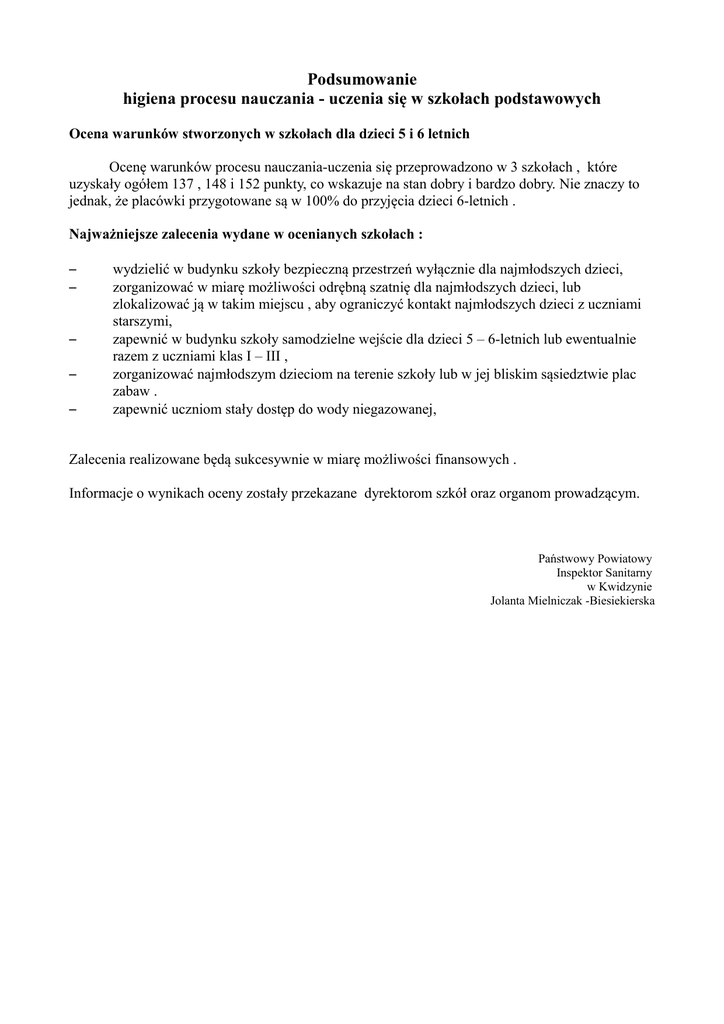 Podsumowanie higiena procesu nauczania - uczenia się w szkołach podstawowych Ocena warunków stworzonych w szkołach dla dzieci 5 i 6 letnich Ocenę warunków procesu nauczania-uczenia się przeprowadzono w 3 szkołach , które uzyskały ogółem 137 , 148 i 152 punkty, co wskazuje na stan dobry i bardzo dobry. Nie znaczy to jednak, że placówki przygotowane są w 100% do przyjęcia dzieci 6-letnich . Najważniejsze zalecenia wydane w ocenianych szkołach : – – – – – wydzielić w budynku szkoły bezpieczną przestrzeń wyłącznie dla najmłodszych dzieci, zorganizować w miarę możliwości odrębną szatnię dla najmłodszych dzieci, lub zlokalizować ją w takim miejscu , aby ograniczyć kontakt najmłodszych dzieci z uczniami starszymi, zapewnić w budynku szkoły samodzielne wejście dla dzieci 5 – 6-letnich lub ewentualnie razem z uczniami klas I – III , zorganizować najmłodszym dzieciom na terenie szkoły lub w jej bliskim sąsiedztwie plac zabaw . zapewnić uczniom stały dostęp do wody niegazowanej, Zalecenia realizowane będą sukcesywnie w miarę możliwości finansowych . Informacje o wynikach oceny zostały przekazane dyrektorom szkół oraz organom prowadzącym. Państwowy Powiatowy Inspektor Sanitarny w Kwidzynie Jolanta Mielniczak -Biesiekierska