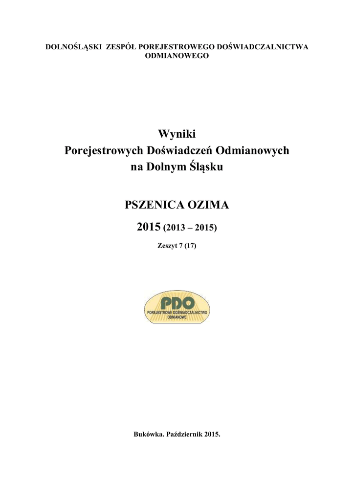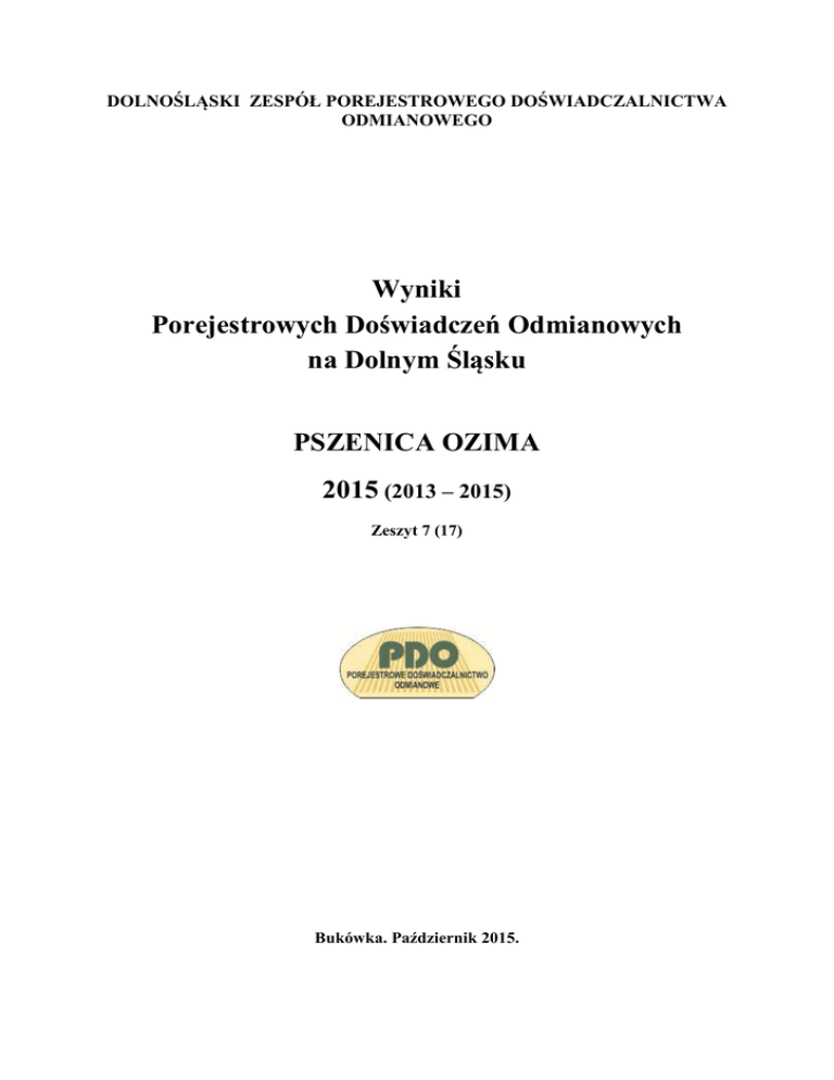 DOLNOŚLĄSKI ZESPÓŁ POREJESTROWEGO DOŚWIADCZALNICTWA ODMIANOWEGO Wyniki Porejestrowych Doświadczeń Odmianowych na Dolnym Śląsku PSZENICA OZIMA 2015 (2013 – 2015) Zeszyt 7 (17) Bukówka. Październik 2015. Dolnośląski Zespół Porejestrowego Doświadczalnictwa Odmianowego przewodniczący: mgr inż. Tomasz Kulon z-ca: prof. dr hab. Andrzej Kotecki z-ca: dr inż. Paweł Dopierała sekretarz: mgr inż. Regina Karkoszka Stacja Koordynująca PDO na Dolnym Śląsku COBORU Stacja Doświadczalna Oceny Odmian w Zybiszowie 55-080 Kąty Wrocławskie Dyrektor: mgr inż. Anna Kamińska e-mail [email protected] www.zybiszow.coboru.pl tel. 71 334 20 10 fax 71 334 20 17 Opracował: mgr inż. Tomasz Kulon Rozpowszechnianie danych zawartych w publikacji wyłącznie z podaniem COBORU jako źródła informacji Wydawca: SDOO Zybiszów WSTĘP W syntezie wykorzystano wyniki 24 doświadczeń z odmianami pszenicy ozimej przeprowadzonych na Dolnym Śląsku w latach 2013 – 2015. Liczba i lokalizacja doświadczeń jest wystarczająca do uzyskania reprezentatywnych wyników. Jesienią 2014 roku założono na Dolnym Śląsku 8 doświadczeń. Ze względu na gradobicie nie uwzględniono doświadczenia w Zybiszowie. Przy ocenie wylegania oraz porażenia chorobami zestawiono wyniki jedynie z tych doświadczeń w których dane zjawisko wystąpiło, natomiast średnie dla wysokości roślin i masy 1000 ziarn pochodzą z tych punktów doświadczalnych, w których dokonano pomiaru. Obecnie w Krajowym Rejestrze znajduje się 91 odmian pszenicy ozimej. Spośród tych odmian Zespół Wojewódzki PDO, jesienią ubiegłego roku, wybrał do doświadczeń na Dolnym Śląsku 22 odmiany, które w poprzednich latach wypadły stosunkowo najlepiej w naszym województwie. Doświadczenia prowadzono jako dwupowtórzeniowe, na dwóch poziomach agrotechnicznych: a1 – podstawowym a2 – wysokim (zwiększone o 40 kg nawożenie azotowe, zwalczanie chorób grzybowych, stosowanie antywylegacza i dolistne dokarmianie mikronawozami). W opracowaniu, poza ogólnymi charakterystykami wszystkich odmian badanych w doświadczeniach PDO w roku 2015 podano również charakterystykę odmian wpisanych do krajowego rejestru w 2014 roku. II. ANALIZA WYNIKÓW DOŚWIADCZEŃ Średni plon pszenicy ozimej w doświadczeniach na Dolnym Śląsku wynosił w 2015 roku 88,7 dt/ha na poziomie podstawowym (a1) i 99,8 dt/ha na poziomie wysokim (a2). Był na poziomie niższym agrotechniki o 1,0 dt/ha wyższy a na poziomie wyższym identyczny jak w roku ubiegłym. Poziom plonowania zróżnicowany w poszczególnych miejscowościach od 59,9 dt/ha w Pawłowicach. do 112,2 dt/ha w Kobierzycach na podstawowym poziomie agrotechnicznym oraz od 69,0 dt/ha również w Pawłowicach do 127,16 dt/ha również w Kobierzycach . Porażenie roślin chorobami było podobne do roku ubiegłego. Mączniak prawdziwy wystąpił w 4 z 7 analizowanych pod tym względem doświadczeń w nasileniu na poziomie 7,8 . Rdza brunatna wystąpiła w 6 analizowanych doświadczeniach w nasileniu na poziomie 7,6 . Wrażliwą okazała się odmiana: KWS Magic , bardziej odporną natomiast Ostroga Septorioza liści i septorioza plew ocenione zostały odpowiednio w 3 doświadczeniach w nasileniu odpowiednio 6,3 i 6,8. Wyleganie w fazie dojrzałości mlecznej było znikome a przed zbiorem wystąpiło w skali 7.2 pkt. wyższą odpornością wyróżniła się odmiana Julius a niższą odmiana Patras. Przyrost plonu wraz ze zwiększeniem intensywności uprawy był wysoki i wyniósł 11,1 dt/ha. III. CHARAKTERYSTYKA ODMIAN (Sporządzona na podstawie wieloletnich wyników doświadczeń przeprowadzonych na terenie całego kraju przez specjalistów COBORU . Odmiany jakościowe MULAN Odmiana jakościowa (grupa A). Plenność bardzo dobra. Przyrost plonu na wysokim poziomie agrotechniki nieco poniżej średniej. Mrozoodporność mała do średniej. Odporność na rdzę brunatną i septoriozę liści – dość duża, na mączniaka, septoriozę plew i choroby podstawy źdźbła – przeciętna, na brunatną plamistość liści i fuzariozę kłosów – dość mała. Rośliny średniej wysokości, o przeciętnej odporności na wyleganie. Termin kłoszenia i dojrzewania dość wczesny. Masa 1000 ziarn średnia, wyrównanie dobre, gęstość w stanie zsypnym mała. Odporność na porastanie w kłosie i liczba opadania dość duże. Zawartość białka średnia, ilość glutenu dość duża. Wskaźnik sedymentacji SDS dość duży. Wydajność ogólna mąki dość słaba. Tolerancja na zakwaszenie gleby średnia. NATULA Odmiana jakościowa (grupa A). Plenność dobra. Mrozoodporność średnia. Odporność na mączniaka prawdziwego, rdzę brunatną i septoriozę plew – dość duża, na brunatną plamistość liści i choroby podstawy źdźbła – średnia, na septoriozę liści i fuzariozę kłosów – dość mała. Rośliny dość wysokie, o przeciętnej odporności na wyleganie. Termin kłoszenia dość wczesny, dojrzewania średni. Masa 1000 ziaren duża, wyrównanie dość dobre, gęstość w stanie zsypnym dość mała. Odporność na porastanie w kłosie średnia, liczba opadania duża. Zawartość białka dość duża, ilość glutenu średnia. Wskaźnik sedymentacyjny SDS duży. Wydajność ogólna mąki dość dobra. Tolerancja na zakwaszenie gleby dość duża. OSTROGA Odmiana jakościowa (grupa A), o ościstym kłosie. Plenność przeciętna. Przyrost plonu na wysokim poziomie agrotechniki średni. Mrozoodporność średnia. Odporność na rdzę brunatną – duża do bardzo dużej, na brunatną plamistość liści, septoriozę liści i plew oraz choroby podstawy źdźbła – dość duża, na fuzariozę kłosów – przeciętna, na mączniaka – dość mała. Rośliny średniej wysokości, o przeciętnej odporności na wyleganie. Termin kłoszenia i dojrzewania późny. Masa 1000 ziarn duża do bardzo dużej, wyrównanie dobre, gęstość w stanie zsypnym średnia. Odporność na porastanie w kłosi