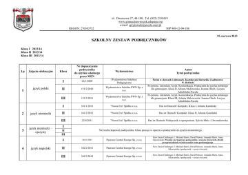 ul. Dworcowa 27, 44-180, Tel. (032) 2334419 www.gimnazjum-toszek.edupage.org e-mail: [email protected] NIP 969-12-04-186 REGON: 276303732 15 czerwca 2013 SZKOLNY ZESTAW PODRĘCZNIKÓW Klasa I 2013/14 Klasa II 2013/14 Klasa III 2013/14 Lp 1 2 3 4 Zajęcia edukacyjne język polski język niemiecki język niemiecki – ojczysty język angielski Klasa Nr dopuszczenia podręcznika do użytku szkolnego przez MEN Wydawnictwo I 26/1/2009 Wydawnictwa Szkolne i Pedagogiczne Autor Tytuł podręcznika Świat w słowach i obrazach. Kształcenie literackie i kulturowe W. Bobiński Po polsku. Literatura. Język. Komunikacja. Podręcznik do języka polskiego dla gimnazjum. Klasa II, Jolanta Malczewska, Joanna Olech, Lucyna Adrabińska-Pacuła Po polsku. Literatura. Język. Komunikacja. Podręcznik do języka polskiego dla gimnazjum. Klasa III, Jolanta Malczewska, Joanna Olech, Lucyna Adrabińska-Pacuła II 151/2/2010 Wydawnictwo Szkolne PWN Sp. z o.o. III 151/3/2011 Wydawnictwo Szkolne PWN Sp. z o.o. I 341/1/2011 "Nowa Era" Spółka z o.o. Das ist Deutsch! Kompakt. Klasa I, Jolanta Kamińska II 341/2/2012 "Nowa Era" Spółka z o.o. Das ist Deutsch! Kompakt. Klasa II, Jolanta Kamińska III 22/4/2011 "Nowa Era" Spółka z o.o. Das ist Deutsch! Podręcznik z repetytorium. Sylwia Mróz - Dwornikowska I Nie trzeba kupować podręcznika. Klasa pracuje w oparciu o podręczniki do języka niemieckiego. II III I 342/1/2011 Pearson Central Europe Sp. z o.o. New Exam Challenges 1. Michael Harris, David Mower, Amanda Maris, Anna Sikorzyńska. Prosimy nie kupować podręcznika i zeszytu ćwiczeń do chwili przeprowadzenia wśród uczniów testu poziomującego. II 342/2/2011 Pearson Central Europe Sp. z o.o. New Exam Challenges 2. Michael Harris, David Mower, Amanda Maris, Anna Sikorzyńska. (podręcznik + zeszyt ćwiczeń) III 342/3/2012 Pearson Central Europe Sp. z o.o. New Exam Challenges 3. Michael Harris, David Mower, Amanda Maris, Anna Sikorzyńska. (podręcznik + zeszyt ćwiczeń) 5 6 7 8 9 10 11 historia wos geografia biologia chemia fizyka matematyka Wydawnictwa Szkolne i Pedagogiczne S.A. Wydawnictwa Szkolne i Pedagogiczne S.A. Przez tysiąclecia i wieki. Historia. Gimnazjum. Podręcznik. Klasa 1, Grzegorz Kucharczyk, Paweł Milcarek, Marek Robak Przez tysiąclecia i wieki. Historia. Gimnazjum. Podręcznik. Klasa 2, Grzegorz Kucharczyk, Paweł Milcarek, Marek Robak Wydawnictwa Szkolne i Pedagogiczne S.A. Przez tysiąclecia i wieki. Historia. Gimnazjum. Podręcznik. Klasa 3, Grzegorz Kucharczyk, Paweł Milcarek, Marek Robak Wydawnictwo Pedagogiczne OPERON Sp. z o.o. Wydawnictwo Pedagogiczne OPERON Sp. z o.o. Wiedza o społeczeństwie. Podręcznik dla gimnazjum + zeszyt ćwiczeń dla ucznia. Część 1, Elżbieta Dobrzycka, Krzysztof Makara. Wiedza o społeczeństwie. Podręcznik dla gimnazjum + zeszyt ćwiczeń dla ucznia. Część 2, Elżbieta Dobrzycka, Krzysztof Makara. Planeta Nowa. Podręcznik do geografii dla klasy pierwszej gimnazjum, cz. 1, Roman Malarz + zeszyt ćwiczeń Planeta Nowa. Podręcznik do geografii dla klasy drugiej gimnazjum, cz. 2, Dawid Szczypiński, Mirosław Wójtowicz, + zeszyt ćwiczeń I 130/1/2009 II 130/2/2009 III 130/3/2010 II 96/1/2009 III 96/2/2010 I 7/1/2009 Wydawnictwo "Era" Sp. z o.o. II 7/2/2009 Wydawnictwo "Era" Sp. z o.o. III 7/3/2010 Wydawnictwo "Era" Sp. z o.o. I 74/1/2009 II 74/2/2009 III 74/3/2010 I 40/1/2009 II 40/2/2009 III Wydawnictwa Szkolne i Pedagogiczne S.A. Wydawnictwa Szkolne i Pedagogiczne S.A. Planeta Nowa. Podręcznik do geografii dla klasy trzeciej gimnazjum, cz. 3, Mariusz Szubert, + zeszyt ćwiczeń Bliżej biologii. Podręcznik dla gimnazjum + zeszyt ćwiczeń. Część 1, Ewa Pyłka-Gutowska, Ewa Jastrzębska Bliżej biologii. Podręcznik dla gimnazjum + zeszyt ćwiczeń. Część 2, Ewa Pyłka-Gutowska, Ewa Jastrzębska Wydawnictwa Szkolne i Pedagogiczne S.A. Wydawnictwa Szkolne i Pedagogiczne S.A. Wydawnictwa Szkolne i Pedagogiczne S.A. Bliżej biologii. Podręcznik dla gimnazjum + zeszyt ćwiczeń. Część 3, Ewa Pyłka-Gutowska, Ewa Jastrzębska Ciekawa chemia. Część 1. Podręcznik gimnazjalisty, Hanna Gulińska, Janina Smolińska Ciekawa chemia. Część 2. Podręcznik gimnazjalisty, Hanna Gulińska, Janina Smolińska 40/3/2009 Wydawnictwa Szkolne i Pedagogiczne S.A. Ciekawa chemia. Część 3. Podręcznik gimnazjalisty, Hanna Gulińska, Janina Smolińska I 93/1/2009 "Nowa Era" Spółka z o.o. II 93/02/2010, 93/3/2010 "Nowa Era" Spółka z o.o. III 93/4/2011 "Nowa Era" Spółka z o.o. I 168/1/2009 Gdańskie Wydawnictwo Oświatowe II 168/2/2010 III 168/3/2011 Gdańskie Wydawnictwo Oświatowe Gdańskie Wydawnictwo Oświatowe Spotkania z fizyką. Podręcznik dla gimnazjum. Część 1, Grażyna FrancuzOrnat, Teresa Kulawik, Maria Nowotny-Różańska Spotkania z fizyką. Podręcznik dla gimnazjum. Część 2, Część 3 Grażyna Francuz-Ornat, Teresa Kulawik, Maria Nowotny-Różańska Spotkania z fizyką. Podręcznik dla gimnazjum. Część 4, Grażyna FrancuzOrnat, Teresa Kulawik, Maria Nowotny-Różańska Matematyka 1.Podręcznik dla klasy pierwszej gimnazjum- praca zbiorowa pod redakcją M. Dobrowolskiej, wydanie 2009 lub nowsze Matematyka 1. Zbiór zadań - M. Braun, J. Lech – nowa wersja Matematyka 2.Podręcznik dla klasy drugiej gimnazjum- praca zbiorowa pod redakcją M. Dobrowolskiej, wydanie 2010 lub nowsze Matematyka 2. Zbiór zadań - M. Braun, J. Lech – nowa wersja Matematyka 3.Podręcznik dla klasy trzeciej gimnazjum- praca zbiorowa pod redakcją M. Dobrowolskiej, wydanie 2011 lub nowsze Matematyka 3. Zbiór zadań - M. Braun, J. Lech – nowa wersja 12 13 14 15 wf edukacja dla bezpieczeństwa zajęcia artystyczne Nie jest wymagany zakup podręcznika. I, II, III Tylko kl I 17/2009 "Nowa Era" Spółka z o.o. Żyję i działam bezpiecznie. Edukacja dla bezpieczeństwa. Podręcznik z ćwiczeniami dla klas 1-3 gimnazjum- Jarosław Słoma, Grzegorz Zając, Grzegorz Cebula Tylko kl. I Nie jest wymagany zakup podręcznika. Kl. I Nie jes