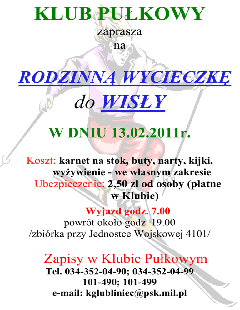 KLUB PUŁKOWY zaprasza na RODZINNĄ WYCIECZKĘ do WISŁY W DNIU 13.02.2011r. Koszt: karnet na stok, buty, narty, kijki, wyŜywienie - we własnym zakresie Ubezpieczenie: 2,50 zł od osoby (płatne w Klubie) Wyjazd godz. 7.00 powrót około godz. 19.00 /zbiórka przy Jednostce Wojskowej 4101/ Zapisy w Klubie Pułkowym Tel. 034-352-04-90; 034-352-04-99 101-490; 101-499 e-mail: [email protected]