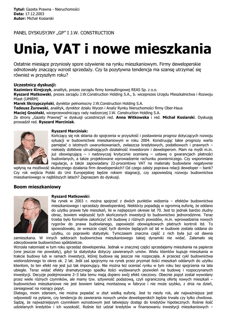 Tytuł: Gazeta Prawna - Nieruchomości Data: 17.12.2003 Autor: Michał Kosiarski PANEL DYSKUSYJNY „GP” I J.W. CONSTRUCTION Unia, VAT i nowe mieszkania Ostatnie miesiące przyniosły spore ożywienie na rynku mieszkaniowym. Firmy deweloperskie odnotowały znaczący wzrost sprzedaży. Czy ta pozytywna tendencja ma szansę utrzymać się również w przyszłym roku? Uczestnicy dyskusji: Kazimierz Kirejczyk, analityk, prezes zarządu firmy konsultingowej REAS Sp. z o.o. Ryszard Matkowski, prezes zarządu J.W.Construction Holding S.A., b. wiceprezes Urzędu Mieszkalnictwa i Rozwoju Miast (UMiRM) Marek Skrzypczyński, dyrektor pełnomocny J.W.Construction Holding S.A. Tadeusz Żurowski, analityk, dyrektor działu Wycen i Analiz Rynku Nieruchomości firmy Ober-Haus Maciej Gnoiński, wiceprzewodniczący rady nadzorczej J.W. Construction Holding S.A. Ze strony „Gazety Prawnej” w dyskusji uczestniczyli red. Anna Witkowska i red. Michał Kosiarski. Dyskusję prowadził red. Ryszard Marciniak. Ryszard Marciniak: Kończący się rok skłania do spojrzenia w przyszłość i postawienia prognoz dotyczących rozwoju sytuacji w budownictwie mieszkaniowym w roku 2004. Konstruując takie prognozy warto pamiętać o istotnych uwarunkowaniach, zwłaszcza kredytowych, podatkowych i prawnych – niekiedy dotkliwie utrudniających działalność inwestorom i deweloperom. Mam na myśli m.in. już obowiązującą – i nadzwyczaj krytycznie ocenianą – ustawę o gwarancjach płatności budowlanych, a także projektowane wprowadzenie rachunku powierniczego. Czy wspomniane regulacje, a także zapowiadany 22-procentowy VAT na materiały budowlane negatywnie wpłyną na możliwość skutecznego działania firm deweloperskich? Od czego zależy poprawa relacji deweloper – bank? Czy rok wejścia Polski do Unii Europejskiej będzie rokiem stagnacji, czy zapowiedzią rozwoju budownictwa mieszkaniowego w najbliższych latach? Zapraszam do dyskusji. Boom mieszkaniowy Ryszard Matkowski: Na rynek w 2003 r. można spojrzeć z dwóch punktów widzenia – efektów budownictwa mieszkaniowego i sprzedaży deweloperskiej. Niektórzy popadają w ogromną euforię, że oddano do użytku prawie tyle mieszkań, ile w najlepszym okresie lat 70. Jest to jednak bardzo złudny obraz, bowiem większość tych skończonych inwestycji to budownictwo jednorodzinne. Teraz trzeba było formalnie zakończyć ich budowę z różnych powodów, m.in. wprowadzenia nowych rygorów do prawa budowlanego, zapowiedzi obowiązkowych płatnych kontroli itd. To spowodowało, że wreszcie część tych domów będących od lat w budowie została oddana do użytku, co poprawiło statystyki. Tymczasem znaczna część z nich była już od dawna zamieszkana. W innych sektorach budownictwa mieszkaniowego takiej dynamiki nie widać. Załamało się zdecydowanie budownictwo spółdzielcze. Wzrosła natomiast w tym roku sprzedaż deweloperska. Jednak w znacznej części sprzedajemy mieszkania na papierze (one jeszcze nie powstały), gdyż ta statystyka dotyczy zawieranych umów. Wielu klientów kupuje mieszkania w trakcie budowy lub w ramach inwestycji, której budowa się jeszcze nie rozpoczęła. A przecież cykl budownictwa wielorodzinnego to okres ok. 2 lat. Jeśli zaś spojrzymy na rynek przez pryzmat ilości mieszkań oddanych do użytku klientom, to ten efekt nie jest już tak imponujący. Nie można też oceniać rynku w tym roku bez spojrzenia na lata ubiegłe. Teraz widać efekty dramatycznego spadku ilości wydawanych pozwoleń na budowę i rozpoczynanych inwestycji. Decyzje podejmowane 2–3 lata temu mają dopiero swój efekt rzeczowy. Obecnie popyt został wywołany przez wiele różnych czynników, ale mamy tzw. sztywność podażową, czyli ograniczoną ofertę nowych mieszkań – budownictwo mieszkaniowe nie jest bowiem taśmą montażową w fabryce i nie może szybko, z dnia na dzień, zareagować na rosnący popyt. Dlatego, moim zdaniem, nie można popadać w zbyt wielką euforię. Jest to niezły rok, ale najważniejsza jest odpowiedź na pytanie, czy tendencja do zawierania nowych umów deweloperskich będzie trwała czy tylko chwilowa. Sądzę, że najważniejszym czynnikiem wzrostowym jest łatwiejszy dostęp do kredytów hipotecznych. Rośnie ilość udzielanych kredytów i ich wysokość. Rośnie też udział kredytów w finansowaniu inwestycji mieszkaniowych – niedawno nie przekraczał w on Polsce jeszcze 10 proc., obecnie wynosi już 26–30 proc. Pod tym względem daleko nam jeszcze do państw Europy Zachodniej czy USA, gdzie ten udział wynosi 70–90 proc. Znaczenie mają też oczywiście zapowiedzi zmian w VAT, podatkach i wejście Polski do UE. Najważniejsze jest jednak, czy obecna tendencja wzrostowa się utrzyma i rynek nieruchomości wyjdzie ze stagnacji. Kazimierz Kirejczyk: Obecna sytuacja na rynku wynika z trzech przyczyn: poprawy klimatu gospodarczego, nakręcania koniunktury przez kredyty i malejącej podaży mieszkań. Najlepszym okresem pod względem liczby oddanych mieszkań (czyli wysokiej podaży) był rok 2001. Jednak na początku 2002 r. nastąpiło kilka zjawisk, które istotnie ograniczyły popyt. Podstawowym czynnikiem było spowolnienie gospodarcze, a co za tym idzie – spadek tempa wzrostu dochodów Polaków, ale też spadek optymizmu. Zlikwidowano też tzw. dużą ulgę budowlaną i podniesiono stawki VAT od sprzedaży mieszkań przez deweloperów z 0 na 7 proc. Zapowiedzi zmian w podatkach pod koniec 2001 r. nawet podkręciły sztucznie koniunkturę, ale odbiły się negatywnie na popycie w 2002 r. Nastąpiło wyraźne „tąpnięcie” na rynku. Z czasem następowała poprawa. Zmieniła się radykalnie sytuacja na rynku kredytów hipotecznych. Zdolność kredytowa przeciętnego nabywcy, czyli kwota kredytu, na jaką sobie może pozwolić kupujący dom lub mieszkanie, wzrosła od 2000 r. 2,5-krotnie. Oznacza to, że znacznie więcej osób może sobie – potencjalnie – pozwolić na zaciągnię
