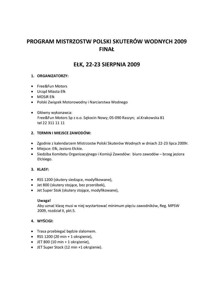 PROGRAM MISTRZOSTW POLSKI SKUTERÓW WODNYCH 2009 FINAŁ EŁK, 22-23 SIERPNIA 2009 1. ORGANIZATORZY: • • • • Free&Fun Motors Urząd Miasta Ełk MOSiR Ełk Polski Związek Motorowodny i Narciarstwa Wodnego • Główny wykonawca: Free&Fun Motors Sp z o.o. Sękocin Nowy; 05-090 Raszyn; al.Krakowska 81 tel 22 311 11 11 2. TERMIN I MIEJSCE ZAWODÓW: • Zgodnie z kalendarzem Mistrzostw Polski Skuterów Wodnych w dniach 22-23 lipca 2009r. • Miejsce: Ełk, Jezioro Ełckie. • Siedziba Komitetu Organizacyjnego i Komisji Zawodów: biuro zawodów – brzeg jeziora Ełckiego. 3. KLASY: • RSS 1200 (skutery siedzące, modyfikowane), • Jet 800 (skutery stojące, bez przeróbek), • Jet Super Stok (skutery stojące, modyfikowane), Uwaga! Aby uznać klasę musi w niej wystartować minimum pięciu zawodników, Reg. MPSW 2009, rozdział II, pkt.5. 4. WYŚCIGI: • • • • Trasa przebiegać będzie slalomem. RSS 1200 (20 min + 1 okrążenie), JET 800 (10 min + 1 okrążenie), JET Super Stock (12 min +1 okrążenie). • We wszystkich biegach obowiązuje jedno okrążenie bezpieczeństwa. Skuter, który nie wykona tego okrążenia i nie będzie reagować na sygnały zamknięcia trasy, traci jedno okrążenie. • Po przejechaniu mety 1-szego zawodnika, wszyscy pozostali zawodnicy będą kolejno wymachani flagą w biało - czarną szachownicę. • Zawodnik będzie sklasyfikowany, jeżeli pokona co najmniej 75% trasy danego biegu i zostanie wymachany na linii mety. • Bieg przerwany będzie powtarzany tylko jeden raz. 5. ZGŁOSZENIA: • Zgłoszenia do zawodów będą przyjmowane do dnia 16-08-2009 e-mail: [email protected] telefon: 504 032 884 • Osobiście podpisane zgłoszenie rozumiane będzie jako aprobata Regulaminu Mistrzostw Polski Skuterów Wodnych 2009. • Wpisowe zawodników wynosi: 100 zł bez względu na ilość klas w których bierze udział dany zawodnik (rozdział III, pkt.2 Regulaminu MPSW 2009). • Minimalny wiek zawodników i mechaników - 15 lat. Dla niepełnoletnich uczestników wymagana jest zgoda rodziców. • Zawodnicy uczestniczą w zawodach na własny koszt. • Warunkiem dopuszczenia zawodnika do startu w Mistrzostwach Polski jest zdeponowanie w Biurze Zawodów następujących dokumentów: ü Aktualna licencja sportowa ü Aktualne badania lekarskie ü Aktualne ubezpieczenie OC i NW ü Pokwitowanie wpłaty wpisowego ü Wypełniona i podpisana przez sędziego technicznego karta odbioru technicznego 6. START: • Zawody rozgrywane będą zgodnie z Regulaminem Mistrzostw Polski Skuterów Wodnych 2009. • Kilka punktów Regulaminu MPSW 2009 (protesty, punktacja, numery startowe, odprawa zawodników itd.) ma odnośniki do Regulaminu UIM – Przepisy Wyścigów W Kategorii Aquabike – Sporty Techniczne 2008. • Sprawy odbioru technicznego odbywają się wg Regulaminu IJSBA 2009. • Obecność zawodnika na odprawie jest obowiązkowa, rozdział IV, pkt. 11 Regulaminu MPSW 2009. • Obowiązujące kolory flag używane w trakcie zawodów (art.304 UIM): ü zielona – start do wyścigu, ü żółta – niebezpieczeństwo na trasie, ü czerwona – natychmiastowe zatrzymanie wyścigu, • • • • • ü czarna – używana łącznie z tablicą z numerem startowym zawodnika, nakazuje przerwanie wyścigu danego zawodnika i zgłoszenie do SG, ü biała – sygnalizuje początek ostatniego okrążenia, ü niebieska – sygnalizuje, że zawodnik jest wyprzedzany, ü biało-czarna szachownica – zakończenie wyścigu. Obowiązuje start zatrzymany z wody. Sygnałem startowym jest sygnał flagą koloru zielonego. Falstart pierwszy, zawodnik trzyma kluczyk ze zrywką nad głową do momentu startu. Nie przestrzeganie procedury falstartu – dyskwalifikacja. Pozostałe Kary Regulaminowe, rozdział VI Regulaminu MPSW 2009. 7. NAGRODY: • Zawodnicy wszystkich klas biorący udział w I eliminacji otrzymują za miejsca I, II, III puchary i dyplomy. • Za Mistrzostwa Polski Skuterów Wodnych 2009 (klasyfikacja końcowa) zawodnicy otrzymują medale : złoty za I miejsce, srebrny za II miejsce, brązowy za III miejsce oraz puchary za miejsca I, II, III – tylko w finałowej eliminacji. 8. UBEZPIECZENIE: • Każdy z zawodników jest zobowiązany do posiadania polisy OC (odpowiedzialności cywilnej). Minimalna kwota ubezpieczenia wynosi 25 000 PLN. • Organizator będzie wymagał również polisy NNW (od następstw nieszczęśliwych wypadków) i kosztów leczenia. • Możliwe będzie wykupienie w/w polis na miejscu w biurze zawodów. 9. PARK MASZYN: • Park maszyn jest strzeżoną strefą, przeznaczoną do parkowania i technicznego przygotowania skuterów do startu. • Park maszyn będzie strzeżony od godziny 10.00 w dniu 22-08-09 do godziny 15.00 w dniu 23-08-09. • Przebywanie w Parku Maszyn w godzinach nocnych oraz podczas otwarcia i zamknięcia zawodów będzie zabronione. • Parkowanie skuterów dozwolone jest tylko w wyznaczonych polach. • Wstęp do Parku Maszyn dozwolony jest tylko zawodnikom, mechanikom i osobom funkcyjnym. • Zabrania się wprowadzania zwierząt do Parku Maszyn. • Na całym terenie Parku Maszyn obowiązuje zakaz palenia tytoniu i używania otwartego ognia. 10. OCHRONA ŚRODOWISKA: • Każdy zawodnik zobowiązany jest do ochrony środowiska naturalnego. • Obowiązkiem zawodnika jest stosowanie pod skuterem zabezpieczającej podkładki (mata, kuweta itp.) chroniącej przed zanieczyszczeniem środowiska. • Odpadki i zużyty olej należy wrzucać do rozstawionych w Parku Maszyn specjalnych pojemników. • Silnik ma używać paliwa bezołowiowego o liczbie oktanowej 95 lub 98. • Za nieprzestrzeganie norm kara wynosi 250 PLN. 11. PROTESTY: • Protesty przyjmowane będą według procedury UIM Art. 401 do 403, wyłącznie na piśmie w języku polskim w Biurze Zawodów. • Opłata za protest wynosi 300 PLN. 12. ADMINISTRACJA ZAWODÓW: • Recepcja zawodów będzie czynna na plaży miejskiej w dniu 22.08.2009 w godzinach od 8.00 do 18.00, 