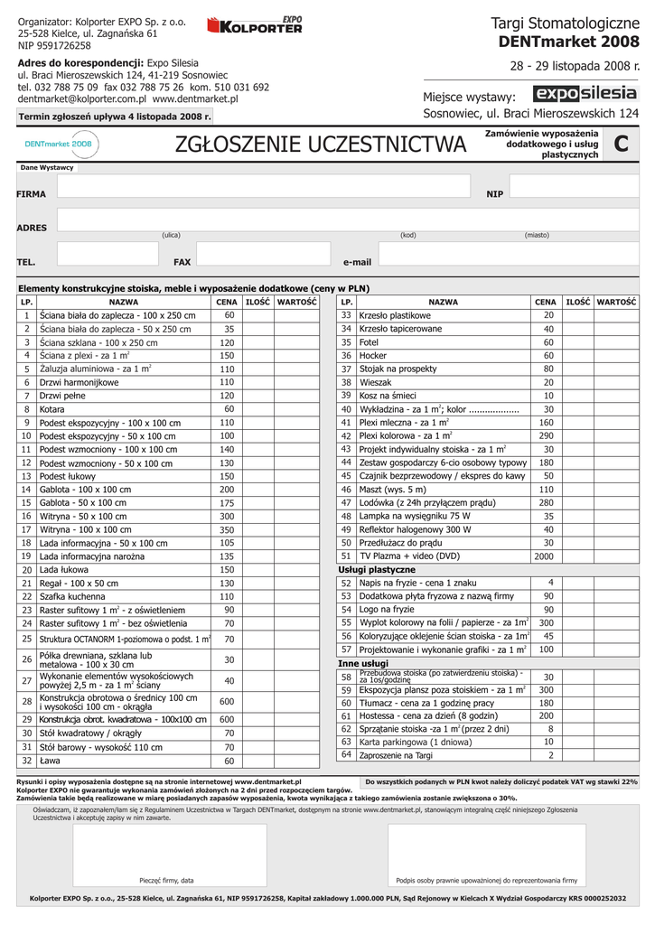 Targi Stomatologiczne DENTmarket 2008 Organizator: Kolporter EXPO Sp. z o.o. 25-528 Kielce, ul. Zagnańska 61 NIP 9591726258 Adres do korespondencji: Expo Silesia ul. Braci Mieroszewskich 124, 41-219 Sosnowiec tel. 032 788 75 09 fax 032 788 75 26 kom. 510 031 692 [email protected] www.dentmarket.pl 28 - 29 listopada 2008 r. Miejsce wystawy: Sosnowiec, ul. Braci Mieroszewskich 124 Termin zgłoszeń upływa 4 listopada 2008 r. ZGŁOSZENIE UCZESTNICTWA Zamówienie wyposażenia dodatkowego i usług plastycznych C Dane Wystawcy NIP FIRMA ADRES (ulica) TEL. (kod) FAX (miasto) e-mail Elementy konstrukcyjne stoiska, meble i wyposażenie dodatkowe (ceny w PLN) CENA NAZWA LP. Ściana biała do zaplecza - 100 x 250 cm 1 2 Ściana biała do zaplecza - 50 x 250 cm 3 4 Ściana szklana - 100 x 250 cm Ściana z plexi - za 1 m2 Żaluzja aluminiowa - za 1 m2 5 Drzwi harmonijkowe Drzwi pełne 6 7 13 Podest łukowy 14 Gablota - 100 x 100 cm 15 Gablota - 50 x 100 cm 16 Witryna - 50 x 100 cm 17 Witryna - 100 x 100 cm 35 34 Krzesło tapicerowane 120 150 35 Fotel 36 Hocker 37 Stojak na prospekty 40 60 60 80 38 Wieszak 39 Kosz na śmieci 10 110 110 110 100 140 130 150 200 175 300 350 105 18 Lada informacyjna - 50 x 100 cm 19 Lada informacyjna narożna 135 20 Lada łukowa 150 21 Regał - 100 x 50 cm 22 Szafka kuchenna 130 110 23 Raster sufitowy 1 m2 - z oświetleniem 90 24 Raster sufitowy 1 m2 - bez oświetlenia 70 25 Struktura OCTANORM 1-poziomowa o podst. 1 m2 70 26 Półka drewniana, szklana lub metalowa - 100 x 30 cm Wykonanie elementów wysokościowych 27 powyżej 2,5 m - za 1 m2 ściany 28 Konstrukcja obrotowa o średnicy 100 cm i wysokości 100 cm - okrągła 29 Konstrukcja obrot. kwadratowa - 100x100 cm CENA 20 60 Podest ekspozycyjny - 100 x 100 cm 10 Podest ekspozycyjny - 50 x 100 cm 11 Podest wzmocniony - 100 x 100 cm 12 Podest wzmocniony - 50 x 100 cm NAZWA LP. 33 Krzesło plastikowe 120 Kotara 8 9 ILOŚĆ WARTOŚĆ 60 30 30 160 2 42 Plexi kolorowa - za 1 m 43 Projekt indywidualny stoiska - za 1 m2 44 Zestaw gospodarczy 6-cio osobowy typowy 290 46 Maszt (wys. 5 m) 47 Lodówka (z 24h przyłączem prądu) 48 Lampka na wysięgniku 75 W 49 Reflektor halogenowy 300 W 50 Przedłużacz do prądu TV Plazma + video (DVD) 51 Usługi plastyczne 52 Napis na fryzie - cena 1 znaku 53 Dodatkowa płyta fryzowa z nazwą firmy 54 Logo na fryzie 2 55 Wyplot kolorowy na folii / papierze - za 1m 600 600 30 Stół kwadratowy / okrągły 70 31 Stół barowy - wysokość 110 cm 32 Ława 70 60 30 180 50 110 280 35 40 30 2000 4 90 90 300 56 Koloryzujące oklejenie ścian stoiska - za 1m2 45 57 Projektowanie i wykonanie grafiki - za 1 m2 100 Inne usługi Przebudowa stoiska (po zatwierdzeniu stoiska) - 40 20 2 40 Wykładzina - za 1 m ; kolor ................... 41 Plexi mleczna - za 1 m2 45 Czajnik bezprzewodowy / ekspres do kawy ILOŚĆ WARTOŚĆ 58 za 1os/godzinę 2 59 Ekspozycja plansz poza stoiskiem - za 1 m 60 Tłumacz - cena za 1 godzinę pracy 61 Hostessa - cena za dzień (8 godzin) 2 62 Sprzątanie stoiska -za 1 m (przez 2 dni) 63 Karta parkingowa (1 dniowa) 64 Zaproszenie na Targi 30 300 180 200 8 10 2 Do wszystkich podanych w PLN kwot należy doliczyć podatek VAT wg stawki 22% Rysunki i opisy wyposażenia dostępne są na stronie internetowej www.dentmarket.pl Kolporter EXPO nie gwarantuje wykonania zamówień złożonych na 2 dni przed rozpoczęciem targów. Zamówienia takie będą realizowane w miarę posiadanych zapasów wyposażenia, kwota wynikająca z takiego zamówienia zostanie zwiększona o 30%. Oświadczam, iż zapoznałem/łam się z Regulaminem Uczestnictwa w Targach DENTmarket, dostępnym na stronie www.dentmarket.pl, stanowiącym integralną część niniejszego Zgłoszenia Uczestnictwa i akceptuję zapisy w nim zawarte. Pieczęć firmy, data Podpis osoby prawnie upoważnionej do reprezentowania firmy Kolporter EXPO Sp. z o.o., 25-528 Kielce, ul. Zagnańska 61, NIP 9591726258, Kapitał zakładowy 1.000.000 PLN, Sąd Rejonowy w Kielcach X Wydział Gospodarczy KRS 0000252032