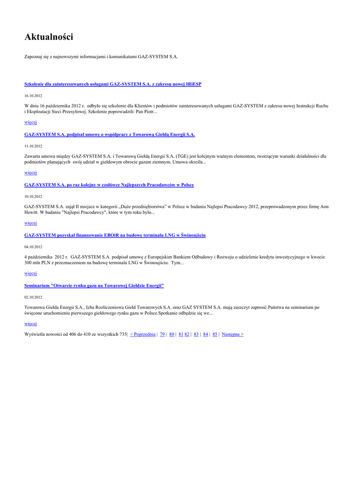 Aktualności Zapoznaj się z najnowszymi informacjami i komunikatami GAZ-SYSTEM S.A. Szkolenie dla zainteresowanych usługami GAZ-SYSTEM S.A. z zakresu nowej IRiESP 16.10.2012 W dniu 16 października 2012 r. odbyło się szkolenie dla Klientów i podmiotów zainteresowanych usługami GAZ-SYSTEM z zakresu nowej Instrukcji Ruchu i Eksploatacji Sieci Przesyłowej. Szkolenie poprowadzili: Pan Piotr... więcej GAZ-SYSTEM S.A. podpisał umowę o współpracy z Towarową Giełdą Energii S.A. 11.10.2012 Zawarta umowa między GAZ-SYSTEM S.A. i Towarową Giełdą Energii S.A. (TGE) jest kolejnym ważnym elementem, tworzącym warunki działalności dla podmiotów planujących swój udział w giełdowym obrocie gazem ziemnym. Umowa określa... więcej GAZ-SYSTEM S.A. po raz kolejny w czołówce Najlepszych Pracodawców w Polsce 10.10.2012 GAZ-SYSTEM S.A. zajął II miejsce w kategorii „Duże przedsiębiorstwa” w Polsce w badaniu Najlepsi Pracodawcy 2012, przeprowadzonym przez firmę Aon Hewitt. W badaniu "Najlepsi Pracodawcy", które w tym roku było... więcej GAZ-SYSTEM pozyskał finansowanie EBOiR na budowę terminalu LNG w Świnoujściu 04.10.2012 4 października 2012 r. GAZ-SYSTEM S.A. podpisał umowę z Europejskim Bankiem Odbudowy i Rozwoju o udzielenie kredytu inwestycyjnego w kwocie 300 mln PLN z przeznaczeniem na budowę terminalu LNG w Świnoujściu. Tym... więcej Seminarium "Otwarcie rynku gazu na Towarowej Giełdzie Energii" 02.10.2012 Towarowa Giełda Energii S.A., Izba Rozliczeniowa Giełd Towarowych S.A. oraz GAZ SYSTEM S.A. mają zaszczyt zaprosić Państwa na seminarium po święcone uruchomieniu pierwszego giełdowego rynku gazu w Polsce.Spotkanie odbędzie się we... więcej Wyświetla nowości od 406 do 410 ze wszystkich 735| < Poprzednia | 79 | 80 | 81 82 | 83 | 84 | 85 | Następna >