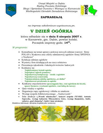 Urząd Miejski w Dąbiu Radny Powiatu Kolskiego Skup i Sprzedaż Owoców i Warzyw w Karszewie Wielkopolski Ośrodek Doradztwa Rolniczego ZAPRASZAJĄ na imprezę szkoleniowo-wystawową pn. V DZIEŃ OGÓRKA która odbędzie się w dniu 5 sierpnia 2007 r. w Karszewie, gm. Dąbie, powiat kolski. Początek imprezy godz. 1400. W programie: • Konsultacje na temat uprawy polowej nowych odmian warzyw firmy POLAN z Krakowa oraz oferty odmianowej ogórków firmy SPÓJNIA z Nochowa” • Kolekcja odmian ogórków • Wystawy firm działających na rzecz rolnictwa • Prezentacja rękodzieła i lokalnych twórców ludowych • Konkursy na: • • • • • - Najdziwniejszy kształt ogórka Największy ogórek gruntowy Najciekawszą kompozycję – stroik z ogórków Najciekawszą rymowankę Najsmaczniejszą sałatkę ogórkową ,,ze słoika” Najciekawsze przebranie za ogórka Konkursy zręcznościowe (przeciąganie liny, rzut ogórkiem do beczki, spacer farmera z workami ogórków, rzut lotką do tarczy) Quiz wiedzy o ogórku Degustacja zupy ogórkowej i chleba ze smalcem Występ zespołu folklorystycznego ,,Nadnerzanki” Inne atrakcje (,,Wesołe miasteczko”, koncert zespołu FENIKS, Antosia Szprychy, występ kabaretu Mieczysława Góry, występ iluzjonisty, bufet, zabawa ,,pod chmurką”, bufet i inne atrakcje) Dodatkowe informacje: oferujemy bezpłatny plac wystawowy