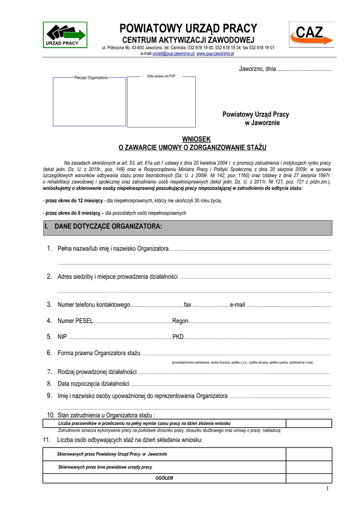 POWIATOWY URZĄD PRACY CENTRUM AKTYWIZACJI ZAWODOWEJ ul. Północna 9b, 43-600 Jaworzno, tel. Centrala: 032 618 19 00, 032 618 19 24, fax 032 618 19 01 e-mail:[email protected], www.pup-jaworzno.pl Jaworzno, dnia .................................... Pieczęć Organizatora Data wpływu do PUP Powiatowy Urząd Pracy w Jaworznie WNIOSEK O ZAWARCIE UMOWY O ZORGANIZOWANIE STAŻU Na zasadach określonych w art. 53, art. 61a ust.1 ustawy z dnia 20 kwietnia 2004 r. o promocji zatrudnienia i instytucjach rynku pracy (tekst jedn. Dz. U. z 2015r., poz. 149) oraz w Rozporządzeniu Ministra Pracy i Polityki Społecznej z dnia 20 sierpnia 2009r. w sprawie szczegółowych warunków odbywania stażu przez bezrobotnych (Dz. U. z 2009r. Nr 142, poz. 1160) oraz Ustawy z dnia 27 sierpnia 1997r. o rehabilitacji zawodowej i społecznej oraz zatrudnianiu osób niepełnosprawnych (tekst jedn. Dz. U. z 2011r. Nr 127, poz. 721 z późn.zm.), wnioskujemy o skierowanie osoby niepełnosprawnej poszukującej pracy niepozostającej w zatrudnieniu do odbycia stażu: - przez okres do 12 miesięcy - dla niepełnosprawnych, którzy nie ukończyli 30 roku życia, - przez okres do 6 miesięcy – dla pozostałych osób niepełnosprawnych I. DANE DOTYCZĄCE ORGANIZATORA: 1. Pełna nazwa/lub imię i nazwisko Organizatora................................................................................................................................................... .….................................................................................................................................................................................................................................................... 2. Adres siedziby i miejsce prowadzenia działalności .......................................................................................................................................... …....................................……………….........................................................................................................................................................................…..……...... 3. Numer telefonu kontaktowego..............................................., fax ..................................e-mail …......................................................................... 4. Numer PESEL......................................................................, Regon..............................................................................................................................… 5. NIP …........................................................................................., PKD .……......……….…...................................................................................................... 6. Forma prawna Organizatora stażu……….....................................................................…………………………………………………………………… (przedsiębiorstwo państwowe, osoba fizyczna, spółka z o.o., spółka akcyjna, spółka cywilna, spółdzielnia i inne) 7. Rodzaj prowadzonej działalności ....................................................................….....…………….…………….....….................................................... 8. Data rozpoczęcia działalności ...................................................................................................................................................................................... 9. Imię i nazwisko osoby upoważnionej do reprezentowania Organizatora …………….......................................................................... ….................................................................................................................................................................................................................................................... 10. Stan zatrudnienia u Organizatora stażu : Liczba pracowników w przeliczeniu na pełny wymiar czasu pracy na dzień złożenia wniosku Zatrudnienie oznacza wykonywanie pracy na podstawie stosunku pracy, stosunku służbowego oraz umowy o pracę nakładczą 11. Liczba osób odbywających staż na dzień składania wniosku: Skierowanych przez Powiatowy Urząd Pracy w Jaworznie Skierowanych przez inne powiatowe urzędy pracy OGÓŁEM 1 II. DANE DOTYCZĄCE SKIEROWANIA I ODBYWANIA STAŻU PRZEZ OSOBĘ NIEPEŁNOSPRAWNĄ POSZUKUJĄCĄ PRACY NIEPOZOSTAJĄCĄ W ZATRUDNIENIU: 1. Liczba przewidywanych miejsc pracy, na których będzie/-ą odbywać staż........................................................... Wymagania stawiane kandydatom, dotyczące: Nazwa stanowiska pracy Ilość miejsc pracy Poziomu wykształcenia Predyspozycji psychofizycznych i zdrowotnych Minimalnych kwalifikacji niezbędnych do podjęcia stażu Propozycja Organizatora stażu Imię, nazwisko i data urodzenia bezrobotnego, który będzie przyjęty na staż Godziny odbywania stażu 2. Proponowany okres odbywania stażu*, .............. ….............................................................................................................................................. 3. Miejsce odbywania stażu przez osoba/-y niepełnosprawna/-ne poszukująca/-ce pracy niepozostająca/-ce w zatrudnieniu .......................................................................................................................................................................................................................... …........................................................................................................................................................................................................................................................ 4. Deklaruję w terminie nie później niż do 3 miesięcy po zakończeniu stażu zatrudnienie/ inną pracę zarobkową** dla…………..... osób-(oby) w formie umowy ………………............