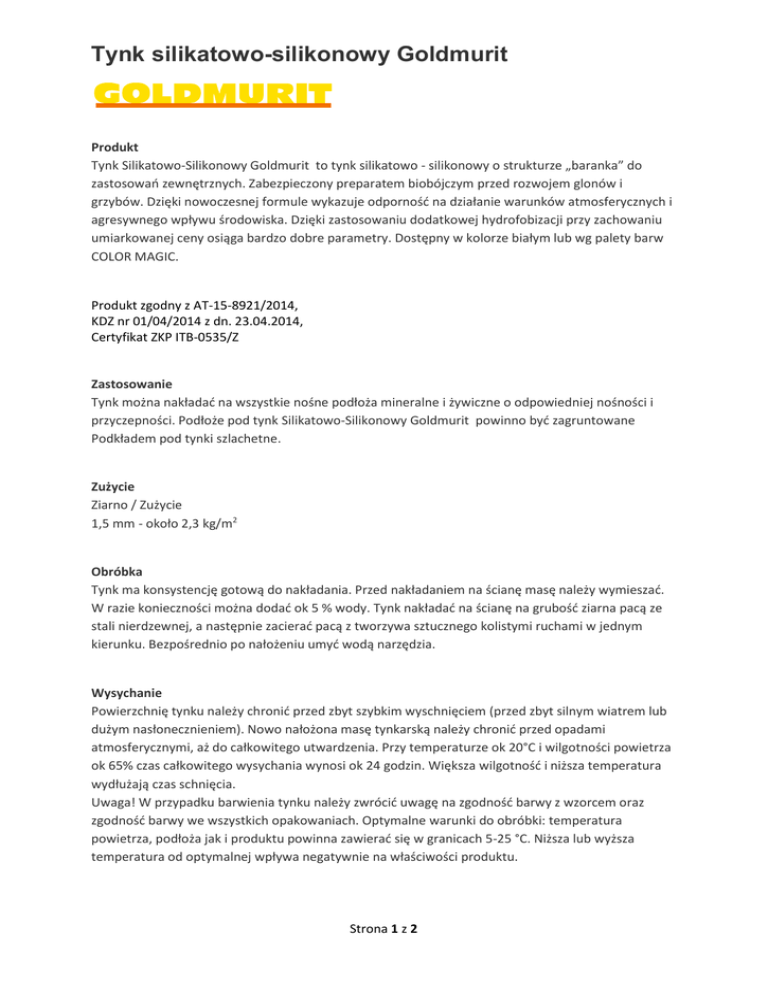 Tynk silikatowo-silikonowy Goldmurit Produkt Tynk Silikatowo-Silikonowy Goldmurit to tynk silikatowo - silikonowy o strukturze „baranka” do zastosowań zewnętrznych. Zabezpieczony preparatem biobójczym przed rozwojem glonów i grzybów. Dzięki nowoczesnej formule wykazuje odporność na działanie warunków atmosferycznych i agresywnego wpływu środowiska. Dzięki zastosowaniu dodatkowej hydrofobizacji przy zachowaniu umiarkowanej ceny osiąga bardzo dobre parametry. Dostępny w kolorze białym lub wg palety barw COLOR MAGIC. Produkt zgodny z AT-15-8921/2014, KDZ nr 01/04/2014 z dn. 23.04.2014, Certyfikat ZKP ITB-0535/Z Zastosowanie Tynk można nakładać na wszystkie nośne podłoża mineralne i żywiczne o odpowiedniej nośności i przyczepności. Podłoże pod tynk Silikatowo-Silikonowy Goldmurit powinno być zagruntowane Podkładem pod tynki szlachetne. Zużycie Ziarno / Zużycie 1,5 mm - około 2,3 kg/m2 Obróbka Tynk ma konsystencję gotową do nakładania. Przed nakładaniem na ścianę masę należy wymieszać. W razie konieczności można dodać ok 5 % wody. Tynk nakładać na ścianę na grubość ziarna pacą ze stali nierdzewnej, a następnie zacierać pacą z tworzywa sztucznego kolistymi ruchami w jednym kierunku. Bezpośrednio po nałożeniu umyć wodą narzędzia. Wysychanie Powierzchnię tynku należy chronić przed zbyt szybkim wyschnięciem (przed zbyt silnym wiatrem lub dużym nasłonecznieniem). Nowo nałożona masę tynkarską należy chronić przed opadami atmosferycznymi, aż do całkowitego utwardzenia. Przy temperaturze ok 20°C i wilgotności powietrza ok 65% czas całkowitego wysychania wynosi ok 24 godzin. Większa wilgotność i niższa temperatura wydłużają czas schnięcia. Uwaga! W przypadku barwienia tynku należy zwrócić uwagę na zgodność barwy z wzorcem oraz zgodność barwy we wszystkich opakowaniach. Optymalne warunki do obróbki: temperatura powietrza, podłoża jak i produktu powinna zawierać się w granicach 5-25 °C. Niższa lub wyższa temperatura od optymalnej wpływa negatywnie na właściwości produktu. Strona 1 z 2 Tynk silikatowo-silikonowy Goldmurit Opakowanie Tynk Silikatowo-Silikonowy Goldmurit dostępny jest w jednorazowych plastikowych opakowaniach o pojemności 25 kg. Opakowanie po dokładnym opróżnieniu można traktować jak odpady gospodarcze. Składowanie Należy chronić przed wilgocią i przechowywać w suchym miejscu na paletach w oryginalnych opakowaniach. Otwarte opakowania należy szczelnie zamknąć. Czas składowania: 24 miesiące w zamkniętych, oryginalnych opakowaniach, w temperaturze pow. +5oC. Nadzór Oprócz bieżących kontroli zewnętrznych zaprawa jest kontrolowana przez laboratorium firmy Hufgard Optolith Bauprodukte Polska Sp. o.o. Dalsze informacje Powyższe informacje są opisem produktu. Należy je traktować jako ogólne wskazówki w oparciu o nasze badania i doświadczenia praktyczne, które jednak nie uwzględniają wymogów konkretnego przypadku zastosowania. W związku z tym zalecamy przeprowadzenie prób. Parametry produktu mogą ulec drobnym zmianom w zakresie deklarowanej klasy nie wpływając na właściwości użytkowe i obróbkę. Z podanych informacji nie wynikają jakiekolwiek roszczenia odszkodowawcze. Strona 2 z 2