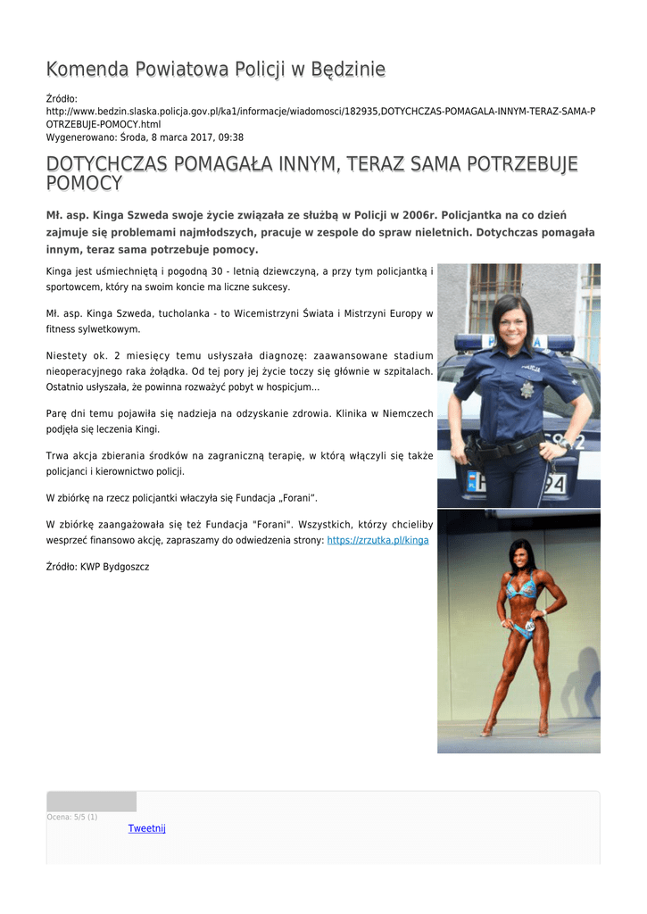 Komenda Powiatowa Policji w Będzinie Źródło: http://www.bedzin.slaska.policja.gov.pl/ka1/informacje/wiadomosci/182935,DOTYCHCZAS-POMAGALA-INNYM-TERAZ-SAMA-P OTRZEBUJE-POMOCY.html Wygenerowano: Środa, 8 marca 2017, 09:38 DOTYCHCZAS POMAGAŁA INNYM, TERAZ SAMA POTRZEBUJE POMOCY Mł. asp. Kinga Szweda swoje życie związała ze służbą w Policji w 2006r. Policjantka na co dzień zajmuje się problemami najmłodszych, pracuje w zespole do spraw nieletnich. Dotychczas pomagała innym, teraz sama potrzebuje pomocy. Kinga jest uśmiechniętą i pogodną 30 - letnią dziewczyną, a przy tym policjantką i sportowcem, który na swoim koncie ma liczne sukcesy. Mł. asp. Kinga Szweda, tucholanka - to Wicemistrzyni Świata i Mistrzyni Europy w fitness sylwetkowym. Niestety ok. 2 miesięcy temu usłyszała diagnozę: zaawansowane stadium nieoperacyjnego raka żołądka. Od tej pory jej życie toczy się głównie w szpitalach. Ostatnio usłyszała, że powinna rozważyć pobyt w hospicjum... Parę dni temu pojawiła się nadzieja na odzyskanie zdrowia. Klinika w Niemczech podjęła się leczenia Kingi. Trwa akcja zbierania środków na zagraniczną terapię, w którą włączyli się także policjanci i kierownictwo policji. W zbiórkę na rzecz policjantki właczyła się Fundacja „Forani”. W zbiórkę zaangażowała się też Fundacja "Forani". Wszystkich, którzy chcieliby wesprzeć finansowo akcję, zapraszamy do odwiedzenia strony: https://zrzutka.pl/kinga Źródło: KWP Bydgoszcz Ocena: 5/5 (1) Tweetnij