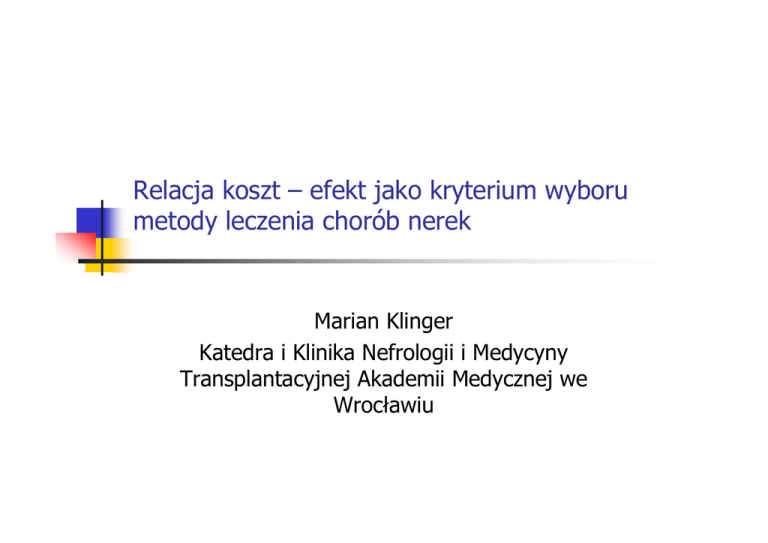 Relacja koszt – efekt jako kryterium wyboru metody leczenia chorób nerek Marian Klinger Katedra i Klinika Nefrologii i Medycyny Transplantacyjnej Akademii Medycznej we Wrocławiu Światowe tło epidemiologiczne International Society of Nephrology news: ponad 1.5 mln ludzi żyje obecnie na świecie dzięki terapii nerkozastępczej, tj. dializie lub przeszczepowi nerki Ocenia się, że w ciągu najbliższych 10 lat światowe wydatki na leczenie nerkozastępcze przekroczą 1trilion dolarów amerykańskich, co po rozpisaniu przedstawia się jako 1.000.000.000.000 $ Jednocześnie w krajach o niskim dochodzie narodowym (Afryka, część Azji i Ameryki Łacińskiej) wystąpienie schyłkowej niewydolności nerek skazuje ponad 95% chorych na śmierć Wprowadzenie epidemiologiczne – ciąg dalszy Wyniki badań przesiewowych w USA: 11 mln osób ze stężeniem kreatyniny w surowicy≥ 1.5 mg/dl, w tym 3 mln≥ 1.7 mg/dl, a 800 tysięcy ≥ 2mg/dl Dane amerykańskie: populacja chorych wymagających leczenia nerkozastępczego podwaja się w okresach 10-letnich: 1990 – 166 tysięcy osób, 2000 – 372 tysiące osób przewidywania: w 2010 – > 650 tysięcy osób, wzrost kosztów leczenia z obecnych 14 bilionów do 28 bilionów $ Epidemiologia – polskie potrzeby Według ostrożnych szacunków w Polsce jest ≅ 100 tysięcy osób ze stężeniem kreatyniny w surowicy ≥ 2 mg/dl W 1990r. leczenie nerkozastępcze – 4700 chorych, 1998 – 10 tysięcy, 2001 – prawie 14 tysięcy, 2003 – 17500, prawie 450/mln mieszkańców, 9906 hemodializa (57%), 1534 dializa otrzewnowa (8.8%), dializoterapia sumarycznie 11440 (65.8%), 6008 z przeszczepioną nerką (34.2%). Szacuje się, że około 4000 chorych wymaga w ciągu roku podjęcia leczenia nerkozastępczego, ok. 100/mln/, 1100 –1200 miejsc - przeszczepy, 2000 – śmiertelność, nowe – 1000 chorych Polska – cena sukcesu - I Zniknął koszmar umierania ludzi z powodu niedostępności dializoterapii, świadomych, że dzięki niej mogliby żyć długie lata – to jest wielki sukces ochrony zdrowia i reformy, zbyt słabo pokazywany społeczeństwu Dializoterapia kosztowała w ubiegłym roku ok. 800 mln – 11440 chorych (206 stacji) Przeszczepy nerek ok. 144 mln – 6008 chorych (16 ośrodków) 16 ośrodków ≈ 100 stacjom dializ Sumaryczny roczny koszt leczenia nerkozastępczego - 944 mln Polska – cena sukcesu II 1000 nowych chorych przybywających do dializoterapii dializoterapii – dodatkowe 57.7 mln tylko na refundację zabiegów Ograniczanie kosztów dializoterapii do wydatków na same zabiegi – zaniżenie rzeczywistych nakładów (dostęp naczyniowy, leczenie towarzyszącej chorobowości i powikłań) Dane brytyjskie (Medical News Today, Oct 2004) – 37500 chorych, 20000 dializowanych (70% HD, 30% CADO), 17500 biorców przeszczepu pochłania 3% budżetu NHS Rodzaje terapii nerkozastępczej – struktura kosztów w Polsce Jeden zabieg HD + transport + Epo – 370 PLN; roczna refundacja 1 pacjenta 52 tyg. x 3 x 370 = 57 720 PLN Jeden zabieg HD + transport bez Epo – 290 PLN; roczna refundacja 1 pacjenta 52 tyg. x 3 x 290 = 45 240 PLN CADO: badania biochemiczne + płyny+EPO: 4500 PLN/miesiąc; roczna refundacja 1 pacjenta 12 miesięcy x 4500 = 54 000 PLN ADO: badania biochemiczne+płyny+EPO: 5800 PLN/miesiąc; roczna refundacja 1 pacjenta 12 miesięcy x 5800 = 69 600 PLN Struktura kosztów terapii nerkozastępczej w Polsce Nie ujęto: koszt dostępu naczyniowego, tylko u nowych chorych i tylko 1 x: 3600 os. x 2000 PLN = 7.2 mln PLN, kosztów hospitalizacji chorych zarówno HD jak i DO z powodu towarzyszącej chorobowości i powikłań Zabieg przeszczepu nerki: opieka nad dawcą, transport biorcy, ostateczna kwalifikacja, wykonanie zabiegu, leczenie: pierwsze 30 dni lub do pierwszego wypisu – 34000 PLN Roczna refundacja w pierwszym roku: 34000 + 11 mies. x 1448 = 50 368 PLN, w kolejnych latach 12 mies. x 1448 = 17856 PLN Struktura kosztów terapii nerkozastępczej w Polsce - podsumowanie HD+EPO = 57 720 PLN/rok CADO + EPO = 54 000 PLN/rok ADO + EPO = 69 600 PLN/rok Przeszczep nerki: 50 368 PLN – pierwszy rok, 17 856 – kolejne lata Struktura i koszty terapii nerkozastępczej – kilka przykładów ze świata Dializy a przeszczepy zależnie od rodzaju świadczeniodawcy w przeliczeniu na 1 mln mieszk. Wyłącznie publiczni: Kanada 310D, 262 P; UK 220 D, 257 P; Dania 270 D, 224 P; Szwecja 256 D, 312 P; Holandia 250 D, 239 P; Szwajcaria 268 D, 277 P Publiczni i prywatni: Niemcy 475 D, 143 P; Francja 368 D, 241 P; Włochy 601 D, 147 P; Belgia 371 D, 228 P Wyłącznie prywatni: USA 579 D, 212 P Udział dializy otrzewnowej w całości leczenia dializami – zależnie od typu świadczeniodawcy Wyłącznie publiczni: Kanada – 37%, Dania – 32%, Holandia – 32 %, Szwajcaria – 20% Publiczni i prywatni: Austria – 9%, Hiszpania – 9%, Niemcy – 9%, Francja – 17%, Włochy – 11% Wyłącznie prywatni: USA – 17% Klinika Nefrologii i Medycyny Transplantacyjnej AM we Wrocławiu (pełna informacja, swoboda wyboru): 78os.HD (70%) , 34 os. DO (30%) Roczne koszty poszczególnych rodzajów terapii nerkozastępczej – przykłady ze świata Włochy: HD – 27.4 tys. US$, CADO – 16.8 tys. US$, ADO – 26.3 US$ Kanada: HD – 59 tys. Can$, CADO – 33 tys. Can$, ADO – 42.1 Can$ Niemcy: HD – 50 tys. euro, CADO – 30 tys. euro, ADO – 40 tys. euro; przeszczep nerki – pierwsza hospitalizacja po zabiegu ( z wyłączeniem opieki na dawcą i chirurgicznych kosztów wykonania zabiegu): 15.380 euro, koszt 1 roku od pierwszej hospitalizacji – 18.636 euro (immunuspresja 52%, rehospitalizacje 24%), w sumie 1 rok 34 tys. euro, 2 rok 14.5 tys. euro Polskie osobliwości refundacji kosztów leczenia nerkozastępczego Wielokrotnie niższe w stosunku do innych krajów, ale brak różnicy między HD i CADO. Przyczynek erytropoetynowy: w Polsce refundacja erytropoetyny 80 zł/zabieg, 240 zł tygodniowo, cena 1000j. erytropoetyny ok. 60 zł., oznacza 