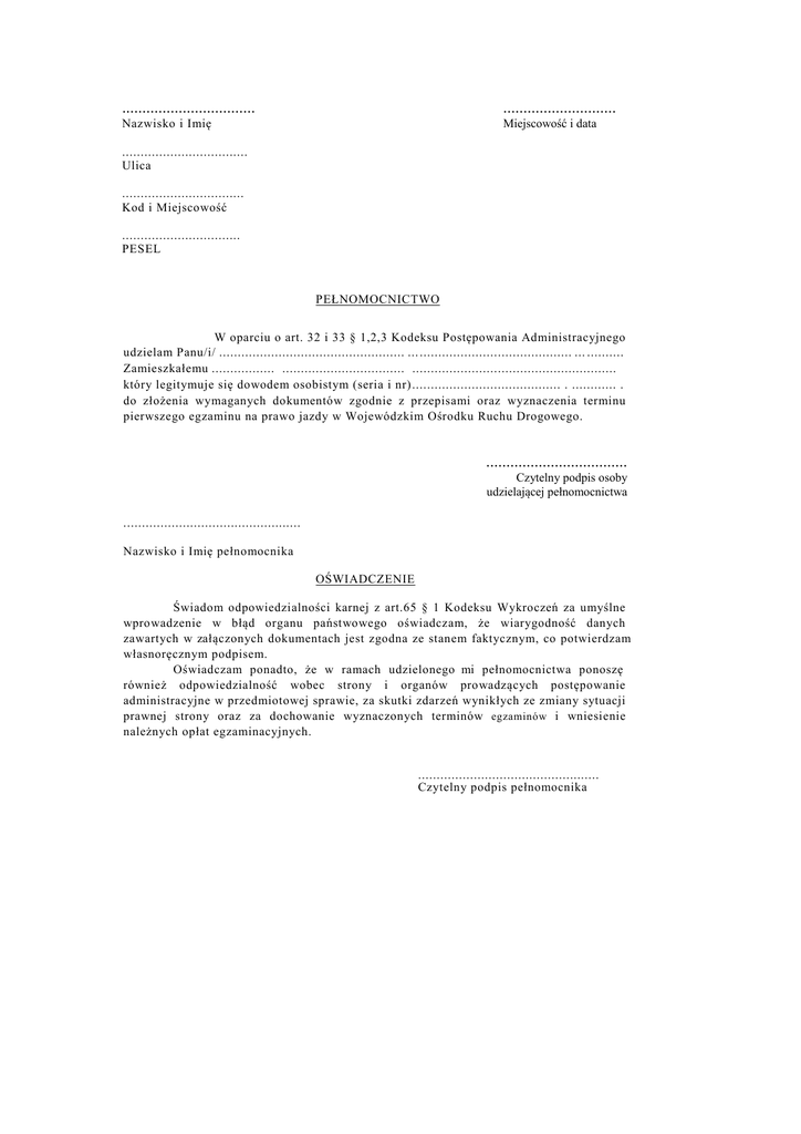 ................................. ............................ Miejscowość i data Nazwisko i Imię .................................. Ulica ................................. Kod i Miejscowość ................................ PESEL PEŁNOMOCNICTWO W oparciu o art. 32 i 33 § 1,2,3 Kodeksu Postępowania Administracyjnego udzielam Panu/i/ .................................................. ... ......................................... ... .......... Zamieszkałemu ................. ................................. ....................................................... który legitymuje się dowodem osobistym (seria i nr) ........................................ . ............ . do złożenia wymaganych dokumentów zgodnie z przepisami oraz wyznaczenia terminu pierwszego egzaminu na prawo jazdy w Wojewódzkim Ośrodku Ruchu Drogowego. ................................... Czytelny podpis osoby udzielającej pełnomocnictwa ................................................ Nazwisko i Imię pełnomocnika OŚWIADCZENIE Świadom odpowiedzialności karnej z art.65 § 1 Kodeksu Wykroczeń za umyślne wprowadzenie w błąd organu państwowego oświadczam, że wiarygodność danych zawartych w załączonych dokumentach jest zgodna ze stanem faktycznym, co potwierdzam własnoręcznym podpisem. Oświadczam ponadto, że w ramach udzielonego mi pełnomocnictwa ponoszę również odpowiedzialność wobec strony i organów prowadzących postępowanie administracyjne w przedmiotowej sprawie, za skutki zdarzeń wynikłych ze zmiany sytuacji prawnej strony oraz za dochowanie wyznaczonych terminów egzaminów i wniesienie należnych opłat egzaminacyjnych. ................................................. Czytelny podpis pełnomocnika