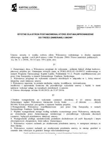 Załącznik nr 7 do zapytania ofertowego nr sprawy GN / 3201/ 2/ 2012 ISTOTNE DLA STRON POSTANOWIENIA, KTÓRE ZOSTANĄ WPROWADZONE DO TREŚCI ZAWIERANEJ UMOWY Umowa zawarta w wyniku wyboru oferty Wykonawcy wyłonionego w drodze zapytania ofertowego, zgodnie z art.4 pkt.8 ustawy z dnia 29 stycznia 2004 r. Prawo zamówień publicznych (t.j. Dz. U. z 2010r., Nr 113 poz. 759 z późn. zm.) §1 1. Zamawiający zleca, a Wykonawca przyjmuje do wykonania : pełnienie funkcji obsługi kadrowopłacowej projektu pn.: Gimnazjum równych szans, nr POKL.09.01.02-18-099/12 realizowanego w ramach Programu Operacyjnego Kapitał Ludzki, Poddziałanie 9.1.2. Projekt współfinansowany jest przez Unię Europejską w ramach Europejskiego Funduszu Społecznego. 2. Wykonawca przyjmuje do wykonania czynności określonych w załączniku nr 1, który stanowi integralną część niniejszej umowy. 3. Wykonawca zapewnia, że posiada niezbędną wiedzę, kwalifikacje, doświadczenie, możliwości i uprawnienia konieczne dla prawidłowego wykonania umowy i będzie w stanie należycie wykonać usługę na warunkach określonych w umowie. 4. Umowa obowiązuje od dnia 01.08.2012r. do 31.07.2014r. §2 1.Tytułem wynagrodzenia za wykonanie czynności określonej w §1 umowy zlecenia Zamawiający zapłaci Wykonawcy miesięcznie kwotę brutto ………..zł (słownie: ………złotych 00/100). Kwota powyższa jest zgodna z zapisami budżetu projektu. 2.Wynagrodzenie Wykonawcy współfinansowane jest przez Unię Europejską w ramach Europejskiego Funduszu Społecznego. 3. Wypłata wynagrodzenia nastąpi według rachunku wystawionego przez Wykonawcę, miesięcznie, po stwierdzeniu przez Zamawiającego terminowego i prawidłowego wykonania zleconych czynności, będących przedmiotem niniejszej umowy. 4. Wynagrodzenie podlega opodatkowaniu podatkiem dochodowym od osób fizycznych i innym obowiązkowym obciążeniom, które naliczy Zamawiający. 5. Wykonawca wystawi rachunek po zrealizowaniu przedmiotu umowy, w następnym miesiącu za dany miesiąc. 6. Wykonawca wystawi rachunek po zrealizowaniu przedmiotu umowy, za miesiąc grudzień w ostatnim dniu roboczym za grudzień danego roku kalendarzowego Projekt współfinansowany przez Unię Europejską w ramach Europejskiego Funduszu Społecznego 1 7. Wynagrodzenie z tytułu niniejszej umowy Zamawiający przekaże Wykonawcy na podstawie przedłożonego rachunku z terminem płatności 14 dni od daty wystawienia, na rachunek bankowy wskazany w rachunku. 8. Wynagrodzenie z tytułu niniejszej umowy za miesiąc grudzień danego roku kalendarzowego Zamawiający przekaże Wykonawcy na podstawie przedłożonego rachunku w terminie płatności do 31.12 danego roku kalendarzowego. 9. O ile strony nie postanowią inaczej, Zamawiający nie będzie pokrywać żadnych dodatkowych kosztów, jakie poniesie Wykonawca a związku z wykonywaniem niniejszej umowy. §3 W razie zaistnienia okoliczności, które uniemożliwiłyby Wykonawcy wykonanie czynności określonej w § 1 umowy zlecenia, Wykonawca zobowiązuje się do wykonania czynności w terminie uzgodnionym z Zamawiającym. §4 1. Wykonawca zobowiązuje się do wykonania zleconej czynności samodzielnie i bez nadzoru Zamawiającego. 2. Wykonując przedmiot umowy, Wykonawca zobowiązuje się do terminowego, starannego działania, zgodnie z zapisami umowy o dofinansowanie przedmiotowego projektu, wnioskiem aplikacyjnym, obowiązującymi wytycznymi dotyczącymi realizacji projektów w ramach Programu Operacyjnego Kapitał Ludzki, przepisami prawa polskiego. 3. Wykonawca zobowiązuje się, że wszelkie materiały i dokumenty, w których posiadanie wejdzie w związku z wykonywaniem prac objętych umową, są i pozostaną własnością Zamawiającego. Wykonawca zwróci je zamawiającemu nie później niż w ciągu 7 dni od dnia rozwiązania umowy lub wygaśnięcia umowy. 4. Wykonawca oświadcza, że w trakcie obowiązywania niniejszej umowy, jak również po jej ustaniu, zachowa pełną poufność w stosunku do wszelkich danych, do których będzie miał dostęp w związku z wykonywaniem niniejszej umowy oraz że wykonywane przez niego czynności nie będą naruszać praw osób trzecich i obowiązującego prawa. 5. Wykonawca zobowiązuje się do przestrzegania przepisów o ochronie danych osobowych, zgodnie z ustawą z dnia 29 sierpnia 1997r. O ochronie danych osobowych (Dz. U. z 2002 Nr 101. poz. 926 z późn. zm.). §5 Odpowiedzialność za wykonanie zleconych czynności wobec osób trzecich ponosi Zamawiający. §6 Jakiekolwiek zmiany w treści umowy zlecenia mogą być dokonane jedynie pisemnie w formie aneksu do umowy zlecenia pod rygorem nieważności, tylko za zgodą obu stron. Strony nie mogą powoływać się na ustalenia pozaumowne. Projekt współfinansowany przez Unię Europejską w ramach Europejskiego Funduszu Społecznego 2 §7 Wszelkie spory wynikłe z realizacji niniejszej umowy strony zobowiązują się rozstrzygać polubownie w drodze negocjacji. W razie nie dojścia do porozumienia spory poddawane będą rozstrzygnięciu przez Sąd rejonowy właściwy dla siedziby Zleceniodawcy. §8 W sprawach nieuregulowanych treścią umowy zastosowanie mają przepisy Kodeksu cywilnego. §9 Umowę sporządzono w czterech jednobrzmiących egzemplarzach, z których jeden otrzymuje Zleceniobiorca. …........................... ZAMAWIAJĄCY …........................... WYKONAWCA Projekt współfinansowany przez Unię Europejską w ramach Europejskiego Funduszu Społecznego 3
