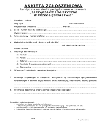 ANKIETA ZGŁOSZENIOWA kandydata na studia podyplomowe w zakresie „ZARZĄDZANIE LOGISTYCZNE W PRZEDSIĘBIORSTWIE” 1. Nazwisko i imiona: .................................................................................................... Imię ojca ...................................................................... Data urodzenia.................... Miejscowość urodzenia ........................................ PESEL ....................................... 2. Seria i numer dowodu osobistego: ............................................................................. Wydany przez ........................................................................................................... 3. Adres domowy i numer telefonu: ......................................... ...................................... ............................................................................................................................. .... 4. Wykształcenie (kierunek ukończonych studiów) ......................................................... ........................................................................... rok ukończenia studiów ................. Nazwa uczelni........................................................................................................... 5. Instytucja zatrudniająca: a) Nazwa: ............................................................................................................ b) Adres: ............................................................................................................. c) Telefon: ........................................................................................................... d) Komórka Organizacyjna (nazwa): ..................................................................... e) Stanowisko: ..................................................................................................... 6. Główny profil działalności zawodowej kandydata: ....................................................................... ...................................................................................................................................................... 7. Informacje uzupełniające: o umiejętności posługiwania się standardowym oprogramowaniem komputerowym w zakresie: edycja tekstów, arkusz kalkulacyjny, bazy danych, edytory graficzne: ........................................................... ...................................................................... ........................................................................................................................ 8. Informacje dodatkowe oraz w zakresie rezerwacji noclegów: ................................................................................................................................. Do ankiety należy dołączyć: – – – – podanie o przyjęcie na studia podyplomowe, 1 zdjęcie legitymacyjne 3x4cm, (wersja elektroniczna w jp g – na dyskietce, lub CD) odpis dyplomu ukończenia studiów (na pierwszy zjazd oryginał), kserokopię dowodu dokonanych opłat za czesne, opłaty za postępowanie rekrutacyjne. .................................., dnia ...................…. r. .............................. Podpis Kandydata