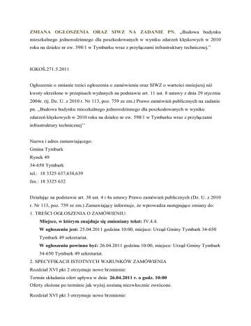 ZMIANA OG OSZENIA ORAZ SIWZ NA ZADANIE PN. „Budowa budynku mieszkalnego jednorodzinnego dla poszkodowanych w wyniku zdarze kl skowych w 2010 roku na dzia ce nr ew. 598/1 w Tymbarku wraz z przy czami infrastruktury technicznej.” IGKO .271.5.2011 Og oszenie o zmianie tre ci og oszenia o zamówieniu oraz SIWZ o warto ci mniejszej ni kwoty okre lone w przepisach wydanych na podstawie art. 11 ust. 8 ustawy z dnia 29 stycznia 2004r. (tj. Dz. U. z 2010 r. Nr 113, poz. 759 ze zm.) Prawo zamówie publicznych na zadanie pn. ,,Budowa budynku mieszkalnego jednorodzinnego dla poszkodowanych w wyniku zdarze kl skowych w 2010 roku na dzia ce nr ew. 598/1 w Tymbarku wraz z przy czami infrastruktury technicznej’’ Nazwa i adres zamawiaj cego: Gmina Tymbark Rynek 49 34-650 Tymbark tel.: 18 3325 637,638,639 fax.: 18 3325 632 Dzia aj c na podstawie art. 38 ust. 4 i 4a ustawy Prawo zamówie publicznych (Dz. U. z 2010 r. Nr 113, poz. 759 ze zm.) Zamawiaj cy informuje, e wprowadza nast puj ce zmiany do: 1. TRE CI OG OSZENIA O ZAMÓWIENIU: Miejsce, w którym znajduje si zmieniany tekst: IV.4.4. W og oszeniu jest: 25.04.2011 godzina 10:00, miejsce: Urz d Gminy Tymbark 34-650 Tymbark 49 sekretariat. W og oszeniu powinno by : 26.04.2011 godzina 10:00, miejsce: Urz d Gminy Tymbark 34-650 Tymbark 49 sekretariat. 2. SPECYFIKACJI ISTOTNYCH WARUNKÓW ZAMÓWIENIA Rozdzia XVI pkt 2 otrzymuje nowe brzmienie: Termin sk adania ofert up ywa w dniu 26.04.2011 r. o godz. 10:00 Oferty z one po terminie jak wy ej zostan niezw ocznie zwrócone. Rozdzia XVI pkt 3 otrzymuje nowe brzmienie: Otwarcie ofert nast pi w siedzibie Zamawiaj cego: Urz d Gminy Tymbark Rynek 49 34-650 Tymbark Sala konferencyjna: (I pi tro) w dniu 26.04.2011 r. o godz. 11:00 Otwarcie ofert jest jawne. Z uwagi na charakter dokonanej zmiany, nie przed a si terminu sk adania ofert, który up ywa w dniu 26 kwietnia 2011r. o godz.10.00. Og oszenie o zmianie og oszenia o zamówieniu zosta o zamieszczone w Biuletynie Zamówie Publicznych numer og oszenia: 71822 - 2011 w dniu 11 kwietnia 2011r. _______________________________________ Wójt Gminy Tymbark - mgr in . Lech Nowak Zamieszczono: na tablicy og osze w Urz dzie Gminy Tymbark na stronie internetowej pod adresem www.tymbark.pl