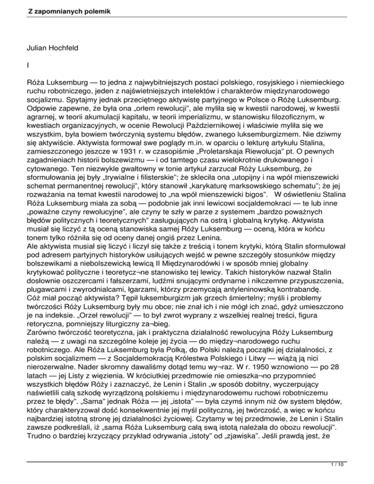 Z zapomnianych polemik Julian Hochfeld I Róża Luksemburg — to jedna z najwybitniejszych postaci polskiego, rosyjskiego i niemieckiego ruchu robotniczego, jeden z najświetniejszych intelektów i charakterów międzynarodowego socjalizmu. Spytajmy jednak przeciętnego aktywistę partyjnego w Polsce o Różę Luksemburg. Odpowie zapewne, że była ona „orłem rewolucji”, ale myliła się w kwestii narodowej, w kwestii agrarnej, w teorii akumulacji kapitału, w teorii imperializmu, w stanowisku filozoficznym, w kwestiach organizacyjnych, w ocenie Rewolucji Październikowej i właściwie myliła się we wszystkim, była bowiem twórczynią systemu błędów, zwanego luksemburgizmem. Nie dziwmy się aktywiście. Aktywista formował swe poglądy m.in. w oparciu o lekturę artykułu Stalina, zamieszczonego jeszcze w 1931 r. w czasopiśmie „Proletarskaja Riewolucja” pt. O pewnych zagadnieniach historii bolszewizmu — i od tamtego czasu wielokrotnie drukowanego i cytowanego. Ten niezwykle gwałtowny w tonie artykuł zarzucał Róży Luksemburg, że sformułowania jej były „trywialne i filisterskie”; że skleciła ona „utopijny i na wpół mienszewicki schemat permanentnej rewolucji”, który stanowił „karykaturę marksowskiego schematu”; że jej rozważania na temat kwestii narodowej to „na wpół mienszewicki bigos”. W oświetleniu Stalina Róża Luksemburg miała za sobą — podobnie jak inni lewicowi socjaldemokraci — te lub inne „poważne czyny rewolucyjne”, ale czyny te szły w parze z systemem „bardzo poważnych błędów politycznych i teoretycznych” zasługujących na ostrą i globalną krytykę. Aktywista musiał się liczyć z tą oceną stanowiska samej Róży Luksemburg — oceną, która w końcu tonem tylko różniła się od oceny danej ongiś przez Lenina. Ale aktywista musiał się liczyć i liczył się także z treścią i tonem krytyki, którą Stalin sformułował pod adresem partyjnych historyków usiłujących wejść w pewne szczegóły stosunków między bolszewikami a niebolszewicką lewicą II Międzynarodówki i w sposób mniej globalny krytykować polityczne i teoretycz¬ne stanowisko tej lewicy. Takich historyków nazwał Stalin dosłownie oszczercami i fałszerzami, ludźmi snującymi ordynarne i nikczemne przypuszczenia, plugawcami i zwyrodnialcami, łgarzami, którzy przemycają antyleninowską kontrabandę. Cóż miał począć aktywista? Tępił luksemburgizm jak grzech śmiertelny; myśli i problemy twórczości Róży Luksemburg były mu obce; nie znał ich i nie mógł ich znać, gdyż umieszczono je na indeksie. „Orzeł rewolucji” — to był zwrot wyprany z wszelkiej realnej treści, figura retoryczna, pomniejszy liturgiczny za¬bieg. Zarówno twórczość teoretyczna, jak i praktyczna działalność rewolucyjna Róży Luksemburg należą — z uwagi na szczególne koleje jej życia — do między¬narodowego ruchu robotniczego. Ale Róża Luksemburg była Polką, do Polski należą początki jej działalności, z polskim socjalizmem — z Socjaldemokracją Królestwa Polskiego i Litwy — wiążą ją nici nierozerwalne. Nader skromny dawaliśmy dotąd temu wy¬raz. W r. 1950 wznowiono — po 28 latach — jej Listy z więzienia. W króciutkiej przedmowie nie omieszka¬no przypomnieć wszystkich błędów Róży i zaznaczyć, że Lenin i Stalin „w sposób dobitny, wyczerpujący naświetlili całą szkodę wyrządzoną polskiemu i międzynarodowemu ruchowi robotniczemu przez te błędy”. „Sama” jednak Róża — jej „istota” — była czymś innym niż ów system błędów, który charakteryzował dość konsekwentnie jej myśl polityczną, jej twórczość, a więc w końcu najbardziej istotną stronę jej działalności życiowej. Czytamy w tej przedmowie, że Lenin i Stalin zawsze podkreślali, iż „sama Róża Luksemburg całą swą istotą należała do obozu rewolucji”. Trudno o bardziej krzyczący przykład odrywania „istoty” od „zjawiska”. Jeśli prawdą jest, że 1 / 10 Z zapomnianych polemik Róża „całe swe życie poświęciła sprawie wyzwolenia klasy robotniczej”, to prawdą jest również, iż życie jej w służbie socjalizmu było przede wszystkim życiem ideologa, myśliciela, teoretyka, pisarza, a nie życiem organizatora, technika pracy konspiracyjnej, parlamentarzysty, reformatora społecznego czy kogoś podobnego. „Istota” Róży Luksemburg jako rewolucjonistki za¬warta jest w dziele jej myśli, w jej twórczości pisarskiej: nie w tym zaś, że — jak czytamy w cytowanej przedmowie — zginęła w walce, ani też w tym, co rzeczywiście charakteryzuje całą aurę Listów z więzienia, mianowicie w pogodzie i w równowadze duchowej. Nieprzypadkowo jednak szukano tej „istoty” w pięknym skądinąd wyrazie przeżyć więziennych. Według słów autorów przedmowy szczególna wartość Li¬stów z więzienia miała na tym właśnie polegać, że nie¬koniecznie były one związane z działalnością rewolucyjną Róży Luksemburg (…) Lenin był — jak wiadomo — wielkim teoretycznym przeciwnikiem Róży Luksemburg. Polemiki Lenina z Różą wiążą się z najbardziej podstawowymi ideami stanowisk obojga polemistów, mają istotnie charakter polemik leninizmu z luksemburgizmem. Lenin był polemistą namiętnym i nieprzejednanym bojownikiem idei, które uważał za słuszne. Mimo wszystko jednak nie wpadało mu do głowy czynić z tych idei systemu nie podlegających dyskusji dogmatów; a już w żadnym wypadku nie wpadało mu do głowy umieszczać na indeksie twórczości swych antagonistów. „Orzeł rewolucji” — ta charakterystyka Róży Luksemburg po¬chodzi właśnie od Lenina. Ale pod jego piórem nie by- ła to retoryczna figura, choć wyjęta jest ona z pisanych w 1922 r. Uwag publicysty, negatywnie oceniających m.in. treść broszury, którą tu wydajemy po raz pierwszy w polskim przekładzie. Stwierdza bowiem Lenin w Uwagach publicysty, 