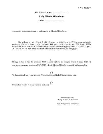 PROJEKT UCHWAŁA Nr ……………….. Rady Miasta Milanówka z dnia …………………… w sprawie: rozpatrzenia skargi na Burmistrza Miasta Milanówka Na podstawie art. 18 ust. 2 pkt 15 ustawy z dnia 8 marca 1990 r. o samorządzie gminnym (Dz. U. z 2013 r. poz. 594 poz. 645, poz. 1318 z 2014r. poz. 379 i poz. 1072) w związku z art. 229 pkt 3 Kodeksu postępowania administracyjnego (Dz. U. z 2013 r., poz. 267 oraz z 2014 r. poz. 183) - Rada Miasta Milanówka uchwala, co następuje: §1 Skargę z dnia z dnia 30 kwietnia 2015 r. (data wpływu do Urzędu Miasta 5 maja 2014 r.) zarejestrowaną pod numerem 2967/2015 – Rada Miasta Milanówka uznaje za bezzasadną. §2 Wykonanie uchwały powierza się Przewodniczącej Rady Miasta Milanówka. §3 Uchwała wchodzi w życie z dniem podjęcia. Przewodnicząca Rady Miasta Milanówka mgr Małgorzata Trębińska UZASADNIENIE Dotyczy skargi mieszkańca z dnia 30 kwietnia 2015 r. (data wpływu do Urzędu Miasta 5 maja 2014 r.) zarejestrowanej pod numerem 2967/2015. Kwestionowana przez skarżącego procedura rozpatrywania skarg znajduje pełne uzasadnienie w obowiązujących przepisach. Zgodnie z § 9 rozporządzenia Ministra Spraw Wewnętrznych i Administracji z dnia 8 stycznia 2002 r. w sprawie organizacji przyjmowania i rozpatrywania skarg i wniosków (Dz. U. Nr 5, poz. 46 ze zm.) „jeżeli rozpatrzenie skargi lub wniosku wymaga uprzedniego zbadania i wyjaśnienia sprawy, organ właściwy do rozpatrzenia skargi lub wniosku zbiera niezbędne materiały. W tym celu może zwrócić się do innych organów o przekazanie niezbędnych materiałów i wyjaśnień”. Dlatego też, w celu ustosunkowania się do zarzutów zawartych w skardze, przed zaopiniowaniem jej przez Komisję Rewizyjną Rady Miasta Milanówka i rozpatrzeniem przez Radę Miasta Milanówka skarga trafia do Burmistrza Miasta. Burmistrz odniósł się do poszczególnych zarzutów zawartych w skardze: − Informacja, o której pisze Skarżący została przygotowana w dniu 23 kwietnia 2015 r. i została oparta na faktach znanych w tym dniu Beneficjentowi – Gminie Milanówek. W dniu 2 kwietnia 2015 r. Instytucja Pośrednicząca – Ministerstwo Środowiska zatwierdziła wniosek Gminy Milanówek o wydłużenie terminu realizacji Projektu „Modernizacja i rozbudowa systemu infrastruktury wodociągowo – kanalizacyjnej Gminy Milanówek” do 31 grudnia 2015 r. oraz o zwiększenie kwoty kosztu całkowitego Projektu do 39.867.138,67 zł i kwoty dofinansowania do 21.137.601,14 zł. Jednocześnie IP wyraziła zgodę na przedłużenie terminu uzyskania efektu ekologicznego do dnia 30 czerwca 2016 r. Aneks nr 3 do Umowy o dofinansowanie został podpisany pomiędzy Wojewódzkim Funduszem Ochrony Środowiska i Gospodarki Wodnej w Warszawie w dniu 11 maja 2015 r. − Zwiększona wartość całkowitych kosztów Projektu obejmuje również wydatki na modernizację ujęć wody przy ulicy Sportowej i budowę Stacji Uzdatniania Wody przy ul. Na Skraju. − Aktualne rozwiązanie projektowe Stacji Uzdatniania Wody obejmuje czerpanie wody z istniejących ujęć na terenie kąpieliska miejskiego przy ul. Sportowej i tłoczenie do hali produkcyjnej, która powstanie przy ul. Na Skraju. Tam też znajdują się wymagające remontu zbiorniki wody uzdatnionej. Wszystkie decyzje administracyjne wymagane przepisami Prawa budowlanego i Prawa wodnego odnoszą się do kompleksowej inwestycji modernizacji istniejących ujęć wody przy ul. Sportowej oraz Stacji Uzdatniania Wody przy ul. Na Skraju. Wykonawca Wodropol S.A. ma zaprojektować i wykonać całość przedmiotowego zadania inwestycyjnego. − Prezes WFOŚiGW w Warszawie w ostatnim zdaniu na stronie nr 1 swojego pisma jednoznacznie stwierdza, że inne zadania (poza SUW) w ramach Projektu zostały zrealizowane w całości. Mając na uwadze powyższe Rada Miasta Milanówka uznaje skargę za bezzasadną. Pouczenie: Zgodnie z art. 239 § 1k.p.a. w przypadku gdy skarga, w wyniku jej rozpatrzenia, została uznana za bezzasadną i jej bezzasadność wykazano w odpowiedzi na skargę, a skarżący ponowił skargę bez wskazania nowych okoliczności - organ właściwy do jej rozpatrzenia może podtrzymać swoje poprzednie stanowisko z odpowiednią adnotacją w aktach sprawy - bez zawiadamiania skarżącego.