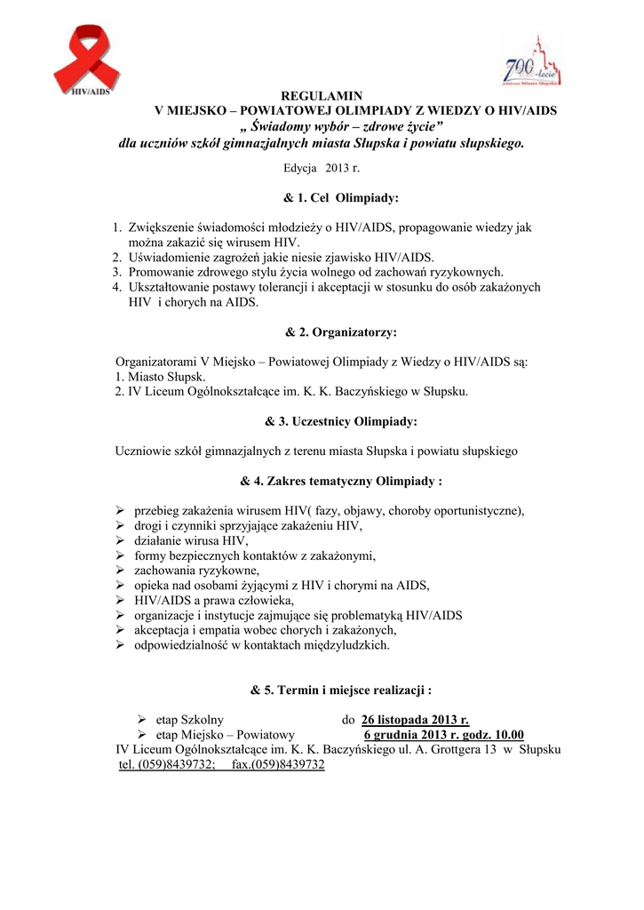 REGULAMIN V MIEJSKO – POWIATOWEJ OLIMPIADY Z WIEDZY O HIV/AIDS „ Świadomy wybór – zdrowe życie” dla uczniów szkół gimnazjalnych miasta Słupska i powiatu słupskiego. Edycja 2013 r. & 1. Cel Olimpiady: 1. Zwiększenie świadomości młodzieży o HIV/AIDS, propagowanie wiedzy jak można zakazić się wirusem HIV. 2. Uświadomienie zagrożeń jakie niesie zjawisko HIV/AIDS. 3. Promowanie zdrowego stylu życia wolnego od zachowań ryzykownych. 4. Ukształtowanie postawy tolerancji i akceptacji w stosunku do osób zakażonych HIV i chorych na AIDS. & 2. Organizatorzy: Organizatorami V Miejsko – Powiatowej Olimpiady z Wiedzy o HIV/AIDS są: 1. Miasto Słupsk. 2. IV Liceum Ogólnokształcące im. K. K. Baczyńskiego w Słupsku. & 3. Uczestnicy Olimpiady: Uczniowie szkół gimnazjalnych z terenu miasta Słupska i powiatu słupskiego & 4. Zakres tematyczny Olimpiady : przebieg zakażenia wirusem HIV( fazy, objawy, choroby oportunistyczne), drogi i czynniki sprzyjające zakażeniu HIV, działanie wirusa HIV, formy bezpiecznych kontaktów z zakażonymi, zachowania ryzykowne, opieka nad osobami żyjącymi z HIV i chorymi na AIDS, HIV/AIDS a prawa człowieka, organizacje i instytucje zajmujące się problematyką HIV/AIDS akceptacja i empatia wobec chorych i zakażonych, odpowiedzialność w kontaktach międzyludzkich. & 5. Termin i miejsce realizacji : etap Szkolny do 26 listopada 2013 r. etap Miejsko – Powiatowy 6 grudnia 2013 r. godz. 10.00 IV Liceum Ogólnokształcące im. K. K. Baczyńskiego ul. A. Grottgera 13 w Słupsku tel. (059)8439732; fax.(059)8439732 & 6. Przebieg Olimpiady: Etap Szkolny – dyrektor szkoły wyznacza osobę odpowiedzialną za eliminacje szkolne; Do zadań na tym etapie należy: zapoznanie uczniów z regulaminem Olimpiady, ustalenie trybu i sposobu przeprowadzenia eliminacji szkolnych, ułatwienie uczestnikom olimpiady dostępu do materiałów informacyjnych; do dnia 28 listopada 2013 r. do godz. 15.00 organizator zgłasza zwycięzców (dwie osoby ) z etapu Szkolnego organizatorowi etapu Miejsko – Powiatowego) drogą e-mailową tel. (059)8439732; e-mail: [email protected] Etap Miejsko – Powiatowy/FINAŁOWY/ Do zadań organizatorów należy: opracowanie testu wiedzy, powołanie Jury do oceny testów, przeprowadzenie Olimpiady na etapie Miejsko – Powiatowym, zorganizowanie podsumowania Olimpiady i wręczenie nagród ufundowanych przez Prezydenta Miasta Słupska, opublikowanie listy laureatów Olimpiady, & 7. Punktacja: 1. Testy na etapie powiatowym oceniane będą anonimowo. W tym celu uczestnicy Olimpiady otrzymują opieczętowana kartkę odpowiedzi / test/ oraz kopertę i kartkę, na której należy wpisać swoje dane. Na karcie odpowiedzi i na kopercie należy wpisać wylosowany numer stolika. Kartkę z danymi należy włożyć do koperty, zakleić i oddać razem z testem. 2. Ustala się następujące zasady punktacji: za każdą prawidłową odpowiedź ( pytanie zamknięte) uczestnik otrzyma 1 punkt, za pytanie otwarte uczestnik otrzymuje 1 punkt za każdą prawidłową odpowiedź, za odpowiedź nieprawidłową, niepełną/ cząstkową lub jej brak 0 punktów o zajętym miejscu decyduje łączna suma punktów za test . & 8. Ogłoszenie wyników testy zostaną ocenione przez Jury powołane przez organizatora Olimpiady – w razie wątpliwości głos decydujący ma przewodniczący Jury, Jury nagrodzi indywidualnie 3 uczestników z najwyższą liczbą punktów z terenu Miasta Słupska i 3 uczestników z powiatu słupskiego, wyniki V Miejsko – Powiatowej Olimpiady Wiedzy o HIV/AIDS ogłoszone w dniu olimpiady i opublikowane na stronie internetowej organizatorów www.slupsk.pl , www.4lo.slupsk.pl. & 9. Jury Olimpiady Uczestnicy olimpiady będą oceniani przez 5 osobowe Jury, powołane przez organizatora. Przewodniczący Jury, przed rozpoczęciem eliminacji, zapoznaje uczestników z regulaminem Etapu Powiatowego Olimpiady, Jury ustala wyniki uzyskane przez uczestników według punktacji przyjętej w punkcie 7 przedmiotowego regulaminu. Jury zamieszcza wyniki konkursu na stronach internetowych organizatorów. Jury sporządza protokół stanowiący załącznik do protokołu z przebiegu olimpiady; pod protokołem podpisy składają wszyscy członkowie Jury. W przypadku powstania wątpliwości związanych z przebiegiem Olimpiady, głos rozstrzygający Przewodniczący Jury, interpretacja musi być zgodna z regulaminem Olimpiady & 10. Nagrody Nagrody indywidualne otrzymują 3 osoby z największą liczbą punktów z miasta Słupska i 3 osoby z najwyższą liczbą punktów z powiatu słupskiego. Wszyscy uczestnicy V Miejsko – Powiatowej Olimpiady Wiedzy o HIV/AIDS otrzymają dyplomy za udział w Olimpiadzie. Nagrody zostaną wręczone w dniu olimpiady tj.6 grudnia 2013 r. Podczas oczekiwania na wyniki zapraszamy uczestników olimpiady i ich opiekunów na lekcje otwarte, pokazy fitness, prezentację zainteresowań uczniów naszej szkoły. & 11. Ustalenia końcowe Organizatorzy nie zapewniają pokrycia kosztów przejazdu, Materiały dotyczące problematyki HIV/AIDS dostępne są na stronie www.aids.gov.pl , inne materiały typu ulotki, broszury można uzyskać od pielęgniarek szkolnych oraz pracowników Powiatowej Stacji Sanitarno – Epidemiologicznej w Słupsku, Regulamin V Miejsko – Powiatowej Olimpiady z wiedzy o HIV/AIDS wraz z załącznikami dostępny jest na stronie IV LO www.4lo.slupsk.pl , Przystąpienie do Olimpiady jest równoznaczne ze zgodą na publikację danych osobowych na stronach internetowych organizatorów oraz w lokalnych środkach masowego przekazu. & 12. Załącznik Zgłoszenie uczestnika do etapu powiatowego, Zgoda przedstawiciela ustawowego dziecka ,które nie ukończyło 18 lat na udział w Olimpiadzie( należy dostarczyć wraz ze zgłoszeniem lub w dniu olimpiady). Organizatorzy V Miejsko – Powiatowej Olimpiady Wiedzy o HIV/AIDS Słupsk dnia …............................ Zgoda przedstawiciela ustawowego dziecka, które nie u