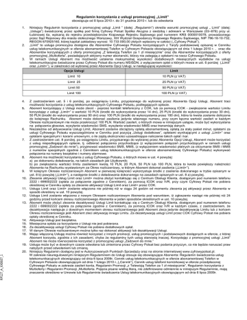 RP127_A_XX0607_1 Regulamin korzystania z usługi promocyjnej „Limit” obowiązuje od 8 lipca 2010 r. do 31 grudnia 2010 r. lub do odwołania 1. 2. 3. 4. 5. 6. 7. 8. 9. 10. 11. 12. 13. 14. 15. 16. 17. 18. 19. 20. Niniejszy Regulamin korzystania z promocyjnej usługi „Limit ” (dalej: „Regulamin”) określa warunki promocyjnej usługi „ Limit” (dalej: „Usługa”) świadczonej przez spółkę pod firmą Cyfrowy Polsat Spółka Akcyjna z siedzibą i adresem w Warszawie (03–878) przy ul. Łubinowej 4a, wpisaną do rejestru przedsiębiorców Krajowego Rejestru Sądowego pod numerem KRS 0000010078, prowadzonego przez Sąd Rejonowy dla miasta stołecznego Warszawy, XIII Wydział Gospodarczy Krajowego Rejestru Sądowego, NIP 796-18-10-732, REGON 670925160, której kapitał zakładowy wynosi: 10 733 000,00 złotych wpłacony w całości (,,Cyfrowy Polsat”). „Limit” to usługa promocyjna dostępna dla Abonentów Cyfrowego Polsatu korzystających z Taryfy podstawowej opisanej w Cenniku usług telekomunikacyjnych w ofercie abonamentowej Telefon w Cyfrowym Polsacie obowiązującym od dnia 1 lutego 2010 r. , oraz dla Abonentów korzystających z oferty promocyjnej „Z telewizją Telefon za 1 zł miesięcznie” oraz dla Abonentów korzystających z oferty promocyjnej „Multioferta”, posiadających aktywny numer abonencki, którzy nie zalegają z opłatami na rzecz Cyfrowego Polsatu. W ramach Usługi Abonent ma możliwość ustalenia maksymalnej wysokości dodatkowych miesięcznych wydatków na usługi telekomunikacyjne świadczone przez Cyfrowy Polsat dla numeru MSISDN, z wyłączeniem opłat o których mowa w ust. 6 poniżej („Limit” oraz „Limit+”), w zależności od wybranej przez Abonenta Opcji Usługi, w następującej wysokości: Opcja Usługi Limit Limit 10 10 PLN (z VAT) Limit 25 25 PLN (z VAT) Limit 50 50 PLN (z VAT) Limit 100 100 PLN (z VAT) Z zastrzeżeniem ust. 5 i 6 poniżej, po osiągnięciu Limitu, przypisanego do wybranej przez Abonenta Opcji Usługi, Abonent traci możliwość korzystania z usług telekomunikacyjnych Cyfrowego Polsatu, podlegających opłacie. Abonent korzystający z Usługi może zlecić - poprzez kontakt telefoniczny z COK, lub za pomocą ICOK - zwiększenie wartości Limitu korzystając z usługi „Limit+” o wartość 10 PLN (środki do wykorzystania przez 14 dni), 25 PLN (środki do wykorzystania przez 30 dni), 50 PLN (środki do wykorzystania przez 90 dni) oraz 100 PLN (środki do wykorzystania przez 180 dni), która to kwota zostanie doliczona do kolejnego Rachunku. Abonent może dokonać zasilenia jedynie własnego numeru, przy czym łączna wartość zasileń w każdym Okresie rozliczeniowym nie może przekroczyć 100 PLN. Wartość zasileń, o których mowa w niniejszym ustępie, może być wykorzystana na połączenia głosowe, wysyłanie wiadomości SMS, wysyłanie wiadomości MMS oraz transmisję danych. Niezależnie od aktywowania Usługi Limit, Abonent zostanie obciążony opłatą abonamentową, opłatą za stały pakiet minut, opłatami za usługi Cyfrowego Polsatu wyszczególnione w Cenniku pod pozycją „Usługi dodatkowe”, opłatami wynikającymi z usługi „Limit+” oraz opłatami specjalnymi i karami umownymi, o ile zajdą okoliczności uzasadniające naliczenie takich opłat i kar. Z zastrzeżeniem ust. 8 poniżej, po osiągnięciu Limitu, przypisanego do wybranej przez Abonenta Opcji Usługi, Abonent może korzystać z usług niepodlegających opłacie, tj. odbierać połączenia przychodzące (z wyłączeniem połączeń przychodzących w ramach usługi promocyjnej „Zadzwoń do mnie”), przyjmować wiadomości SMS, MMS, (z wyłączeniem wiadomości płatnych za otrzymanie SMS i MMS z numerów specjalnych zgodnie z Cennikiem usług telekomunikacyjnych w ofercie abonamentowej Cyfrowego Polsatu) wykonywać połączenia na numery bezpłatne i numery alarmowe. Abonent ma możliwość korzystania z usług Cyfrowego Polsatu, o których mowa w ust. 4 powyżej: a) po dokonaniu doładowania, na takich zasadach jak Użytkownik; b) po zwiększeniu wartości limitu zasileniem kwotą 10 PLN, 20 PLN, 50 PLN lub 100 PLN, która to kwota powiększy należności Abonenta na Rachunku wystawionym za Okres rozliczeniowy, w którym Abonent dokonał zasilenia („Limit+”). W kolejnym Okresie rozliczeniowym Abonent w pierwszej kolejności wykorzystuje środki z zasilenia dokonanego w trybie opisanym w ust. 8 b) powyżej („Limit+”), a następnie środki z doładowania dokonanego na zasadach opisanych w ust. 8 a) powyżej. Zlecenie aktywacji Usług Limit oraz Limit+ można złożyć kontaktując się z Centrum Obsługi Klienta, dostępnym pod numerem telefonu 2222 i 699002222 (opłata za połączenie zgodnie z Cennikiem), za pomocą ICOK oraz IVR, przy czym Cyfrowy Polsat nie pobiera określonej w Cenniku opłaty za zlecenie aktywacji Usługi Limit oraz Limit+ przez COK. Usługa Limit oraz Limit+ zostanie włączona nie później niż w ciągu 24 godzin od momentu zlecenia jej aktywacji przez Abonenta w sposób określony w ust. 10 powyżej. Usługa Limit zostanie włączona z nowym Okresem rozliczeniowym Abonenta pod warunkiem, iż zgłoszenie nastąpi nie później niż 24 godziny przed końcem okresu rozliczeniowego Abonenta w jeden sposobów określonych w ust. 10 powyżej. Abonent może złożyć zlecenie dezaktywacji Usługi Limit kontaktując się z Centrum Obsługi Klienta, dostępnym pod numerem telefonu 2222 i 699002222 (opłata za połączenie zgodnie z Cennikiem), za pomocą ICOK oraz IVR w każdym czasie, z zastrzeżeniem, że dezaktywacja następuje z dowolnym momentem okresu rozliczeniowego jeśli Abonent zleca jedynie dezaktywację Limitu lub z końcem Okresu rozliczeniowego jeśli Abonent zleci aktywację innego Limitu. Za dezaktywację usługi Limit przez COK Cyfrowy Polsat nie pobiera opłaty określonej w Cenniku. Aktywacja Usługi jest bezpłatna. Miesięczna opłata za korzystanie z Usługi nie jes