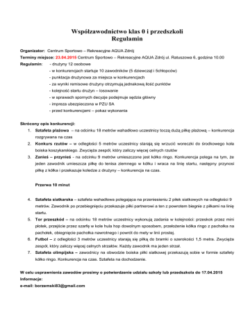 Współzawodnictwo klas 0 i przedszkoli Regulamin Organizator: Centrum Sportowo – Rekreacyjne AQUA Zdrój Terminy miejsce: 23.04.2015 Centrum Sportowo – Rekreacyjne AQUA Zdrój ul. Ratuszowa 6, godzina 10.00 Regulamin: - drużyny 12 osobowe - w konkurencjach startuje 10 zawodników (5 dziewcząt i 5chłopców) - punktacja drużynowa za miejsca w konkurencjach - za wyniki remisowe drużyny otrzymują jednakową ilość punktów - kolejność startu drużyn – losowanie - w sprawach spornych decyzje podejmuje sędzia główny - impreza ubezpieczona w PZU SA - przed konkurencjami – pokaz wykonania Skrócony opis konkurencji: 1. Sztafeta plażowa – na odcinku 18 metrów wahadłowo uczestnicy toczą dużą piłkę plażową – konkurencja rozgrywana na czas 2. Konkurs rzutów – w odległości 5 metrów uczestnicy starają się wrzucić woreczki do środkowego koła boiska koszykarskiego. Zwycięża zespół, który zaliczy więcej celnych rzutów 3. Zanieś – przynieś - na odcinku 9 metrów umieszczone jest kółko ringo. Konkurencja polega na tym, że jeden zawodnik umieszcza piłkę do tenisa ziemnego w kółku i wraca na linię startu, następny przynosi piłkę z kółka i przekazuje koledze z drużyny – konkurencja na czas. Przerwa 10 minut 4. Sztafeta siatkarska – sztafeta wahadłowa polegająca na przeniesieniu 2 piłek siatkowych na odległości 9 metrów. Zawodnik po przebiegnięciu przekazuje piłki partnerowi a ten z powrotem biegnie z piłkami na linię startu. 5. Tor przeszkód – na odcinku 18 metrów uczestnicy wykonują zadania w kolejności: przeskok przez mini płotek, przejście przez szarfę w kole hula hop dowolnym sposobem, przełożenie kółka ringo z pachołka na pachołek, obiegnięcie pachołka nawrotnego i powrót do mety w linii prostej. 6. Futbol – z odległości 3 metrów uczestnicy starają się piłką do bramki o szerokości 1,5 metra. Zwycięża zespół, który zaliczy więcej celnych strzałów. Każdy zawodnik ma jeden strzał. 7. Sztafeta olimpijska – zawodnicy na obwodzie boiska piłki siatkowej przekazują sobie w formie sztafety kółko ringo. Konkurencja na czas. Sztafeta na dochodzenie. W celu usprawnienia zawodów prosimy o potwierdzenie udziału szkoły lub przedszkola do 17.04.2015 Informacje: e-mail: [email protected]