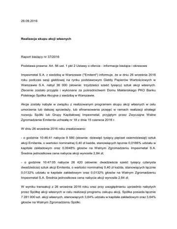 Impexmetal S.A. z siedzibą w Warszawie ("Emitent") informuje, że w dniu 26 września 2016