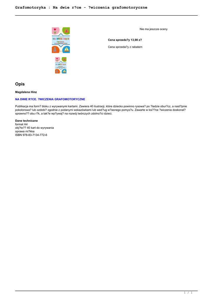 Grafomotoryka : Na dwie r?ce - ?wiczenia grafomotoryczne Nie ma jeszcze oceny Cena sprzeda?y 13,90 z? Cena sprzeda?y z rabatem Opis Magdalena Hinz NA DWIE R?CE. ?WICZENIA GRAFOMOTORYCZNE Publikacja ma form? bloku z wyrywanymi kartami. Zawiera 40 ilustracji, które dziecko powinno rysowa? po ?ladzie obur?cz, a nast?pnie pokolorowa? lub ozdobi? zgodnie z podanymi wskazówkami lub wed?ug w?asnego pomys?u. Zawarte w ksi??ce ?wiczenia doskonal? sprawno?? obu r?k, a tak?e wp?ywaj? na rozwój twórczych zdolno?ci dzieci. Dane techniczne format A4 obj?to?? 40 kart do wyrywania oprawa mi?kka ISBN 978-83-7134-772-6 1 / 1 Powered by TCPDF (www.tcpdf.org)