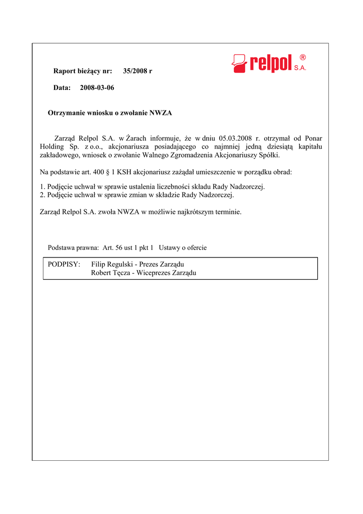 Raport bieżący nr: Data: 35/2008 r 2008-03-06 Otrzymanie wniosku o zwołanie NWZA Zarząd Relpol S.A. w Żarach informuje, że w dniu 05.03.2008 r. otrzymał od Ponar Holding Sp. z o.o., akcjonariusza posiadającego co najmniej jedną dziesiątą kapitału zakładowego, wniosek o zwołanie Walnego Zgromadzenia Akcjonariuszy Spółki. Na podstawie art. 400 § 1 KSH akcjonariusz zażądał umieszczenie w porządku obrad: 1. Podjęcie uchwał w sprawie ustalenia liczebności składu Rady Nadzorczej. 2. Podjęcie uchwał w sprawie zmian w składzie Rady Nadzorczej. Zarząd Relpol S.A. zwoła NWZA w możliwie najkrótszym terminie. Podstawa prawna: Art. 56 ust 1 pkt 1 Ustawy o ofercie PODPISY: Filip Regulski - Prezes Zarządu Robert Tęcza - Wiceprezes Zarządu
