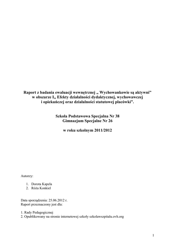 Raport z badania ewaluacji wewnętrznej „ Wychowankowie są aktywni” w obszarze I„ Efekty działalności dydaktycznej, wychowawczej i opiekuńczej oraz działalności statutowej placówki”. Szkoła Podstawowa Specjalna Nr 38 Gimnazjum Specjalne Nr 26 w roku szkolnym 2011/2012 Autorzy: 1. Dorota Kapela 2. Róża Konkiel Data sporządzenia: 25.06.2012 r. Raport przeznaczony jest dla: 1. Rady Pedagogicznej 2. Opublikowany na stronie internetowej szkoły szkolawszpitalu.ovh.org 1 1. OBSZAR EWALUACJI Efekty działalności dydaktycznej, wychowawczej i opiekuńczej oraz działalności statutowej placówki”. 2. CEL EWALUACJI Zwiększenie aktywności uczniów poprzez różnorodność oferty szkoły. 3. WYMAGANIA PODDANE EWALUACJI Uczniowie są aktywni. 4. OPIS EWALUACJI 4.1. Pytania kluczowe 1. Czy nauczyciele znają zainteresowania i pasje uczniów? 2. Czy wszyscy uczniowie mogą korzystać z zajęć? 3. Czy szkoła stwarza warunki do kreatywnej pracy uczniów? 4. Czy baza dydaktyczna szkoły zapewnia uczniom możliwość aktywnego uczestnictwa w zajęciach? 5. W jaki sposób uczniowie mogą wykazać się własną inicjatywą? 6. Jak uczniowie oceniają atrakcyjność zajęć? 4.2. METODY BADAWCZE Ankiety dla uczniów zawierające pytania zamknięte i otwarte. Analiza dokumentacji, wyników konkursów, wytworów uczniów, wywiad z uczniami, obserwacja zajęć, lekcji oraz innych działań. 2 5. OPIS DANYCH (Analiza ilościowa) Badanie zostało przeprowadzone w warunkach szkolno – szpitalnych. Ankietowani byli uczniowie oraz nauczyciele. Wywiad został przeprowadzony z uczniami. Podczas badania nie było przeszkód technicznych. W analizowaniu zebranych danych brali udział wszyscy członkowie zespołu ds. ewaluacji. Nauczyciele i wychowawcy motywują uczniów-pacjentów do podejmowania aktywności na rzecz własnego rozwoju. Okres badania: II – V.2012r. Próba badawcza: 5 uczniów-pacjentów Wnioski z badania za pomocą kwestionariusza wywiadu przeprowadzonego wśród uczniówpacjentów klas IV-VI SP oraz gimnazjum Uczniowie przebywający na hospitalizacji mają różnorodne zainteresowania. Największy odsetek to uczniowie z zainteresowaniami plastycznymi. Szczegółowo przedstawia to wykres poniżej. Zdaniem wszystkich uczniów do rozwijania własnych zainteresowań zachęcani są przez rodziców lub rodzeństwo. Jednocześnie 80% badanych wskazało, że nauczyciele i wychowawcy szkoły przyszpitalnej zachęcają do nauki i aktywności w czasie zajęć pozalekcyjnych i jest ona miejscem, w którym uczniowie mogą rozwijać swoje talenty. 3 Do aktywności i rozwoju talentów nauczyciele zachęcają poprzez: Według uczniów zajęcia lekcyjne i wychowawcze w szkole przyszpitalnej są atrakcyjne i ciekawe. Okres badania: II – V.2012r. Próba badawcza: 10 nauczycieli i wychowawców Wnioski z przeprowadzonej ankiety z nauczycielami. Wszyscy ankietowani nauczyciele i wychowawcy szkoły przyszpitalnej znają możliwości edukacyjne oraz zainteresowania i pasje swoich uczniów-pacjentów (90% badanych w odniesieniu do większości uczniów, a 10% w odniesieniu do wszystkich). Wśród nauczycieli i wychowawców istnieją różnorodne sposoby rozpoznawania możliwości i zainteresowań uczniów i wychowanków. 4 Sposoby rozpoznawania przez nauczycieli możliwości i zainteresowań uczniów i wychowanków Z przeprowadzonych badań wynika, że nauczyciele i wychowawcy potrafią zachęcić uczniów do rozwijania swoich możliwości i talentów, na co wskazało 50% respondentów, 20% udaje się to czasami, a 30% zachęca tylko niektórych małych pacjentów. Nauczyciele i wychowawcy motywują uczniów do pełnego wykorzystania swoich możliwości poprzez: 5 Baza szkoły zapewnia uczniom możliwość aktywnego uczestnictwa w zajęciach. Na terenie oddziałów funkcjonują świetlice wyposażone w niezbędne pomoce dydaktyczne i plastyczne. Do dyspozycji uczniów jest laptop oraz trzy stacjonarne komputery z łączem internetowym. W szkole organizowane są zajęcia z biblioterapii, które pozwalają na rozwój zainteresowań książką. Uczniowie są aktywni w czasie zajęć lekcyjnych i pozalekcyjnych Okres badania: X.2011 – I.2012r. Próba badawcza: 20 uczniów klas IV-VI SP oraz gimnazjum Z przeprowadzonych badań wynika, że wszyscy uczniowie chętnie uczestniczą w zajęciach lekcyjnych i pozalekcyjnych w szkole przyszpitalnej. Mają również możliwość zaproponowania tematu na lekcję lub zajęcia wychowawcze, co potwierdziło 90% badanych. Nasi uczniowie mogą w czasie lekcji w pełni wykazać się swoją wiedzą i umiejętnościami (100% respondentów). Wszyscy badani potwierdzili, że są zachęcani do pracy przez nauczycieli i wychowawców. Szkoła posiada bogatą ofertę zajęć pozalekcyjnych, a 75% badanych wykazało jej pełną znajomość. Wymiernym elementem aktywności uczniów jest ich udział w konkursach wewnątrzszkolnych i pozaszkolnych oraz różnorodnych imprezach okolicznościowych. Wyniki badań wskazały, że 60% respondentów bierze udział w takich konkursach, a 65% uczestniczy w rozmaitych wydarzeniach i imprezach okolicznościowych. ANALIZA WYNIKÓW KONKURSÓW • ogólnopolski konkurs plastyczno – literacki „Pozdrowienia znad morza” – II i III miejsce oraz 2 wyróżnienia za oryginalny i ciekawy plastycznie projekt kartki; • konkurs literacko-plastyczny -„Magia Świąt Bożego Narodzenia”, I i II miejsce; • ogólnopolski konkurs matematyczny „Oryginalna Karta Pracy” – I miejsce na poziomie szkoły podstawowej, III miejsce na poziomie gimnazjum; • VII Wojewódzki Konkurs Plastyczny ”Zapraszamy Europę na Euro 2012” - nagroda specjalna Dyrektora Przyszpitalnego Zespołu Kształcenia Specjalnego w Wejherowie oraz III miejsce; • konkurs literacko-plastyczny dla szkół przyszpitalnych „O czym szumi morze?” Słupsk - III miejsce 6 ANALIZA JAKOŚCIOWA. WNIOSKI W oparciu o wyniki przeprowadzonych ankiet oraz wywiadu z uczniami nal