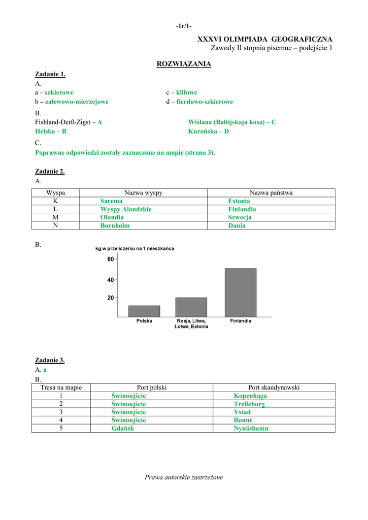 -1r/1- XXXVI OLIMPIADA GEOGRAFICZNA Zawody II stopnia pisemne – podejście 1 ROZWIĄZANIA Zadanie 1. A. a – szkierowe b – zalewowo-mierzejowe c – klifowe d – fierdowo-szkierowe B. Fishland-Derß-Zigst – A Helska – B Wiślana (Bałtijskaja kosa) – C Kurońska – D C. Poprawne odpowiedzi zostały zaznaczone na mapie (strona 3). Zadanie 2. A. Wyspa K L M N Nazwa wyspy Sarema Wyspy Alandzkie Olandia Bornholm Nazwa państwa Estonia Finlandia Szwecja Dania B. Zadanie 3. A. a B. Trasa na mapie 1 2 3 4 5 Port polski Świnoujście Świnoujście Świnoujście Świnoujście Gdańsk Prawa autorskie zastrzeżone Port skandynawski Kopenhaga Trelleborg Ystad Rønne Nynäshamn -1r/2- Zadanie 4. P F X Morze Bałtyckie jest zaliczane do mórz słonawych (mezohalinowych) o średnim zasoleniu 7‰. X Poziom wód w Morzu Bałtyckim jest wyższy niż w Oceanie Atlantyckim. X Morze Bałtyckie jest nazywane przez niektóre narody „morzem wschodnim”. X X Niskie zasolenie sprawia, że Morze Bałtyckie ma wyjątkowo bogate życie biologiczne. Nerpy – foki obrączkowane występujące pospolicie w Morzu Białym, a także w południowej części Morza Bałtyckiego, żyją również w jeziorach Ładoga i Saimaa jako relikt epoki lodowcowej. X X Morze Bałtyckie powstało już w mezozoiku, o czym świadczą znajdowane na jego brzegu bursztyny datowane na 40 mln lat. X Planuje się objęcie fok bałtyckich całkowitą ochroną gatunkową. X Na Morzu Bałtyckim nie występuje pak lodowy. X Maksymalna głębokość Morza Bałtyckiego jest większa niż 500 m. X W farmach morskich w Zatoce Botnickiej prowadzi się intensywną hodowlę łososia. UE wprowadza okresowe zakazy połowu dorszy na Morzu Bałtyckim z powodu przełowienia ich ławic. Zadanie 5. Etap rozwoju 4 3 2 5 1 Wiek – początek (tys. lat temu) 1,0 8,5 9,5 10,3 13,0 Prawa autorskie zastrzeżone Przyczyna B A E D C -1r/3- Prawa autorskie zastrzeżone