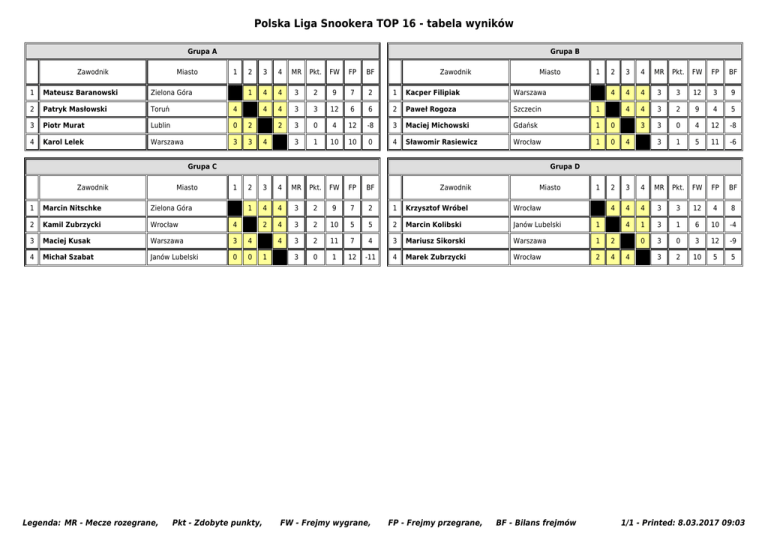 Polska Liga Snookera TOP 16 - tabela wyników Grupa A Zawodnik Miasto Grupa B 1 2 3 4 MR Pkt. FW FP BF 1 4 4 3 2 9 7 2 1 Kacper Filipiak Warszawa 4 4 3 3 12 6 6 2 Paweł Rogoza Szczecin 1 2 3 0 4 12 -8 3 Maciej Michowski Gdańsk 1 0 3 1 10 10 0 4 Sławomir Rasiewicz Wrocław 1 0 4 1 2 3 4 1 Mateusz Baranowski Zielona Góra 2 Patryk Masłowski Toruń 4 3 Piotr Murat Lublin 0 2 4 Karol Lelek Warszawa 3 3 4 Zawodnik Miasto Grupa C Zawodnik Miasto 2 3 4 MR Pkt. FW FP BF 4 4 4 3 3 12 3 9 4 4 3 2 9 4 5 3 3 0 4 12 -8 3 1 5 11 -6 4 MR Pkt. FW FP BF 4 4 3 3 12 4 8 4 1 3 1 6 10 -4 0 3 0 3 12 -9 3 2 10 5 5 Grupa D 1 2 3 4 MR Pkt. FW FP BF 1 4 4 3 2 9 7 2 1 Krzysztof Wróbel Wrocław 2 4 3 2 10 5 5 2 Marcin Kolibski Janów Lubelski 1 4 3 2 11 7 4 3 Mariusz Sikorski Warszawa 1 2 3 0 1 12 -11 4 Marek Zubrzycki Wrocław 2 4 1 Marcin Nitschke Zielona Góra 2 Kamil Zubrzycki Wrocław 4 3 Maciej Kusak Warszawa 3 4 4 Michał Szabat Janów Lubelski 0 0 Legenda: MR - Mecze rozegrane, 1 Pkt - Zdobyte punkty, 1 FW - Frejmy wygrane, Zawodnik FP - Frejmy przegrane, Miasto BF - Bilans frejmów 4 1/1 - Printed: 8.03.2017 09:03