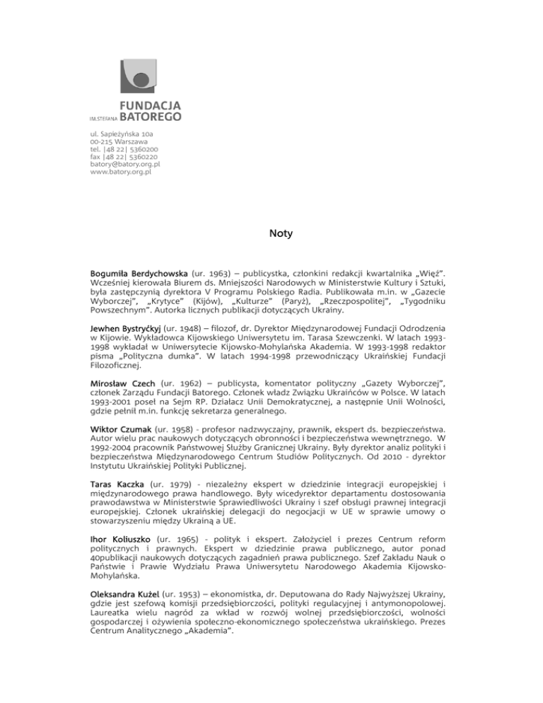 ul. Sapieżyńska 10a 00-215 Warszawa tel. |48 22| 5360200 fax |48 22| 5360220 [email protected] www.batory.org.pl Noty Bogumiła Berdychowska (ur. 1963) – publicystka, członkini redakcji kwartalnika „Więź”. Wcześniej kierowała Biurem ds. Mniejszości Narodowych w Ministerstwie Kultury i Sztuki, była zastępczynią dyrektora V Programu Polskiego Radia. Publikowała m.in. w „Gazecie Wyborczej”, „Krytyce” (Kijów), „Kulturze” (Paryż), „Rzeczpospolitej”, „Tygodniku Powszechnym”. Autorka licznych publikacji dotyczących Ukrainy. Jewhen Bystryćkyj (ur. 1948) – filozof, dr. Dyrektor Międzynarodowej Fundacji Odrodzenia w Kijowie. Wykładowca Kijowskiego Uniwersytetu im. Tarasa Szewczenki. W latach 19931998 wykładał w Uniwersytecie Kijowsko-Mohylańska Akademia. W 1993-1998 redaktor pisma „Polityczna dumka”. W latach 1994-1998 przewodniczący Ukraińskiej Fundacji Filozoficznej. Mirosław Czech (ur. 1962) – publicysta, komentator polityczny „Gazety Wyborczej”, członek Zarządu Fundacji Batorego. Członek władz Związku Ukraińców w Polsce. W latach 1993-2001 poseł na Sejm RP. Działacz Unii Demokratycznej, a następnie Unii Wolności, gdzie pełnił m.in. funkcję sekretarza generalnego. Wiktor Czumak (ur. 1958) - profesor nadzwyczajny, prawnik, ekspert ds. bezpieczeństwa. Autor wielu prac naukowych dotyczących obronności i bezpieczeństwa wewnętrznego. W 1992-2004 pracownik Państwowej Służby Granicznej Ukrainy. Były dyrektor analiz polityki i bezpieczeństwa Międzynarodowego Centrum Studiów Politycznych. Od 2010 - dyrektor Instytutu Ukraińskiej Polityki Publicznej. Taras Kaczka (ur. 1979) - niezależny ekspert w dziedzinie integracji europejskiej i międzynarodowego prawa handlowego. Były wicedyrektor departamentu dostosowania prawodawstwa w Ministerstwie Sprawiedliwości Ukrainy i szef obsługi prawnej integracji europejskiej. Członek ukraińskiej delegacji do negocjacji w UE w sprawie umowy o stowarzyszeniu między Ukrainą a UE. Ihor Koliuszko (ur. 1965) - polityk i ekspert. Założyciel i prezes Centrum reform politycznych i prawnych. Ekspert w dziedzinie prawa publicznego, autor ponad 40publikacji naukowych dotyczących zagadnień prawa publicznego. Szef Zakładu Nauk o Państwie i Prawie Wydziału Prawa Uniwersytetu Narodowego Akademia KijowskoMohylańska. Oleksandra Kużel (ur. 1953) – ekonomistka, dr. Deputowana do Rady Najwyższej Ukrainy, gdzie jest szefową komisji przedsiębiorczości, polityki regulacyjnej i antymonopolowej. Laureatka wielu nagród za wkład w rozwój wolnej przedsiębiorczości, wolności gospodarczej i ożywienia społeczno-ekonomicznego społeczeństwa ukraińskiego. Prezes Centrum Analitycznego „Akademia”. Oleh Miedwiediew (ur. 1969) – „polittechnolog”, dziennikarz, członek rady miejskiej w Kijowie, współpracował m.in. z dziennikiem „Kommersant”, współtwórca kampanii wyborczej Zjednoczonej Opozycji, b. doradca premier Ukrainy Julii Tymoszenko. Andrij Szewczenko (ur. 1976) – działacz polityczny i społeczny, dziennikarz, deputowany do Rady Najwyższej Ukrainy. Był korespondentem Głosu Ameryki, Ukraine Network Broadcasting, pracował jako redaktor naczelny i prezenter wiadomości telewizji 5 Kanal, reżyser filmów dokumentalnych dot. sytuacji społecznej i politycznej Ukrainy. Marcin Święcicki (ur. 1947) – ekonomista, dr, poseł na Sejm RP. Członek Klubu Parlamentarnego Platformy Obywatelskiej. W latach 1989-1990 minister współpracy gospodarczej z zagranicą. Od 1994 do 1999 prezydent Warszawy. Pełnił również funkcję doradcy Prezydenta Litwy (2000-2001), a następnie koordynator OBWE ds. Ekonomicznych i Ochrony Środowiska.
