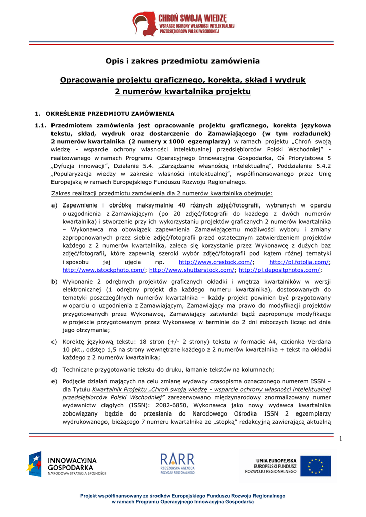Opis i zakres przedmiotu zamówienia Opracowanie projektu graficznego, korekta, skład i wydruk 2 numerów kwartalnika projektu 1. OKREŚLENIE PRZEDMIOTU ZAMÓWIENIA 1.1. Przedmiotem zamówienia jest opracowanie projektu graficznego, korekta językowa tekstu, skład, wydruk oraz dostarczenie do Zamawiającego (w tym rozładunek) 2 numerów kwartalnika (2 numery x 1000 egzemplarzy) w ramach projektu „Chroń swoją wiedzę - wsparcie ochrony własności intelektualnej przedsiębiorców Polski Wschodniej” realizowanego w ramach Programu Operacyjnego Innowacyjna Gospodarka, Oś Priorytetowa 5 „Dyfuzja innowacji”, Działanie 5.4. „Zarządzanie własnością intelektualną”, Poddziałanie 5.4.2 „Popularyzacja wiedzy w zakresie własności intelektualnej”, współfinansowanego przez Unię Europejską w ramach Europejskiego Funduszu Rozwoju Regionalnego. Zakres realizacji przedmiotu zamówienia dla 2 numerów kwartalnika obejmuje: a) Zapewnienie i obróbkę maksymalnie 40 różnych zdjęć/fotografii, wybranych w oparciu o uzgodnienia z Zamawiającym (po 20 zdjęć/fotografii do każdego z dwóch numerów kwartalnika) i stworzenie przy ich wykorzystaniu projektów graficznych 2 numerów kwartalnika – Wykonawca ma obowiązek zapewnienia Zamawiającemu możliwości wyboru i zmiany zaproponowanych przez siebie zdjęć/fotografii przed ostatecznym zatwierdzeniem projektów każdego z 2 numerów kwartalnika, zaleca się korzystanie przez Wykonawcę z dużych baz zdjęć/fotografii, które zapewnią szeroki wybór zdjęć/fotografii pod kątem różnej tematyki i sposobu jej ujęcia np. http://www.crestock.com/; http://pl.fotolia.com/; http://www.istockphoto.com/; http://www.shutterstock.com/; http://pl.depositphotos.com/; b) Wykonanie 2 odrębnych projektów graficznych okładki i wnętrza kwartalników w wersji elektronicznej (1 odrębny projekt dla każdego numeru kwartalnika), dostosowanych do tematyki poszczególnych numerów kwartalnika – każdy projekt powinien być przygotowany w oparciu o uzgodnienia z Zamawiającym, Zamawiający ma prawo do modyfikacji projektów przygotowanych przez Wykonawcę, Zamawiający zatwierdzi bądź zaproponuje modyfikacje w projekcie przygotowanym przez Wykonawcę w terminie do 2 dni roboczych licząc od dnia jego otrzymania; c) Korektę językową tekstu: 18 stron (+/- 2 strony) tekstu w formacie A4, czcionka Verdana 10 pkt., odstęp 1,5 na strony wewnętrzne każdego z 2 numerów kwartalnika + tekst na okładki każdego z 2 numerów kwartalnika; d) Techniczne przygotowanie tekstu do druku, łamanie tekstów na kolumnach; e) Podjęcie działań mających na celu zmianę wydawcy czasopisma oznaczonego numerem ISSN – dla Tytułu Kwartalnik Projektu „Chroń swoją wiedzę - wsparcie ochrony własności intelektualnej przedsiębiorców Polski Wschodniej” zarezerwowano międzynarodowy znormalizowany numer wydawnictw ciągłych (ISSN): 2082-6850, Wykonawca jako nowy wydawca kwartalnika zobowiązany będzie do przesłania do Narodowego Ośrodka ISSN 2 egzemplarzy wydrukowanego, bieżącego 7 numeru kwartalnika ze „stopką” redakcyjną zawierającą aktualną 1 Projekt współfinansowany ze środków Europejskiego Funduszu Rozwoju Regionalnego w ramach Programu Operacyjnego Innowacyjna Gospodarka nazwę i adres swojej instytucji jako nowego wydawcy z prośbą o wystawienie potwierdzenia na nowego wydawcę – szczegóły postępowania w tym zakresie przedstawione są na stronie internetowej Biblioteki Narodowej Narodowego Ośrodka ISSN: http://www.bn.org.pl/programyi-uslugi/issn/informacje-ogolne; f) Wydruk; g) Zapisanie przez Wykonawcę ostatecznych wersji przygotowanych do druku 2 numerów kwartalnika w formacie PDF i przekazanie Zamawiającemu wersji elektronicznej w celu zamieszczenia na stronie internetowej projektu. Przekazanie wersji elektronicznej nastąpi równolegle z dostawą wydrukowanych egzemplarzy 2 numerów kwartalnika do siedziby Zamawiającego, zgodnie z terminami wskazanymi w punkcie 1, podpunkt 1.4. Opisu i zakresu przedmiotu zamówienia; h) Dostawę 1 000 egzemplarzy każdego z 2 numerów kwartalnika oraz ich rozładunek w siedzibie Zamawiającego, adres: Rzeszowska Agencja Rozwoju Regionalnego S.A., 35-959 Rzeszów, ul. Szopena 51, pokój nr 218 (1 piętro). 1.2. Parametry techniczne 2 numerów Kwartalnika ▪ Ilość wydań: 2 numery kwartalnika ▪ Nakład: 1000 egzemplarzy dla każdego numeru kwartalnika ▪ Format: A4 ▪ Objętość: 24 strony wewnętrzne + okładka ▪ Papier: 24 strony wewnętrzne – papier kredowy błyszczący, gramatura 135 g/m2 ▪ Okładka: oprawa miękka, zszyta, papier o gramaturze 250 g/m2 + folia mat, wybiórczo lakier UV ▪ Druk: strony wewnętrzne i okładka drukowane w pełnym kolorze CMYK (4 +4) ▪ Wykonanie: według indywidualnego projektu zaakceptowanego przez Zamawiającego. 1.3. Sposób realizacji zamówienia: a) Wykonawca zobowiązuje się do stosowania w trakcie realizacji przedmiotu zamówienia logotypów oraz wytycznych dotyczących promocji projektów POIG 2007-2013 zawartych w dokumentach dostępnych na stronie internetowej http://poig.parp.gov.pl/index/index/1125 i przekazanych przez Zamawiającego. b) Materiały do druku (tekst do 2 numerów kwartalnika) będą dostarczone do Wykonawcy w formacie plików doc. e-mailem lub na płycie cd najpóźniej 10 dni kalendarzowych przed terminem realizacji zamówienia wskazanym w punkcie 1, podpunkt 1.4. Opisu i zakresu przedmiotu zamówienia. c) Wykonawca w ramach realizacji przedmiotu zamówienia ma możliwość wykorzystania w celu przygotowania projektu graficznego zdjęć zakupionych w tzw. bazie zdjęć. Zamawiający nie przewiduje zlecenia wykonania specjalnych fotografii na potrzeby realizacji przedmiotu zamówienia. d) Wykonawca zobowiązuje się zapewnić możliwość konsultacji z pracownikami RARR S.A. w kwestiach dotyczących wszystkich etapów realizacji przedmiotu zamówienia. 2 Projekt współfinansowany ze środk