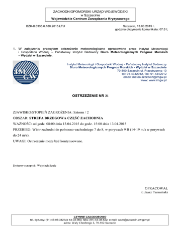 ZACHODNIOPOMORSKI URZĄD WOJEWÓDZKI w Szczecinie Wojewódzkie Centrum Zarządzania Kryzysowego BZK-II.6335.6.180.2015.ŁTU Szczecin, 13.03.2015 r. godzina otrzymania komunikatu: 07:51; 1. W załączeniu przesyłam ostrzeżenie meteorologiczne opracowane przez Instytut Meteorologii i Gospodarki Wodnej – Państwowy Instytut Badawczy Biuro Meteorologicznych Prognoz Morskich – Wydział w Szczecinie. Instytut Meteorologii i Gospodarki Wodnej - Państwowy Instytut Badawczy Biuro Meteorologicznych Prognoz Morskich - Wydział w Szczecinie 70-800 Szczecin ul. Przestrzenna 10 tel: 91-4342012, fax: 91-4342012 email: [email protected] www: www.imgw.pl OSTRZEŻENIE NR 31 ZJAWISKO/STOPIEŃ ZAGROŻENIA: Sztorm / 2 OBSZAR: STREFA BRZEGOWA CZĘŚĆ ZACHODNIA WAŻNOŚĆ: od godz. 08:00 dnia 13.04.2015 do godz. 15:00 dnia 13.04.2015 PRZEBIEG: Wiatr zachodni do połnocno-zachodniego 7 do 8, w porywach 9 B (14-19 m/s w porywach do 24 m/s). UWAGI: Ostrzeżenie może być kontynuowane. Dyżurny synoptyk: Wojciech Szulc OPRACOWAŁ Łukasz Turmiński CZYNNE CAŁODOBOWO tel. dyżurny: (91) 43-03-342 lub 43-03-360; faks: (91) 43-38-522; e-mail: [email protected] adres: Wały Chrobrego 4, 70-502 Szczecin