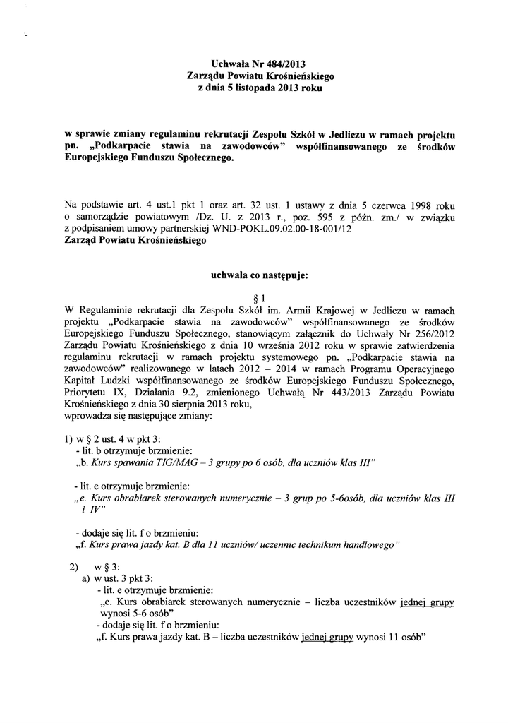 Uchwała Nr 484/2013 Powiatu Krośnieńskiego z dnia 5 listopada 2013 roku Zarządu w sprawie zmiany regulaminu rekrutacji Zespołu pn. „Podkarpacie stawia na zawodowców" Europejskiego Funduszu Społecznego. Szkół w Jedliczu w ramach projektu ze środków współfinansowanego Na podstawie art. 4 ust.1 pkt 1 oraz art. 32 ust. 1 ustawy z dnia 5 czerwca 1998 roku o samorządzie powiatowym /Dz. U. z 2013 r., poz. 595 z późn. zm./ w związku z podpisaniem umowy partnerskiej WND-POKL.09.02.00-18-001112 Zarząd Powiatu Krośnieńskiego uchwala co następuje: §1 W Regulaminie rekrutacji dla Zespołu Szkół im. Armii Krajowej w Jedliczu w ramach projektu „Podkarpacie stawia na zawodowców" współfinansowanego ze środków Europejskiego Funduszu Społecznego, stanowiącym załącznik do Uchwały Nr 256/2012 Zarządu Powiatu Krośnieńskiego z dnia 10 września 2012 roku w sprawie zatwierdzenia regulaminu rekrutacji w ramach projektu systemowego pn. „Podkarpacie stawia na zawodowców" realizowanego w latach 2012 - 2014 w ramach Programu Operacyjnego Kapitał Ludzki współfinansowanego ze środków Europejskiego Funduszu Społecznego, Priorytetu IX, Działania 9.2, zmienionego Uchwałą Nr 443/2013 Zarządu Powiatu Krośnieńskiego z dnia 30 sierpnia 2013 roku, wprowadza się następujące zmiany: 1) w § 2 ust. 4 w pkt 3: - lit. b otrzymuje brzmienie: „b. Kurs spawania TIG/MAG - 3 grupy po 6 osób, dla uczniów klas Ili" - lit. e otrzymuje brzmienie: „ e. Kurs obrabiarek sterowanych numerycznie - 3 grup po 5-6osób, dla uczniów klas Ili i IV" - dodaje się lit. f o brzmieniu: „f. Kurs prawa jazdy kat. B dla 11 uczniów/ uczennic technikum handlowego" 2) w§ 3: a) w ust. 3 pkt 3: - lit. e otrzymuje brzmienie: „e. Kurs obrabiarek sterowanych numerycznie - liczba uczestników jednej grupy wynosi 5-6 osób" - dodaje się lit. f o brzmieniu: „f. Kurs prawa jazdy kat. B - liczba uczestników jednej grupy wynosi 11 osób" b) w ust. 4 pkt III otrzymuje brzmienie: „zajęcia pozalekcyjne I lub pozaszkolne ukierunkowane na rozwijanie kompetencji zawodowych zgodnie z kierunkiem kształcenia zawodowego; w tym kursy specjalistyczne: 1) na kursy spawania, obsługi kas fiskalnych, prowadzenia małej firmy, obrabiarek sterowanych numerycznie, kurs prawa jazdy kat. B, pierwszeństwo mają uczniowie i uczennice z najwyższą średnią ocen na świadectwie za ubiegły rok szkolny wg tabeli punktowanej: Srednia ocen Liczba punktów 6 5 4 3 2 4,51 - 6,0 4,0- 4,5 3,51-3,99 3,0-3,5 2,75 -2,99 2,51-2,75 o -2,5 1 o 2) na kurs programowania - informatyki pierwszeństwo mają uczniowie i uczennice o najwyższej wiedzy z informatyki weryfikowanej testem umiejętności dla kandydatów na kurs. Kryterium dodatkowe: - dla kursu spawania: wiek powyżej 18 lat - dla II grupy w roku szkolnym 2013/2014 kryterium zostanie spełnione, gdy uczeń będzie miał co najmniej 18 lat w dniu 31.01.2014r., zaświadczenie lekarskie dopuszczające do kursu, - dla kursu prawa jazdy kat. B: wiek 3 miesiące przed ukończeniem 18 roku życia - kryterium zostanie spełnione, gdy uczennica/uczeń będzie mieć co najmniej 17 lat i 9 miesięcy w dniu 31 grudnia 2013 r., zaświadczenie lekarskie dopuszczające do kursu. 3) w formularzu zgłoszeniowym, stanowiącym zał. nr 1 do Regulaminu rekrutacji w części II pkt 3 dodaje się formę wsparcia: Kurs prawa jazdy kat. B. §2 Wykonanie uchwały powierza się Dyrektorowi Zespołu Szkół w Jedliczu. §3 Uchwała wchodzi w życie z dniem podjęcia. ST 11#AST laflfWczak KAPITAŁ LUDZKI NARODOWA STRATEGIA SPÓJNOŚCI ._~) • Wojewódzki Urząd Pracy ,r w Rzeszowie UNIA EUROPEJSKA EUROPEJSKI FUNDUSZ SPOŁECZNY •*• * * ** * *•* * Załącznik nr 1 do Regulaminu rekrutacji FORMULARZ ZGŁOSZENIOWY DO PROJEKTU „PODKARPACIE STAWIA NA ZAWODOWCÓW" rok szkolny 2013/ 2014 Udział w projekcie jest bezpłatny. Osoby, które zgłoszą chęć uczestnictwa i zostaną wybrane do w projekcie, będą uczestniczyć w wybranych przez siebie zajęciach: dydaktyczno wyrównawczych, rozwijających kompetencje kluczowe, podnoszących kwalifikacje zawodowe, doradztwie edukacyjno - zawodowym, kursach i stażach Zajęcia mogą być prowadzone od poniedziałku do soboty w przewidzianym okresie, tj. od 01.05.2012 do 31.10.2014r. udziału Prosimy o czytelne wypełnienie formularza. I. Dane uczestniczki I uczestnika: Imię/ Imiona Nazwisko Płeć Wiek w chwili przystępowania do projektu PESEL Opieka nad dziećmi do lat 7 nad lub opieka osobą 1 zależną Ulica 2 Nr domu Nr lokalu Miejscowość 1 Pod tym określeniem rozumie się fakt posiadania przez uczestnika projektu pod opieką dziecka do lat 7 luh osoby zależnej zgodnie z definicją zawartą w ustawie o promocji zatrudnienia i instytucjach rynku pracy (Dz. U. z dnia J maja 200-1). 2 Należy podać adres zamieszkania, tzn. taki adres, który umożliwi dotarcie do tej osoby w przypadku kiedy zostanie ona wylosowana do udztalu w badaniu ewaluacyjnym. a) miejski Obszar3 b) wiejski 4 Kod pocztowy Województwo Powiat Telefon stacjonarny Telefon komórkowy Adres poczty elektronicznej (e-mail) Przynależność do mniejszości narodowej lub etnicznej Fakt bycia migrantem Fakt bycia osobą niepełnosprawną Nazwa szkołv 0bszar miejski to obszar położony w granicach administracyjnych miast. Obszar wiejski powinien być rozumiany zgodnie z definicją Głównego Urzędu statystycznego, która opiera się na podziale jednostek administracyjnych zastosowanych w rejestrze Terytorialnym. Według GUS, obszarami wiejskimi są tereny położone poza granicami administracyjnymi miast - obszary gmin wiejskich oraz część wiejska (leżąca poza miastem) gminy miejsko - wiejskiej. Wyodrębnienie części wiejskich w ramach gminy miejsko - wiejskiej możliwe jest dzięki odrębnemu identyfikatorowi terytorialnemu. 3 4 Niewłaściwe skreślić II. Wybór formy wsparcia: 1. Dodatkowe zajęcia dydaktyczno - wyrównawcze dla osób o niskich wynikach w nauce NAZWAZAJ