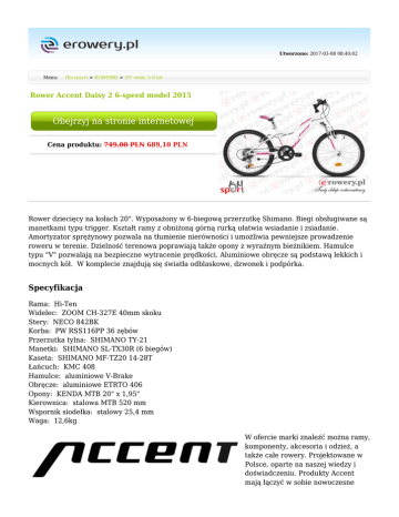 Utworzono: 2017-03-08 08:40:02 Menu: Dla dzieci > ROWERKI > 20" wiek: 5-8 lat Rower Accent Daisy 2 6-speed model 2015 Obejrzyj na stronie internetowej Cena produktu: 749,00 PLN 689,10 PLN Rower dziecięcy na kołach 20". Wyposażony w 6-biegową przerzutkę Shimano. Biegi obsługiwane są manetkami typu trigger. Kształt ramy z obniżoną górną rurką ułatwia wsiadanie i zsiadanie. Amortyzator sprężynowy pozwala na tłumienie nierówności i umożliwia pewniejsze prowadzenie roweru w terenie. Dzielność terenowa poprawiają także opony z wyraźnym bieżnikiem. Hamulce typu "V" pozwalają na bezpieczne wytracenie prędkości. Aluminiowe obręcze są podstawą lekkich i mocnych kół. W komplecie znajdują się światła odblaskowe, dzwonek i podpórka. Specyfikacja Rama: Hi-Ten Widelec: ZOOM CH-327E 40mm skoku Stery: NECO 842BK Korba: PW RSS116PP 36 zębów Przerzutka tylna: SHIMANO TY-21 Manetki: SHIMANO SL-TX30R (6 biegów) Kaseta: SHIMANO MF-TZ20 14-28T Łańcuch: KMC 408 Hamulce: aluminiowe V-Brake Obręcze: aluminiowe ETRTO 406 Opony: KENDA MTB 20" x 1,95" Kierownica: stalowa MTB 520 mm Wspornik siodełka: stalowy 25,4 mm Waga: 12,6kg W ofercie marki znaleźć można ramy, komponenty, akcesoria i odzież, a także całe rowery. Projektowane w Polsce, oparte na naszej wiedzy i doświadczeniu. Produkty Accent mają łączyć w sobie nowoczesne trendy i jakość, a przy tym pozostawać w rozsądnej cenie. Accent stara się, by wszystko było jak najlepiej dopracowane. Przez lata obecności na rynku marka Accent zyskała sporą rzeszę wiernych klientów. Przeznaczenie Dziecięcy Typ roweru Miejski Rozmiar kół 20" Sezon 2015 Rozmiary ram - Klamki hamulców - Hamulce - Mechanizm korbowy - Oś korbowodu - Prowadzenie łańcucha - Kierownica - Mostek/ Wspornik kierownicy - Pedały - Sztyca - Siodło - Piasta przód - Piasta tył - Łańcuch - Kaseta/ wolnobieg - Szprychy - Obręcze - Opony - Wyposażenie dodatkowe - Waga - Tylny amortyzator /Damper - Rodzina - Rama - Widelec/amortyzator - Stery - Przerzutka przód - Przerzutka tył - Manetki - Kolor - Mimo dołożenia wszelkich starań nie gwarantujemy, że publikowane opisy i specyfikacje techniczne niezawierają uchybień lub błędów, które nie mogą jednak być podstawą do roszczeń. W przypadku jakichkolwiek wątpliwości, przed podjęciem decyzji prosimy o kontakt. Adres: www.erowery.pl Telefon: 605 515 185, 34 361 16 71 Email: [email protected]