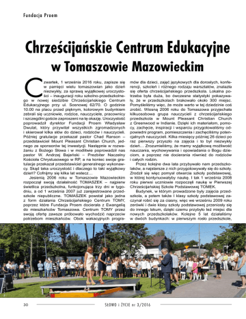 Fundacja Proem Chrześcijańskie Centrum Edukacyjne C w Tomaszowie Mazowieckim mów dla dzieci, zajęć językowych dla dorosłych, konferencji, szkoleń i różnego rodzaju warsztatów, znalazła się oferta chrześcijańskiego przedszkola. Lokalna potrzeba była duża, bo ówczesne statystyki pokazywa ły, że w przedszkolach brakowało około 300 miejsc. Pomyśleliśmy więc, że może warto w tej dziedzinie coś zrobić. Wiosną 2006 roku do Tomaszowa przyjechała kilkuosobowa grupa nauczycieli z chrześcijańskiego przedszkola w Mount Pleasant Christian Church z Greenwood w Indianie. Dzięki ich materiałom, pomocy, zachęcie, inspiracji i wsparciu przygotowaliśmy odpowiedni program, pomieszczenia i zachęciliśmy potencjalnych nauczycieli. Kilka miesięcy później 26 dzieci po raz pierwszy przyszło na zajęcia i to był niezwykły dzień… Zrozumieliśmy, że mamy wyjątkową możliwość nauczania, wychowywania i opowiadania o Bogu dzieciom, a poprzez nie docierania również do rodziców i całych rodzin. Przez kolejne dwa lata przybywało nam przedszkolaków, a najstarsze z nich przygotowywały się do szkoły. Zrodził się więc pomysł otwarcia szkoły podstawowej, w której kontynuowałyby naukę. I tak 1 września 2008 roku pierwsi uczniowie rozpoczęli naukę w Pierwszej Chrześcijańskiej Szkole Podstawowej TOMEK. Budynek, w którym prowadzone były zajęcia przedszkola, a potem także I klasy szkoły podstawowej zaczynał robić się za ciasny, więc we wrześniu 2009 roku zerówki i dwie klasy szkoły podstawowej przeniosły się do innego lokum, dzięki czemu przybyło też miejsc dla nowych przedszkolaków. Kolejne 5 lat działaliśmy w dwóch budynkach: w pierwszym rosło przedszkole, fot. W.A. Bajeński zwartek, 1 września 2016 roku, zapisze się w pamięci wielu tomaszowian jako dzień niezwykły, za sprawą wyjątkowej uroczystości – inauguracji roku szkolno-przedszkolnego w nowej siedzibie Chrześcijańskiego Centrum Edukacyjnego przy ul. Sosnowej 62/70. O godzinie 10.00 na placu przed pięknym, kolorowym budynkiem zebrali się uczniowie, rodzice, nauczyciele, pracownicy i szczególni goście zaproszeni na tę okazję. Uroczystość poprowadził dyrektor Fundacji Proem Władysław Dwulat, który przywitał wszystkich zgromadzonych i skierował kilka słów do dzieci, rodziców i nauczycieli. Później gratulacje przekazał pastor Chad Ranson – przedstawiciel Mount Pleasant Christian Church, jed nego ze sponsorów tej inwestycji. Następnie w rozważaniu z Bożego Słowa i w modlitwie poprowadził nas pastor W. Andrzej Bajeński – Prezbiter Naczelny Kościoła Chrystusowego w RP, a na koniec swoje gratulacje przekazał przedstawiciel generalnego wykonawcy. Skąd taka uroczystość i dlaczego to taki wyjątkowy dzień? Cofnijmy się kilka lat wstecz… Jesienią 2006 roku w Tomaszowie Mazowieckim rozpoczął swoją działalność TOMASZEK – najpierw świetlica przedszkolna, funkcjonująca trzy dni w tygodniu, a od 1 września 2007 już zarejestrowane przedszkole niepubliczne. TOMASZEK powstał jako jedna z form działania Chrześcijańskiego Centrum TOMY, poprzez które Fundacja Proem docierała z Ewangelią do mieszkańców Tomaszowa. Centrum TOMY przez swoją ofertę zawsze próbowało wychodzić naprzeciw potrzebom mieszkańców. Obok wakacyjnych progra- 30 SŁOWO i ŻYC IE n r 3/2016 fot. Proem twie łódzkim). W naszych placówkach jest też miejsce dla dzieci z trudnościami edukacyjnymi i orzeczeniami o niepełnosprawności. Mamy dla nich odpowiednie zajęcia i programy wspomagające, a do ich dyspozycji pozostaje zespół specjalistów (pedagog szkolny, psycholog, logopeda, oligofrenopedagog, tyflopedagog i fizjoterapeuta). Od dziewięciu lat mamy przywilej obserwowania, jak dzieci poznają Boga, doświadczają Jego miłości i przemiany życia, jak wyrasta nowe pokolenie tomaszowian, dla których Bóg jest w życiu najważniejszy. Jesteśmy świadkami jak ich rodzice i bliscy otwierają swoje serca na prawdę Ewangelii, jak nasi nauczyciele i inni pracownicy przychodzą do Niego, a ich życie przewraca się „do góry nogami”. Jesteśmy Bogu za to wszystko bardzo wdzięczni. Doświadczaliśmy chwil bardzo radosnych i chwil bardzo trudnych, zawsze jednak mieliśmy przekonanie, że Bóg jest blisko i pracujemy dla Niego. Jeżeli Bóg kładzie Ci na sercu misję podobną do naszej, to wiedz, że z Nim wszystko jest możliwe, że On widzi dalej niż my. Wierzymy, że taka służba ma ogromną wartość, i zachęcamy do podjęcia wyzwania. Chętnie podzielimy się naszymi doświadczeniami. AGNIESZKA CROZIER Dyrektor Administracyjny Chrześcijańskiego Centrum Edukacyjnego http://tomy.edu.pl fot. Proem fot. W.A. Bajeński a w drugim szkoła. I w obydwu budynkach zaczęło się znów robić ciasno. Wtedy chyba po raz pierwszy zaczęliśmy myśleć o jakimś własnym budynku, zaczęliśmy marzyć i modlić się, a potem szukać odpowiedniego miejsca. Wiosną 2014 stanęliśmy przed bardzo trudną decyzją: albo zostać tu, gdzie jesteśmy, i nie przyjmować żadnych nowych dzieci, albo szukać czegoś większego, przyjąć kolejne dzieci i… otworzyć gimnazjum. Po wielu modlitwach, rozmowach i dyskusjach postanowiliśmy zrobić to drugie. We wrześniu 2014 wystartowaliśmy w trzecim już wynajętym budynku, który ku naszej wielkiej radości mógł pomieścić przedszkole, szkołę i I klasę gimnazjum TOMASZ. W marcu tegoż roku udało się uzyskać od miasta kawałek ziemi w samym narożniku parku miejskiego, ze zrujnowanym budynkiem byłej „Sosenki”, przed laty służącej jako restauracja, centrum charytatywne, a nawet przedszkole. Przez cały kolejny rok trwały formalności, związane z przygotowaniami do budowy naszej własnej siedziby dla Chrześcijańskiego Centrum Edukacyjnego. Budowa ruszyła jesienią 2015, a już 1 września 2016 roku mogliśmy tam uroczyście zainaugurować rok szkolny 2016/2017. Pierwszy etap budowy został za
