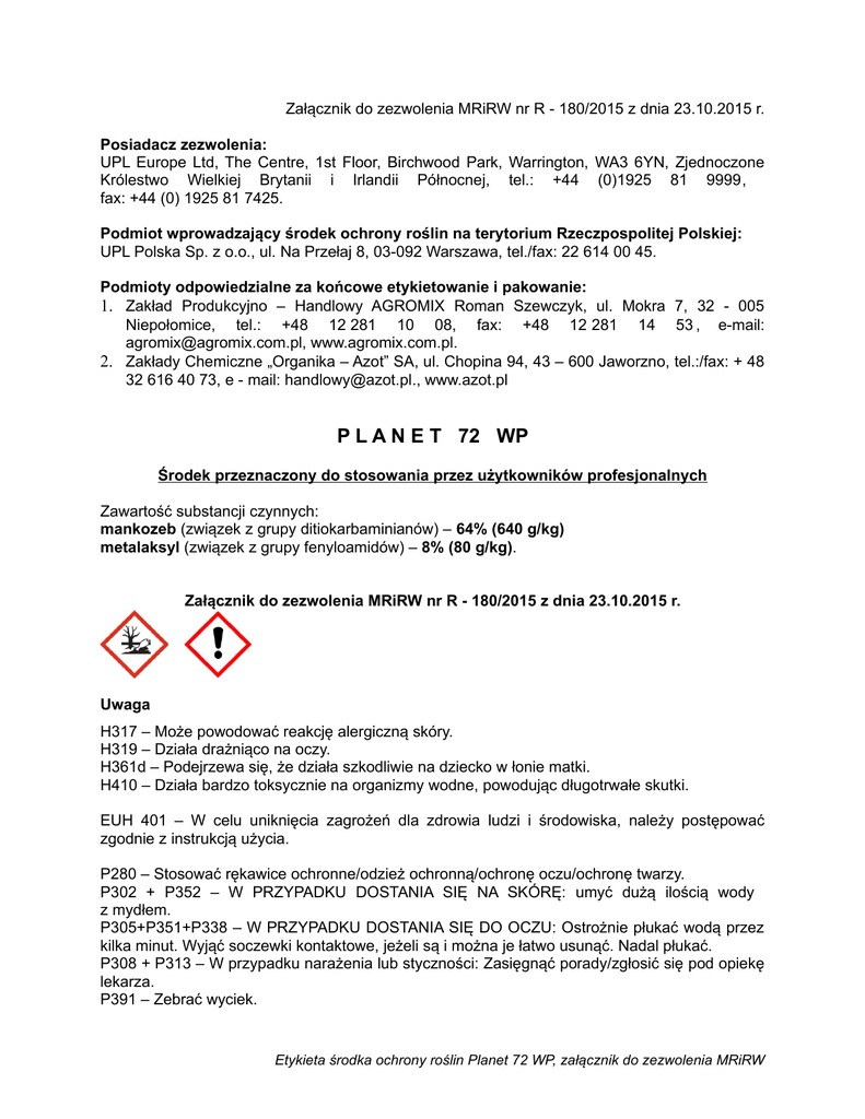 Załącznik do zezwolenia MRiRW nr R - 180/2015 z dnia 23.10.2015 r. Posiadacz zezwolenia: UPL Europe Ltd, The Centre, 1st Floor, Birchwood Park, Warrington, WA3 6YN, Zjednoczone Królestwo Wielkiej Brytanii i Irlandii Północnej, tel.: +44 (0)1925 81 9999, fax: +44 (0) 1925 81 7425. Podmiot wprowadzający środek ochrony roślin na terytorium Rzeczpospolitej Polskiej: UPL Polska Sp. z o.o., ul. Na Przełaj 8, 03-092 Warszawa, tel./fax: 22 614 00 45. Podmioty odpowiedzialne za końcowe etykietowanie i pakowanie: 1. Zakład Produkcyjno – Handlowy AGROMIX Roman Szewczyk, ul. Mokra 7, 32 - 005 Niepołomice, tel.: +48 12 281 10 08, fax: +48 12 281 14 53 , e-mail: [email protected], www.agromix.com.pl. 2. Zakłady Chemiczne „Organika – Azot” SA, ul. Chopina 94, 43 – 600 Jaworzno, tel.:/fax: + 48 32 616 40 73, e - mail: [email protected]., www.azot.pl P L A N E T 72 WP Środek przeznaczony do stosowania przez użytkowników profesjonalnych Zawartość substancji czynnych: mankozeb (związek z grupy ditiokarbaminianów) – 64% (640 g/kg) metalaksyl (związek z grupy fenyloamidów) – 8% (80 g/kg). Załącznik do zezwolenia MRiRW nr R - 180/2015 z dnia 23.10.2015 r. Uwaga H317 – Może powodować reakcję alergiczną skóry. H319 – Działa drażniąco na oczy. H361d – Podejrzewa się, że działa szkodliwie na dziecko w łonie matki. H410 – Działa bardzo toksycznie na organizmy wodne, powodując długotrwałe skutki. EUH 401 – W celu uniknięcia zagrożeń dla zdrowia ludzi i środowiska, należy postępować zgodnie z instrukcją użycia. P280 – Stosować rękawice ochronne/odzież ochronną/ochronę oczu/ochronę twarzy. P302 + P352 – W PRZYPADKU DOSTANIA SIĘ NA SKÓRĘ: umyć dużą ilością wody z mydłem. P305+P351+P338 – W PRZYPADKU DOSTANIA SIĘ DO OCZU: Ostrożnie płukać wodą przez kilka minut. Wyjąć soczewki kontaktowe, jeżeli są i można je łatwo usunąć. Nadal płukać. P308 + P313 – W przypadku narażenia lub styczności: Zasięgnąć porady/zgłosić się pod opiekę lekarza. P391 – Zebrać wyciek. Etykieta środka ochrony roślin Planet 72 WP, załącznik do zezwolenia MRiRW OPIS DZIAŁANIA Planet 72 WP jest środkiem grzybobójczym w postaci proszku do sporządzania zawiesiny wodnej o działaniu układowym i powierzchniowym do stosowania zapobiegawczego i interwencyjnego w ochronie ziemniaka, pomidora i cebuli, przed chorobami grzybowymi. Środek przeznaczony do stosowania przy użyciu samobieżnych lub ciągnikowych opryskiwaczy polowych. STOSOWANIE ŚRODKA Ziemniak zaraza ziemniaka Maksymalna/zalecana dawka dla jednorazowego zastosowania: 2,5 kg/ha Termin stosowania: Środek stosować do pierwszych zabiegów ochrony ziemniaka (BBCH 14-49). Opryskiwanie wykonać zgodnie z sygnalizacją lub: − na odmianach wczesnych w okresie zwierania się roślin w rzędach, − na odmianach późnych po wystąpieniu pierwszych objawów zarazy na odmianach wczesnych. W przypadkach silnego zagrożenia chorobą, zabieg środkiem Planet 72 WP należy powtórzyć po 10 - 14 dniach od pierwszego zabiegu. Środkiem wykonać maksymalnie 2 zabiegi w sezonie. Kolejne zabiegi wykonywać używając środków grzybobójczych o działaniu powierzchniowym po 9-14 dniach od ostatniego zastosowania środka Planet 72 WP. Maksymalna liczba zabiegów w sezonie wegetacyjnym: 2 Odstęp między zabiegami: co najmniej 10 dni Zalecana ilość wody: 400 l/ha Zalecane opryskiwanie: drobnokropliste Pomidor (uprawa w gruncie) zaraza ziemniaka Maksymalna / zalecana dawka dla jednorazowego zastosowania: 2,25 kg/ha Termin stosowania: Pierwszy zabieg wykonać zgodnie z sygnalizacją, zapobiegawczo lub po natychmiast zaobserwowaniu pierwszych objawów choroby. Środkiem wykonać 2-3 zabiegi w sezonie, w odstępie co 9-14 dni. Środek stosować od fazy rozwiniętego trzeciego liścia na pędzie głównym do fazy kwitnienia (9 lub więcej kwiatów otwartych) (BBCH 13-69). Maksymalna liczba zabiegów w sezonie wegetacyjnym: 3 Odstęp między zabiegami: co najmniej 9 dni Zalecana ilość wody: 700-800 l/ha Ilość wody dostosować do wielkości roślin. Zalecane opryskiwanie: drobnokropliste Cebula (z siewu) mączniak rzekomy cebuli Maksymalna/zalecana dawka dla jednorazowego zastosowania: 2,5 kg/ha Etykieta środka ochrony roślin Planet 72 WP, załącznik do zezwolenia MRiRW Termin stosowania: Pierwszy zabieg wykonać zgodnie z sygnalizacją, zapobiegawczo lub natychmiast po zaobserwowaniu pierwszych objawów choroby. Środkiem wykonać 2 zabiegi w sezonie, w odstępie co 9-14 dni. Środek stosować od fazy wyraźnie widocznego trzeciego liścia do początku fazy rozwoju części roślin przeznaczonych do zbioru (BBCH 13-41). Maksymalna liczba zabiegów w sezonie wegetacyjnym: 2 Odstęp między zabiegami: co najmniej 9 dni Zalecana ilość wody: 700 l/ha Zalecane opryskiwanie: drobnokropliste ŚRODKI OSTROŻNOŚCI I ZALECENIA STOSOWANIA ZWIĄZANE Z DOBRĄ PRAKTYKĄ ROLNICZĄ 1. Warunkiem skuteczności zabiegu jest dokładne pokrycie roślin cieczą użytkową. 2. Nie stosować środka w czasie opadu deszczu lub przed spodziewanym deszczem. 3. Środek stosować przemiennie ze środkami grzybobójczymi zawierającymi substancje czynne należące do innych grup chemicznych, o odmiennym mechanizmie działania. 4. W przypadku konieczności wykonania kolejnych zabiegów po sobie środkiem Planet 72 WP odstęp pomiędzy zabiegami nie powinien być dłuższy niż 14 dni. 5. W ochronie cebuli wskazane jest dodanie środka zwiększającego równomierność pokrycia roślin cieczą użytkową. 6. Podczas stosowania środka nie dopuścić do znoszenia cieczy użytkowej na sąsiednie plantacje roślin uprawnych. SPORZĄDZANIE CIECZY UŻYTKOWEJ Przed przystąpieniem do sporządzania cieczy użytkowej dokładnie ustalić potrzebną jej ilość. Odważoną ilość środka wymieszać w osobnym naczyniu z małą ilością wody, następnie wlać przez sito do zbiornika opryskiwacza napełnionego częśc