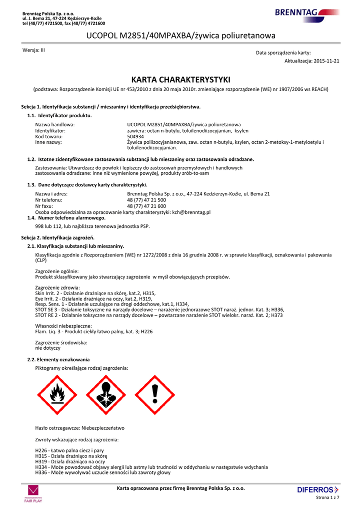 Brenntag Polska Sp. z o.o. ul. J. Bema 21, 47-224 Kędzierzyn-Koźle tel (48/77) 4721500, fax (48/77) 4721600 UCOPOL M2851/40MPAXBA/żywica poliuretanowa Wersja: III Data sporządzenia karty: __________ Aktualizacja: 2015-11-21 KARTA CHARAKTERYSTYKI (podstawa: Rozporządzenie Komisji UE nr 453/2010 z dnia 20 maja 2010r. zmieniające rozporządzenie (WE) nr 1907/2006 ws REACH) Sekcja 1. Identyfikacja substancji / mieszaniny i identyfikacja przedsiębiorstwa. 1.1. Identyfikator produktu. Nazwa handlowa: Identyfikator: Kod towaru: Inne nazwy: UCOPOL M2851/40MPAXBA/żywica poliuretanowa zawiera: octan n-butylu, toluilenodiizocyjanian, ksylen 504934 Żywica poliizocyjanianowa, zaw. octan n-butylu, ksylen, octan 2-metoksy-1-metyloetylu i toluilenodiizocyjanian. 1.2. Istotne zidentyfikowane zastosowania substancji lub mieszaniny oraz zastosowania odradzane. Zastosowania: Utwardzacz do powłok i lepiszczy do zastosowań przemysłowych i handlowych zastosowania odradzane: inne niż wymienione powyżej, produkty zrób-to-sam 1.3. Dane dotyczące dostawcy karty charakterystyki. Nazwa i adres: Brenntag Polska Sp. z o.o., 47-224 Kedzierzyn-Koźle, ul. Bema 21 Nr telefonu: 48 (77) 47 21 500 Nr faxu: 48 (77) 47 21 600 Osoba odpowiedzialna za opracowanie karty charakterystyki: [email protected] 1.4. Numer telefonu alarmowego. 998 lub 112, lub najbliższa terenowa jednostka PSP. Sekcja 2. Identyfikacja zagrożeń. 2.1. Klasyfikacja substancji lub mieszaniny. Klasyfikacja zgodnie z Rozporządzeniem (WE) nr 1272/2008 z dnia 16 grudnia 2008 r. w sprawie klasyfikacji, oznakowania i pakowania (CLP) Zagrożenie ogólnie: Produkt sklasyfikowany jako stwarzający zagrożenie w myśl obowiązujących przepisów. Zagrożenie zdrowia: Skin Irrit. 2 - Działanie drażniące na skórę, kat.2, H315, Eye Irrit. 2 - Działanie drażniące na oczy, kat.2, H319, Resp. Sens. 1 - Działanie uczulające na drogi oddechowe, kat.1, H334, STOT SE 3 - Działanie toksyczne na narządy docelowe – narażenie jednorazowe STOT naraż. jednor. Kat. 3; H336, STOT RE 2 - Działanie toksyczne na narządy docelowe – powtarzane narażenie STOT wielokr. naraż. Kat. 2; H373 Własności niebezpieczne: Flam. Liq. 3 - Produkt ciekły łatwo palny, kat. 3; H226 Zagrożenie środowiska: nie dotyczy 2.2. Elementy oznakowania Piktogramy określające rodzaj zagrożenia: Hasło ostrzegawcze: Niebezpieczeństwo Zwroty wskazujące rodzaj zagrożenia: H226 - Łatwo palna ciecz i pary H315 - Działa drażniąco na skórę H319 - Działa drażniąco na oczy H334 - Może powodować objawy alergii lub astmy lub trudności w oddychaniu w następstwie wdychania H336 - Może wywoływać uczucie senności lub zawroty głowy Karta opracowana przez firmę Brenntag Polska Sp. z o.o. Strona 1 z 7 Brenntag Polska Sp. z o.o. ul. J. Bema 21, 47-224 Kędzierzyn-Koźle tel (48/77) 4721500, fax (48/77) 4721600 UCOPOL M2851/40MPAXBA/żywica poliuretanowa H373 - Może powodować uszkodzenie narządów, poprzez długotrwałe lub powtarzane narażenie EUH 204 - Zawiera izocyjaniany. Może powodować wystąpienie reakcji alergicznej Zwroty określające warunki bezpiecznego stosowania: P210 - Przechowywać z dala od źródeł ciepła/iskrzenia/ otwartego ognia/gorących powierzchni. – Palenie wzbronione. P280 - Stosować rękawice ochronne/odzież ochronną/ochronę oczu/ochronę twarzy. P304+P340 - W przypadku dostania się do dróg oddechowych: wyprowadzić lub wynieść poszkodowanego na świeże powietrze i zapewnić warunki do odpoczynku w pozycji umozliwiającej swobodne oddychanie P312 - W przypadku złego samopoczucia skontaktować się z Ośrodkiem Zatruć lub z lekarzem. P314 - W przypadku złego samopoczucia zasięgnąć porady/zgłosić się pod opiekę lekarza. P342+P311 - W przypadku wystąpienia objawów ze strony układu oddechowego: Skontaktować się z Ośrodkiem Zatruć lub z lekarzem P370+P378 - W przypadku pożaru: Użyć … do gaszenia. 2.3. Inne zagrożenia. Sekcja 3. Skład / informacja o składnikach. Skład wg Rozporządzenia 1272/2008. ok. 15% ksylen (Flam. Liq. 3; H226, Acute Tox. 4; H312, Acute Tox. 4; H332, Asp. Tox. 1; H304, Skin Irrit. 2; H315, Eye Irrit. 2; H319, STOT SE 3; H335, STOT RE 2; H373, CAS 1330-20-7, WE: 1330-20-7) Numer rejestracji: 01-2119488216-32-XXXX ok. 15% octan 2-metoksy-1-metyloetylu (Flam. Liq. 3; H226, CAS; 108-65-6, WE: 203-603-9) Numer rejestracji: 01-2119475791-29-XXXX <0,5% toluilenodiizocyjanian (Carc. 2; H351, Eye Irrit. 2; H319, STOT SE 3; H335, Skin Irrit. 2; Resp. Sens. 1; H334, Skin Sens. 1; H317, Aquatic Chronic 3; H412, Acute Tox. 2; H330, CAS: 26471-62-5, WE: 247-722-4) Numer rejestracji: 01-2119454791-34-XXXX ok. 35% octan n-butylu (Flam. Liq. 3; H226, STOT SE 3; H336; EUH 066, CAS:123-86-4, WE: 204-658-1) Numer rejestracji: 01-2119485493-29-XXXX O ile wymienione są składniki niebezpieczne, znaczenie zwrotów H podane jest w p. 16 karty charakterystyki. Sekcja 4. Środki pierwszej pomocy. 4.1. Opis środków pierwszej pomocy. Wdychanie: W razie narażenia inhalacyjnego zapewnić dostęp świeżego powietrza, wyprowadzić poszkodowanego z miejsca narażenia. Wezwać pomoc lekarską. Kontakt ze skórą: W razie zanieczyszczenia skóry natychmiast zmyć gazą nasączoną olejem roślinnym, a nastepnie spłukać dużą ilością bieżącej wody z mydłem, zdjąć zanieczyszczoną odzież; przy wystąpieniu objawów podrażnienia skorzystać z pomocy lekarskiej. Kontakt z oczami: W razie zanieczyszczenia oczu natychmiast płukać dużą ilością wody przez co najmniej 10 minut, przy wystąpieniu objawów podrażnienia skorzystać z pomocy lekarskiej. Nie stosować bez zgody lekarza żadnych maści. Spożycie: W razie spożycia podać do wypicia płynną parafinę, nie podawać mleka ani tłuszczów roślinnych. Natychmiast wezwać pomoc lekarską. 4.2. Najważniejsze ostre i opóźnione objawy oraz skutki narażenia. 4.3. Wskazania dotyczące wszelkiej natychmiastowej pomocy lekarskiej i szczególneg
