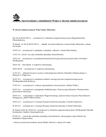Sprawozdanie z działalności Wójta w okresie międzysesyjnym W okresie międzysesyjnym Wójt Gminy Mieścisko: Od 03 do 04.03.2014 r. – uczestniczył w szkoleniu zorganizowanym przez Regionalną Izbę Obrachunkową, W dniach od 06 do 08.03.2014 r. - składał życzenia kobietom z terenu Gminy Mieścisko z okazji ich święta, 10.03.14 r.- uczestniczył w spotkaniu z udziałem sołtysów z okazji Dnia Sołtysa, 13.03.14 r. zawarł trzy akty notarialne sprzedaży nieruchomości, 18.03.14r. – uczestniczył w posiedzeniu Komisji Rewizyjnej Stowarzyszenia Gmin i Powiatów Wielkopolski, 20.03.14r. – brał udział w rozprawie eksmisyjnej, 20.03.2014r. – uczestniczył w rozprawie eksmisyjnej, 21.03.14 r. – dokonał otwarcia wystawy archeologicznej zbiorów Stanisława Pijanowskiego w Muzeum w Wągrowcu, 26.03.14 r. – uczestniczył w spotkaniu rolników naszego powiatu zorganizowanego przez Wielkopolską Izbę Rolniczą, 27.03.14 r. – uczestniczył w walnym zgromadzeniu stowarzyszenia „Dolina Wełny”, 28.03.14 r. – uczestniczył w pożegnaniu Nadleśniczego z Durowa pana Zbysława Thomasa który przeszedł na emeryturę, 29.03.14 r. – wziął udział w Gali Głosu Wągrowieckiego, podczas której wręczono Panu Hansowi Füringerowi „MOST PRZYJAŻNI”, 30.03.14 r. – uczestniczył w wizytacji Prymasa Józefa Kowalczyka w Parafii Gołaszewo, 01.04.14 r. – uczestniczył w wizytacji Prymasa Józefa Kowalczyka w Parafii Mieścisko, W dniach od 02 do 04.04.14r.- uczestniczył w szkoleniu organizowanym przez Wielkopolski Ośrodek Kształcenia i Studiów Samorządowych, 07.04.14 r. – zawarł akt notarialny sprzedaży nieruchomości i akt przejęcia części zbiorów po Stanisławie Pijanowskim, - złożył życzenia pracownikom naszej Służby Zdrowia z okazji ich święta, 08.04.14 r. – uczestniczył w Walnym Zgromadzeniu Stowarzyszenia Gmin i Powiatów Wielkopolski, 09.04.14 r. – wręczył medale za długoletnie pożycie małżeńskie dwóm parom, które obchodziły 50 lat małżeństwa, 10.04.14 r. – uczestniczył w uroczystej Gali z okazji wyboru „Gnieźnianina Roku”, 12.04.14 r. – uczestniczył w śniadaniu wielkanocnym dla rodzin mniej zasobnych zorganizowanym przez Dworek „Róża Poraja”, 15.04.14 r. – uczestniczył w spotkaniu z Wicemarszałkiem, które dotyczyło sytuacji w Zakładach Aktywności Zawodowej naszego województwa, W dniach od 17 do 22.04.14 r. – przebywał na urlopie, 23.04.14 r. – zawarł akt notarialny sprzedaży nieruchomości, - uczestniczył w posiedzeniu rady „Dolina Wełny”, 24.04.14 r. – uczestniczył w posiedzeniu komisji rewizyjnej naszej rady Gminy, 25.04.14 r. – uczestniczył w konwencie wójtów i burmistrzów naszego powiatu zorganizowanym przez stowarzyszenie „Dolina Wełny”, 27.04.14 r. – uczestniczył i pomagał zorganizować uroczystości w Budziejewku z okazji kanonizacji Jana Pawła II, 29.04.14 r. – uczestniczył w Liceum Ogólnokształcącym podczas Powiatowego Dnia Nauki pn: „ A to właśnie jest fizyka”, 30.04.14 r. – uczestniczył w konferencji nt. współpracy europejskiej na zaproszenie Marszałka Województwa Wielkopolskiego. 01.05.14 r. – ufundował puchar na mecz wsi Lechlin – Mieścisko w Lechlinie, - wziął udział w koncercie poetycznym z okazji kanonizacji Jana Pawła II w Dworku „Róża Poraja”, W dniach 02.-04.05.14 r. – uczestniczył w obchodach 40-lecia współpracy Gminy Scharnebeck z gminą francuską Backwil w Scharnebeck, 06.05.14 r. – prowadził rozmowy z panią Magdaleną Sławińską Komendantem Powiatowej Policji w Wągrowcu, - uczestniczył w walnym zgromadzeniu Międzygminnego Składowiska Odpadów Komunalnych w Wągrowcu, 08.05.14 r. – złożył wiązankę kwiatów i brał udział w apelu z okazji zakończenia II wojny światowej, - uczestniczył w otwarciu Specjalnej Strefy Ekonomicznej w Pile, 09.05.14 r. – zawarł akt notarialny sprzedaży nieruchomości, - uczestniczył w obchodach Powiatowego Dnia Strażaka, 11.05.14 r. – uczestniczył w obchodach 66-rocznicy powstania Państwa Izrael, 12.05.14 r. – był odebrać w miejscowości Ostrzeszów 60 szt gęsi w ramach propagowania gęsiny na naszych stołach – otrzymaliśmy je od Marszałka, a są w gospodarstwach pani Sadłowskiej, p. Nowaczyka, p. Ignaczaka, p. Koteckiego, 13.05.14 r. – spotkał się i podziękował osobom , które uczestniczyły w przygotowaniu uroczystości kanonizacyjnych naszego świętego Jana Pawła II, 14.05.14 r. – uczestniczył w gali podsumowującej realizację Wielkopolskiego Regionalnego Programu Operacyjnego, W dniach 15 – 16.05.14 r. – uczestniczył w Zgromadzeniu Ogólnym Związku Gmin Wiejskich, 17.05.14 r. – uczestniczył w spektaklu Patriotycznym w Czeszewie i Brdowie poświęconym pamięci Karola Libelta Hipolita Cegielskiego i dr Karola Marcinkowskiego, 19.05.14 r. – uczestniczył w posiedzeniu wspólnych komisji naszej Rady Gminy, 20.05.14 r. – prowadził rozmowy z firmą WINDPROJEKT w Inowrocławiu, 21.05.14 r. – odwiedził p. Józefa Janta - Połczyńskiego – spadkobiercę Żabiczyna w Domu Pomocy Społecznej w Sopocie, Od 22 do 23.05.14 r. – uczestniczył w Targach „Więcej światła” zorganizowanych przez ENEOS, 23.05.14 r. – prowadził rozmowy z firmą PL Energia i BLUE GAZ Sp. z o.o. w Karlinie, 25.05.14 r. – uczestniczył we Mszy Św. z okazji 25-lecia kapłaństwa ks. Krzysztofa Kuryłowicza, 26.05.14 r. – uczestniczył w uruchomieniu trzech siłowni wiatrowych w Kłodzinie, 27.05.14 r. – udzielił wywiadu TV UTRECHT - złożył życzenia pracownikom naszego Urzędu z okazji Dnia Pracownika Samorządowego, - pogratulował Ochotniczej Straży Pożarnej w Sarbii za Puchar w zawodach starych sikawek. Wójt Gminy w okresie międzysesyjnym wydał 25 zarządzeń, załatwiał sprawy bieżące oraz nadzorował przygotowanie materiałów na dzisiejszą XXXI Sesję Rady Gminy Mieścisko, dnia 28 maja 2014 r.