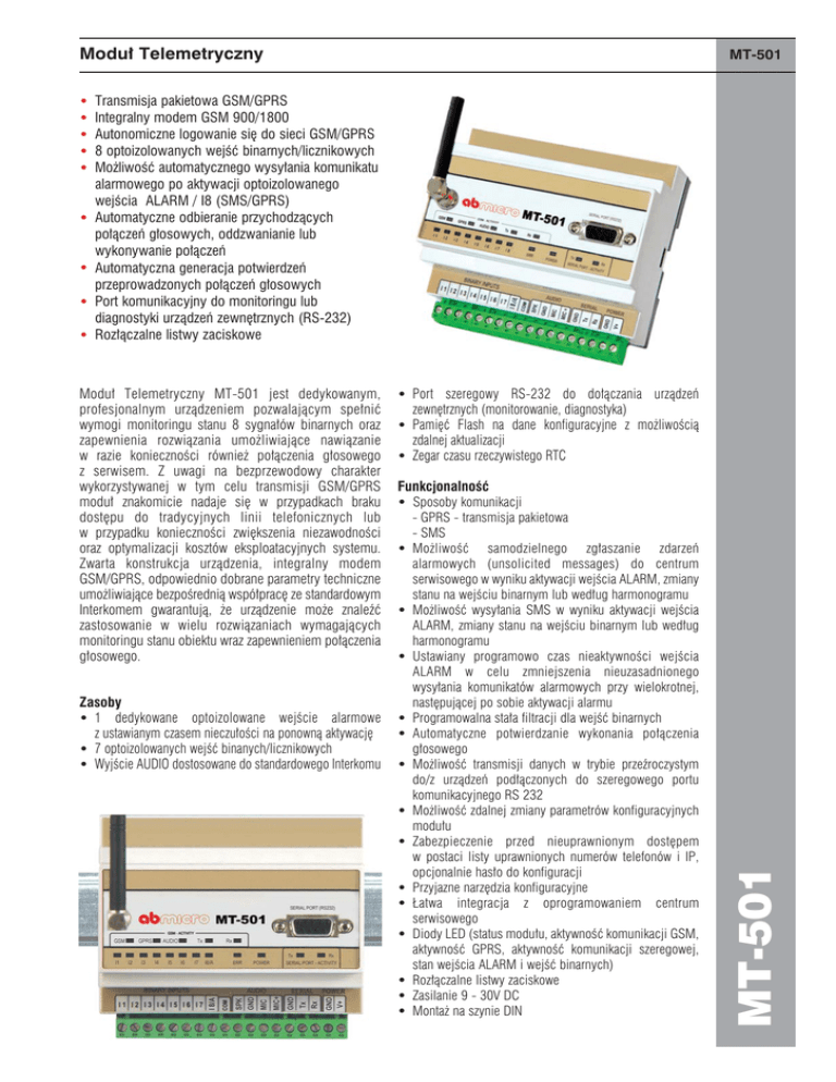 Moduł Telemetryczny Transmisja pakietowa GSM/GPRS Integralny modem GSM 900/1800 Autonomiczne logowanie się do sieci GSM/GPRS 8 optoizolowanych wejść binarnych/licznikowych Możliwość automatycznego wysyłania komunikatu alarmowego po aktywacji optoizolowanego wejścia ALARM / I8 (SMS/GPRS) Automatyczne odbieranie przychodzących połączeń głosowych, oddzwanianie lub wykonywanie połączeń Automatyczna generacja potwierdzeń przeprowadzonych połączeń głosowych Port komunikacyjny do monitoringu lub diagnostyki urządzeń zewnętrznych (RS-232) Rozłączalne listwy zaciskowe Moduł Telemetryczny MT-501 jest dedykowanym, profesjonalnym urządzeniem pozwalającym spełnić wymogi monitoringu stanu 8 sygnałów binarnych oraz zapewnienia rozwiązania umożliwiające nawiązanie w razie konieczności również połączenia głosowego z serwisem. Z uwagi na bezprzewodowy charakter wykorzystywanej w tym celu transmisji GSM/GPRS moduł znakomicie nadaje się w przypadkach braku dostępu do tradycyjnych linii telefonicznych lub w przypadku konieczności zwiększenia niezawodności oraz optymalizacji kosztów eksploatacyjnych systemu. Zwarta konstrukcja urządzenia, integralny modem GSM/GPRS, odpowiednio dobrane parametry techniczne umożliwiające bezpośrednią współpracę ze standardowym Interkomem gwarantują, że urządzenie może znaleźć zastosowanie w wielu rozwiązaniach wymagających monitoringu stanu obiektu wraz zapewnieniem połączenia głosowego. Zasoby 1 dedykowane optoizolowane wejście alarmowe z ustawianym czasem nieczułości na ponowną aktywację 7 optoizolowanych wejść binanych/licznikowych Wyjście AUDIO dostosowane do standardowego Interkomu Port szeregowy RS-232 do dołączania urządzeń zewnętrznych (monitorowanie, diagnostyka) Pamięć Flash na dane konfiguracyjne z możliwością zdalnej aktualizacji Zegar czasu rzeczywistego RTC Funkcjonalność Sposoby komunikacji - GPRS - transmisja pakietowa - SMS Możliwość samodzielnego zgłaszanie zdarzeń alarmowych (unsolicited messages) do centrum serwisowego w wyniku aktywacji wejścia ALARM, zmiany stanu na wejściu binarnym lub według harmonogramu Możliwość wysyłania SMS w wyniku aktywacji wejścia ALARM, zmiany stanu na wejściu binarnym lub według harmonogramu Ustawiany programowo czas nieaktywności wejścia ALARM w celu zmniejszenia nieuzasadnionego wysyłania komunikatów alarmowych przy wielokrotnej, następującej po sobie aktywacji alarmu Programowalna stała filtracji dla wejść binarnych Automatyczne potwierdzanie wykonania połączenia głosowego Możliwość transmisji danych w trybie przeźroczystym do/z urządzeń podłączonych do szeregowego portu komunikacyjnego RS 232 Możliwość zdalnej zmiany parametrów konfiguracyjnych modułu Zabezpieczenie przed nieuprawnionym dostępem w postaci listy uprawnionych numerów telefonów i IP, opcjonalnie hasło do konfiguracji Przyjazne narzędzia konfiguracyjne Łatwa integracja z oprogramowaniem centrum serwisowego Diody LED (status modułu, aktywność komunikacji GSM, aktywność GPRS, aktywność komunikacji szeregowej, stan wejścia ALARM i wejść binarnych) Rozłączalne listwy zaciskowe Zasilanie 9 - 30V DC Montaż na szynie DIN MT-501 MT-501 Dane Techniczne MT-501 Środowisko konfiguracyjne Ogólne Wymiary (dł. x szer. x wys.) Waga Sposób mocowania Temperatura pracy Klasa ochrony 105x86x60 mm 300 g DIN Rail 35mm -20 ... +55°C IP40 Modem GSM/GPRS Typ modemu GSM Zakresy częstotliwości (EGSM 900 MHz) Moc szczytowa nadajnika (EGSM 900 MHz) Zakresy częstotliwości (EGSM 1800 MHz) Moc szczytowa nadajnika (EGSM 1800 MHz) Modulacja Odstęp międzykanałowy WISMO Quick Dual Band GSM/GPRS module EGSM900/1800 Nadajnik: od 880 MHz do 915 MHz Odbiornik: od 925 MHz do 960 MHz 33 dBm (2W) - stacja klasy 4 Rysunki i wymiary (w milimetrach) Nadajnik: od 1710 MHz do 1785 MHz Odbiornik: od 1805 MHz do 1880 MHz 30 dBm (1W) - stacja klasy 1 0,3 GMSK 200 kHz Antena 50Ω Zasilanie Napięcie stałe (DC) Prąd wejściowy (A) (dla 12V DC) Idle 0,02 9 ... 30 V Max 0,50 Wejścia I1...ALARM / I8 Maksymalne napięcie wejściowe Rezystancja wejściowa Wejściowe napięcie ON Wejściowe napięcie OFF 0 ... 30 V 5,4 kΩ > 9V 0 ... 3V MT-501 Przykładowe podłączenia Dodatkowe informacje: AB-MICRO Sp. z o.o. ul. Kulczyńskiego 14, 02-777 Warszawa tel.: +48 22 641-31-30, fax: +48 22 643-14-21 [email protected], www.telemetria.pl