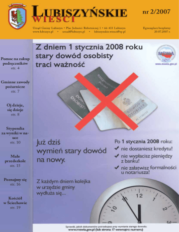Pomoc na zakup podręczników str. 4 Gminne zawody pożarnicze str. 7 Oj dzieje, się dzieje str. 8 Stypendia za wyniki w nauce str. 10 Małe przedszkole str. 15 Poznajmy się str. 16 Kościół w Ściechowie str. 19 Aktualności Policja Radzi Okres letni to wzmożony czas wyjazdów i spotkań rodzinnych. Wyjeżdżając zostawiamy swoje mieszkania, sklepy bez opieki, co sprzyja dokonywaniu włamań i kradzieży. Aby zapobiec temu, pamiętajmy o właściwym zabezpieczeniu swojego mienia poprzez: - wyposażenie obiektów w odpowiednie zamki, - stosowanie niekonwencjonalnych środków zabezpieczenia technicznego, tj. alarmy, blokady antywłamaniowe, - współdziałanie z sąsiadami w ochronie waszego mienia. We wszystkich sprawach dotyczących problematyki bezpieczeństwa zawsze możecie Państwo zwrócić się do dzielnicowych, którzy udzielą informacji lub porady. mł. asp. Mariusz Górny, sierż. Tomasz Szczepaniak tel. 731 18 10 lub 721 23 11 II Komisariat Policji w Gorzowie Wlkp. OGŁOSZENIE Dożynki 2007 Urząd Gminy w Lubiszynie informuje, że termin Dnia 26 sierpnia 2007 r. w Lubiszynie odbędą się składania wniosków na konkurs na najładniejszą pose- dożynki gminne. Uroczystości rozpoczną się mszą św. sję mieszkalną i najładniejszą zagrodę upływa z dniem w kościele parafialnym w Lubiszynie. Tradycyjnie w pro31 lipca 2007 r. gramie dożynkowym odbędzie się konkurs wieńców dożynkowych. Zostanie również rozstrzygnięty konkurs Regulamin i karty zgłoszeń są dostępne u sołtysów na najładniejszą posesję i zagrodę. Planowany jest bogawsi. ty program artystyczny, tak aby każdy mógł znaleźć coś Zachęcamy wszystkich mieszkańców naszej Gminy dla siebie. Jak co roku będą mogli również zaprezentodo wzięcia udziału w konkursie oraz do podwyższania wać się lokalni przedsiębiorcy. Na miejscu imprezy nie estetyki swojej wsi. zabraknie punktów gastronomicznych. Imprezę zakończy zabawa ludowa na wolnym powietrzu. Szczegółowy Ogłoszenie wyników i wręczenie nagród odbędzie plan obchodów tego corocznego święta plonów będzie się podczas gminnych dożynek – 26 sierpnia 2007 r. dostępny na plakatach. MIESZKAŃCY SOŁECTWA ŚCIECHÓW Wójt Gminy Lubiszyn informuje, że w związku z rezygnacją pana Andrzeja Nikodema z funkcji sołtysa, odbędzie się zebranie wiejskie dotyczące wyboru sołtysa. Zebranie odbędzie się w dniu 3 sierpnia 2007 r. o godz. 1800 w sali wiejskiej. Na podstawie § 21 ust. 2 Statutu Sołectwa dla dokonania ważnego wyboru sołtysa na zebraniu wiejskim wymagana jest obecność co najmniej 10% mieszkańców uprawnionych do głosowania, co dla sołectwa ŚCIECHÓW stanowi 53 osoby. Jeżeli w wyznaczonym terminie brak jest obecności wymaganej liczby uprawnionych, wybory przeprowadza się w II terminie, tj. w dniu 3 sierpnia 2007 r. o godz. 1830 bez względu na liczbę obecnych. Wójt Gminy Lubiszyn (-) Tadeusz Piotrowski 2 Aktualności DZIEŃ DZIECKA W marcu 2007 r. Rada Sołecka wsi Tarnów podjęła jednogłośnie decyzję o budowie placu zabaw dla naszych dzieci. Budowa placu przerastała trzykrotnie wiejski budżet. Wiele wysiłku i starań trzeba było włożyć w pozyskanie sponsorów, by taki plac powstał. Pomoc przy przygotowaniu placu i montażu sprzętu zadeklarowali sami mieszkańcy, którzy z wielkim zapałem zabrali się do pracy. Przy okazji obchodów Dnia Dziecka 2 czerwca 2007 r. członkowie Rady Sołeckiej dokonali uroczystego otwarcia placu zabaw. Były gry i zabawy, liczne niespodzianki i prezenty. Dzieci chętnie brały udział w przygotowanych konkursach, a starsi mieszkańcy wpisywali się do naszej kroniki, by uwiecznić swój udział w tym przedsięwzięciu. Nasza wspólna praca i wspólne doświadczenia nauczyły nas tego, że razem możemy dużo, więc od teraz wszystko robimy RAZEM DLA TARNOWA, RAZEM DLA NAS WSZYSTKICH. 3 Aktualności Pomoc na zakup podręczników i jednolitego stroju szkolnego Nowy Program Rządowy Rada Ministrów uchwaliła Rządowy program po- Jak ubiegać się o dofinansowanie: mocy uczniom w 2007 r. „Dofinansowanie zakupu podręczników szkolnych dla dzieci rozpoczynających Dofinansowanie zakupu podręczników: roczne przygotowanie przedszkolne lub naukę w kla1. Rodzice składają wniosek o dofinansowanie sach I–III szkoły podstawowej i w klasach I–III ogólw szkole, w której dziecko będzie uczyło się nokształcącej muzycznej I stopnia oraz dofinansowanie w roku szkolnym 2007/2008 (do wniosku dołącza zakupu jednolitego stroju dla uczniów szkół podstawosię zaświadczenie o wysokości dochodów lub zawych i gimnazjów”. świadczenie o korzystaniu ze świadczeń pieniężW związku z wejściem w życie Rozporządzenia Rady nych z pomocy społecznej lub – w uzasadnionych Ministrów z dnia 2 lipca 2007 r. w sprawie szczegółoprzypadkach – oświadczenie o wysokości dochowych warunków udzielania pomocy finansowej dzieciom dów). i uczniom na zakup podręczników i zakup jednolitego 2. Rodzice dokonują zakupu podręczników (w dostroju, zgodnie z § 3 pkt 3 tego rozporządzenia ustalowolnym terminie). no termin składania przez rodziców wniosków o dofi3. Rodzice przedstawiają dyrektorowi szkoły dowód nansowanie do dnia 30 lipca 2007 r. Ci, którzy do tej zakupu podręczników lub – w przypadku braku możliwości okazania dowodu zakupu – oświadpory nie jeszcze nie złożyli u dyrektorów szkół wymienionych niżej dokumentów, proszeni są o dostarczenie czenie o cenie zakupionych podręczników. 4. Dyrektor szkoły przekazuje rodzicom dofinansoich do dnia 30 lipca 2007 r. Jest to termin ostateczny, po którym wnioski nie będą już rozpatrywane. wanie. Program skierowany jest do dzieci z rodzin gdzie dochód na osobę w rodzinie nie przekracza 351 zł netDofinansowanie zakupu jednolitych strojów: 1. Rodzice składają wniosek o dofinansowanie to. Dofinansowanie podręczników szkolnych dotyczy w szkole, w której dziecko będzi