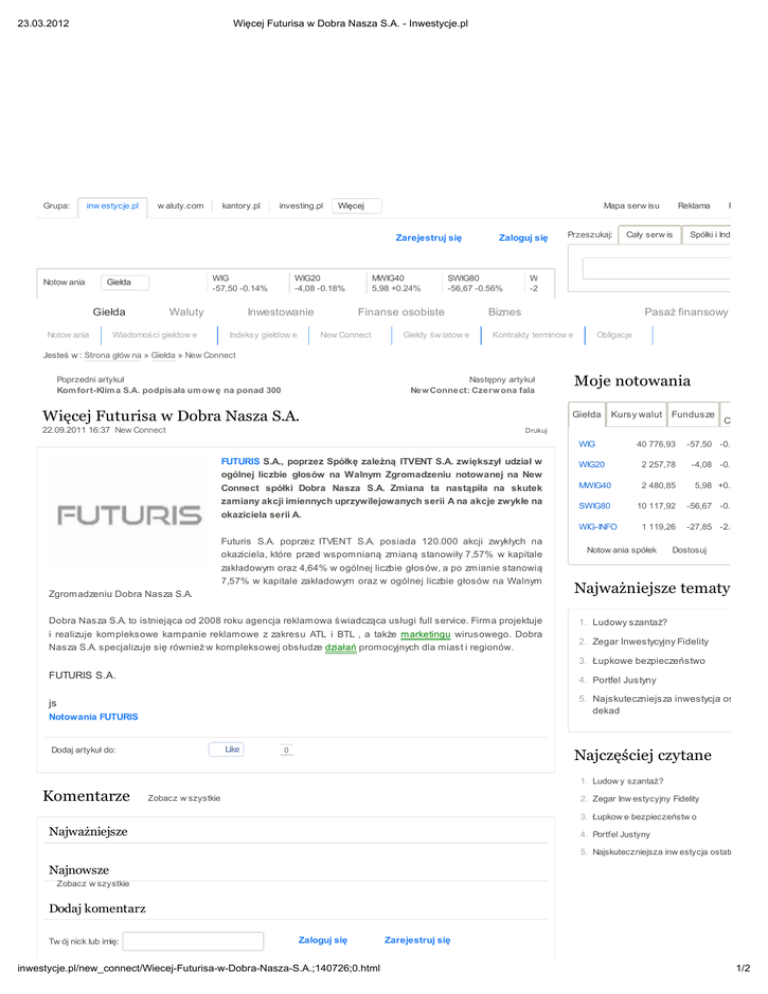 23.03.2012 Grupa: Wi cej Futurisa w Dobra Nasza S.A. - Inwestycje.pl inw estycje.pl w aluty.com kantory.pl investing.pl Więcej Mapa serw isu Zarejestruj się Notow ania WIG -57,50 -0.14% Giełda Giełda Notow ania Waluty Wiadomości giełdow e WIG20 -4,08 -0.18% Inwestowanie Indeksy giełdow e MWIG40 5,98 +0.24% SWIG80 -56,67 -0.56% Finanse osobiste New Connect Zaloguj się Giełdy św iatow e Przeszukaj: Reklama Cały serw is RSS Spółki i Indeksy WIG-INFO -27,85 Biznes Pasa finansowy Kontrakty terminow e Obligacje Jesteś w : Strona głów na » Giełda » New Connect Poprzedni artykuł Kom fort-Klim a S.A. podpisała um ow ę na ponad 300 tys. zł Następny artykuł New Connect: Czerw ona fala Więcej Futurisa w Dobra Nasza S.A. Moje notowania Giełda 22.09.2011 16:37 New Connect Kursy walut Fundusze Connect Drukuj WIG FUTURIS S.A., poprzez Spółkę zale ną ITVENT S.A. zwiększył udział w ogólnej liczbie głosów na Walnym Zgromadzeniu notowanej na New Connect spółki Dobra Nasza S.A. Zmiana ta nastąpiła na skutek zamiany akcji imiennych uprzywilejowanych serii A na akcje zwykłe na okaziciela serii A. 40 776,93 -57,50 -0.14% WIG20 2 257,78 -4,08 -0.18% MWIG40 2 480,85 5,98 +0.24% SWIG80 10 117,92 -56,67 -0.56% 1 119,26 -27,85 -2.43% WIG-INFO Futuris S.A. poprzez ITVENT S.A. posiada 120.000 akcji zwykłych na okaziciela, które przed wspomnianą zmianą stanowiły 7,57% w kapitale zakładowym oraz 4,64% w ogólnej liczbie głosów, a po zmianie stanowią 7,57% w kapitale zakładowym oraz w ogólnej liczbie głosów na Walnym Zgromadzeniu Dobra Nasza S.A. Dobra Nasza S.A. to istniejąca od 2008 roku agencja reklamowa świadcząca usługi full service. Firma projektuje i realizuje kompleksowe kampanie reklamowe z zakresu ATL i BTL , a tak e marketingu wirusowego. Dobra Nasza S.A. specjalizuje się równie w kompleksowej obsłudze działań promocyjnych dla miast i regionów. Notow ania spółek Dostosuj Najwa niejsze tematy 1. Ludowy szanta ? 2. Zegar Inwestycyjny Fidelity 3. Łupkowe bezpieczeństwo FUTURIS S.A. 4. Portfel Justyny 5. Najskuteczniejsza inwestycja ostatnich t dekad js Notowania FUTURIS Li e Dodaj artykuł do: Najczęściej czytane 1. Ludow y szanta ? Komentarze Zobacz w szystkie 2. Zegar Inw estycyjny Fidelity 3. Łupkow e bezpieczeństw o Najwa niejsze 4. Portfel Justyny 5. Najskuteczniejsza inw estycja ostatnich trzec Najnowsze Zobacz w szystkie Dodaj komentarz Tw ój nick lub imię: Zaloguj się inwestycje.pl/new_connect/Wiecej-Futurisa-w-Dobra-Nasza-S.A.;140726;0.html Zarejestruj się 1/2