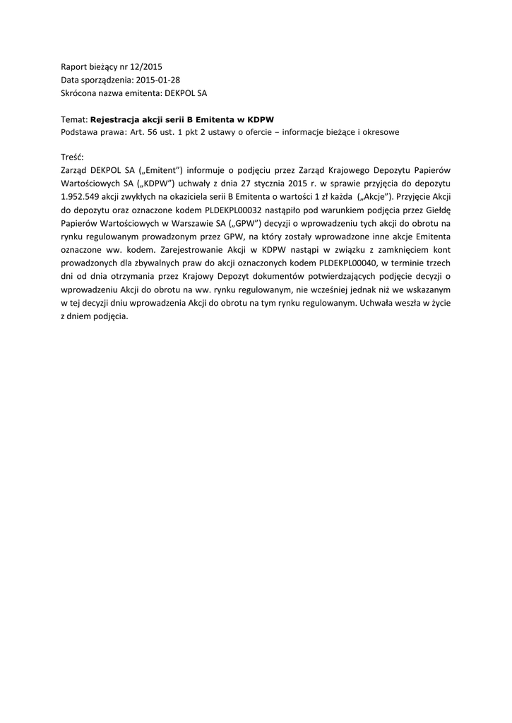 Raport bieżący nr 12/2015 Data sporządzenia: 2015-01-28 Skrócona nazwa emitenta: DEKPOL SA Temat: Rejestracja akcji serii B Emitenta w KDPW Podstawa prawa: Art. 56 ust. 1 pkt 2 ustawy o ofercie – informacje bieżące i okresowe Treść: Zarząd DEKPOL SA („Emitent”) informuje o podjęciu przez Zarząd Krajowego Depozytu Papierów Wartościowych SA („KDPW”) uchwały z dnia 27 stycznia 2015 r. w sprawie przyjęcia do depozytu 1.952.549 akcji zwykłych na okaziciela serii B Emitenta o wartości 1 zł każda („Akcje”). Przyjęcie Akcji do depozytu oraz oznaczone kodem PLDEKPL00032 nastąpiło pod warunkiem podjęcia przez Giełdę Papierów Wartościowych w Warszawie SA („GPW”) decyzji o wprowadzeniu tych akcji do obrotu na rynku regulowanym prowadzonym przez GPW, na który zostały wprowadzone inne akcje Emitenta oznaczone ww. kodem. Zarejestrowanie Akcji w KDPW nastąpi w związku z zamknięciem kont prowadzonych dla zbywalnych praw do akcji oznaczonych kodem PLDEKPL00040, w terminie trzech dni od dnia otrzymania przez Krajowy Depozyt dokumentów potwierdzających podjęcie decyzji o wprowadzeniu Akcji do obrotu na ww. rynku regulowanym, nie wcześniej jednak niż we wskazanym w tej decyzji dniu wprowadzenia Akcji do obrotu na tym rynku regulowanym. Uchwała weszła w życie z dniem podjęcia.