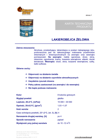 strona 1 KARTA TECHNICZNA PRODUKTU LAKIEROBEJCA ELOWA Zakres stosowania: Akrylowa, prze wituj ca, lakierobejca w postaci niekapi cego elu, przeznaczona jest do dekoracyjnego malowania przedmiotów drewnianych i drewnopochodnych na zewn trz oraz wewn trz pomieszcze . Na zewn trz: meble ogrodowe, drzwi, okna, okiennice, ogrodzenia, bramy, boazerie zewn trzne, altanki, domki letniskowe. Wewn trz: drzwi, okna, boazerie wewn trzne, sufity, belki sufitowe. G ówne cechy: Odporno na dzia anie wiat a Odporno na dzia anie czynników atmosferycznych Uwydatnia rysunek drewna Pe ny zakres zastosowa (na zewn trz i do wewn trz) Nie kapie podczas malowania Kolor 8 kolorów gotowych Wygl d pow oki g adka Lepko , 20 2 C, [mPas] 15 000 ÷ 30 000 G sto , 20 0,5 C, [g/cm3] 1,03 ÷1,07 Ilo warstw 2 Czas schni cia pow oki, 23 2 C, (st. 3), [h] 4 Nanoszenie drugiej warstwy, [h] po 4 Sposób nanoszenia p dzel Wydajno do 10 -12 m2/l przy jednej warstwie SIGMAKALON DECO POLSKA Ul. Kwidzy ska 8, 51 416 Wroc aw Tel. (071) 78-80-700 Bezp atna infolinia 0800 11 33 11 www.drewnochron.pl strona 2 Rozcie czalnik woda Sposób u ycia 1.Przygotowanie pod o a Pod o e przeznaczone do malowania nale y wyrówna , przeszlifowa i odpyli . Powierzchnia przeznaczona do malowania powinna by czysta i sucha. Przedmioty wcze niej niemalowane, eksploatowane na zewn trz pomieszcze nale y zaimpregnowa DREWNOCHRONEM Impregnatem bezbarwnym. Nie nale y malowa na powierzchniach zaimpregnowanymi preparatami solnymi. Przy renowacji wymalowa , stare pow oki nale y zmatowi papierem ciernym i odpyli . Pow oki sp kane i uszcz ce si nale y przed malowaniem usun . 2. Malowanie Malowa za pomoc p dzla (w osie mieszane) bez rozcie czenia. Zaleca si nak adanie 2 warstw. Pomi dzy warstwami zachowa przerw 2-3 h. Pe ne wyschni cie pow oki uzyskuje si po 4 h. Dla uzyskania lepszego efektu dekoracyjnego poprzedni warstw nale y przeszlifowa drobnoziarnistym papierem ciernym nr 180 i usun py . 3. Dodatkowe informacje Malowa przy temperaturze pod o a od +10 °C do +25 °C. Niska temperatura i wysoka wilgotno wyd u aj czas schni cia. Narz dzia po zako czeniu prac malarskich nale y umy starannie pod bie wod . Produkt wodorozcie czalny, nieodporny na mróz. Przechowywa w temp. powy ej 0°C. c 4. Wskazówki BHP i PPO W trakcie prac malarskich i po ich zako czeniu pomieszczenia wietrzy do zaniku charakterystycznego zapachu Chroni przed dzie mi. W razie po kni cia niezw oczne zasi gnij porady lekarza poka opakowanie lub etykiet . Stosowa si do zalece podanych na opakowaniu. Szczegó owe informacje zamieszczone s w Karcie Charakterystyki. Norma: Atesty: PKWiU: Data wa no ci: ZN-SKDP-147 Posiada Atest Higieniczny PZH 24.30.11-50.00 36 miesi cy od daty produkcji Znak termometru 00C ÷ +300C SIGMAKALON DECO POLSKA Ul. Kwidzy ska 8, 51 416 Wroc aw Tel. (071) 78-80-700 Bezp atna infolinia 0800 11 33 11 www.drewnochron.pl strona 3 Limit zawarto ci LZO wg Dyrektywy 2004/42/WE dla tego produktu (kat.A/e): 150 g/l (2007)/130 g/l (2010). Produkt ten zawiera maks. 130 g/l VOC. Opakowanie handlowe SIGMAKALON DECO POLSKA Ul. Kwidzy ska 8, 51 416 Wroc aw Tel. (071) 78-80-700 Bezp atna infolinia 0800 11 33 11 0,8L www.drewnochron.pl