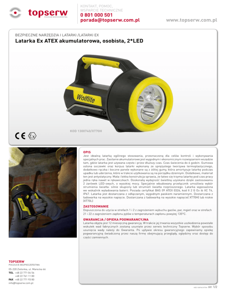 KONTAKT, POMOC, WSPARCIE TECHNICZNE 0 801 000 501 [email protected] www.topserw.com.pl BEZPIECZNE NARZĘDZIA I LATARKI /LATARKI EX Latarka Ex ATEX akumulatorowa, osobista, 2*LED KOD 1300740/XT70H OPIS Jest idealną latarką ogólnego stosowania, przeznaczoną dla celów kontroli i wykonywania specjalnych prac. Zasilanie akumulatorowe jest wygodnym i ekonomicznym rozwiązaniem wszędzie tam, gdzie latarka jest używana często i przez dłuższy czas. Czas świecenia do 6 godzin. Gumowa osłona soczewki oraz korpus latarki wykonany ze sprężystego tworzywa termoplastycznego, dodatkowo rączka i boczne panele wykonane są z żółtej gumy, która amortyzuje latarkę podczas upadku lub uderzenia, które w trakcie użytkowania są na porządku dziennym. Dodatkowo, materiał ten jest antystatyczny. Mała i lekka konstrukcja sprawia, że łatwo się trzyma latarkę pod czas pracy jedna ręka nawet w rękawiczkach. Doskonałą wydajność świetlną uzyskano dzięki zastosowaniu 2 żarówek LED-owych, o wysokiej mocy. Specjalnie wbudowany przełącznik umożliwia wybór strumienia światła: silnie skupiony lub strumień światła rozproszonego. Latarka wyposażona we wskaźnik wyładowania baterii. Posiada certyfikat BAS 09 ATEX 0326, kod II 2 G Ex ib IIC T4, IP67. Latarka jest dostarczana z odłączanym, wygodnym paskiem naramiennym. Dostarczana z ładowarka na wysokie napięcie. Dostarczana z ładowarką na wysokie napięcie( XT70H) lub niskie (XT70L) ZASTOSOWANIE Dopuszczona do użycia w strefach 1 i 2 z zagrożeniem wybuchu gazów, par, mgieł oraz w strefach 21 i 22 z zagrożeniem zapłonu pyłów o temperaturach zapłonu powyżej 135°C. GWARANCJA / OPIEKA POGWARANCYJNA Latarka objęta jest 12 miesięczną gwarancją. W trakcie jej trwania wszystkie uszkodzenia powstałe wskutek wad fabrycznych zostaną usunięte przez serwis techniczny Topserw. Wybór sposobu usunięcia wady należy do Gwaranta. Po upływie okresu gwarancyjnego zapewniamy opiekę pogwarancyjną świadczoną przez naszą firmę obejmującą przeglądy, oględziny oraz dostęp do części zamiennych. TOPSERW POCZUCIE BEZPIECZEŃSTWA 05-220 Zielonka, ul. Marecka 66 TEL +48 22 771 04 56 +48 22 761 11 80 FAX +48 22 771 93 80 [email protected] KOD 1300740 XT70H str. 1/2 KONTAKT, POMOC, WSPARCIE TECHNICZNE 0 801 000 501 [email protected] www.topserw.com.pl BEZPIECZNE NARZĘDZIA I LATARKI /LATARKI EX Latarka Ex ATEX akumulatorowa, osobista, 2*LED DANE TECHNICZNE Kod produktu Numer artykułu 1300740 1300741 XT70H XT70L Latarka Ex ATEX akumulatorowa, osobista Opis produktu 2* LED, ładowarka 230V Kod 2* LED, ładowarka 12/24 V II 2 G Ex ib IIC T4, IP67 Standard aparatu BAS 09 ATEX 0326 Rodzaj ochrony „ib” samoistne bezpieczeństwo Obszary klasyfikacji (gazy) Strefy 1 i 2 Klasyfikacja temperat. (gazy) Obszar klasyfikacji (pyły) Strefy 21 i 22 Maks. temp. powierzchni (pyły) 135°C Temperatura otoczenia Certyfikacja BAS 09 ATEX 0326 Obudowa Gumowa osłona soczewki oraz korpus latarki wykonany ze sprężystego tworzywa termoplastycznego, dodatkowo rączka i boczne panele wykonane są z żółtej gumy Soczewka wzmocnione szkło Typ strumienia Źródło światła Silnie skupiony lub strumień światła rozproszonego Typ LED o wysokiej mocy Ilość 2*white Światłość 200 + lm Wydajność 25000 + godz. Typ Źródło zasilania Żywotność Sygnalizacja wyczerpania akumulatora Akumulator litowo-jonowy Max. 500 cykli ładowania tak Pełna moc 6 godz. Obniżona moc 12 godz. Czas świecenia Stopień ochrony Waga (z akumulatorem) IP67 wg EN60529:1992 1,2 kg TOPSERW POCZUCIE BEZPIECZEŃSTWA 05-220 Zielonka, ul. Marecka 66 TEL +48 22 771 04 56 +48 22 761 11 80 FAX +48 22 771 93 80 [email protected] KOD 1300740 XT70H str. 2/2